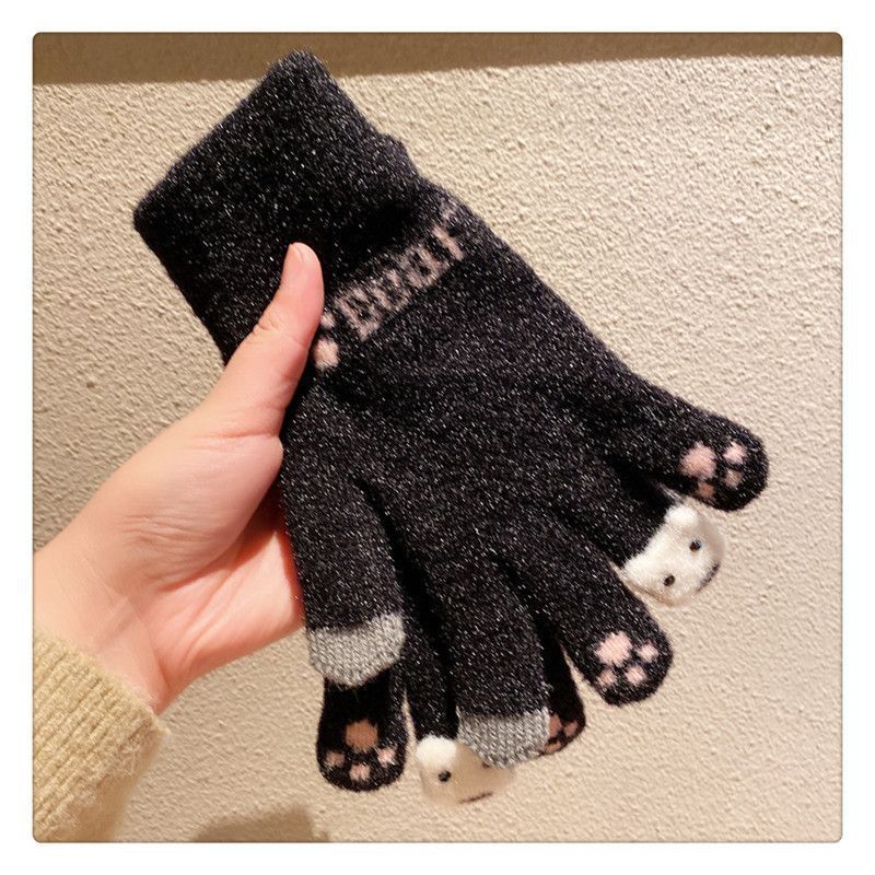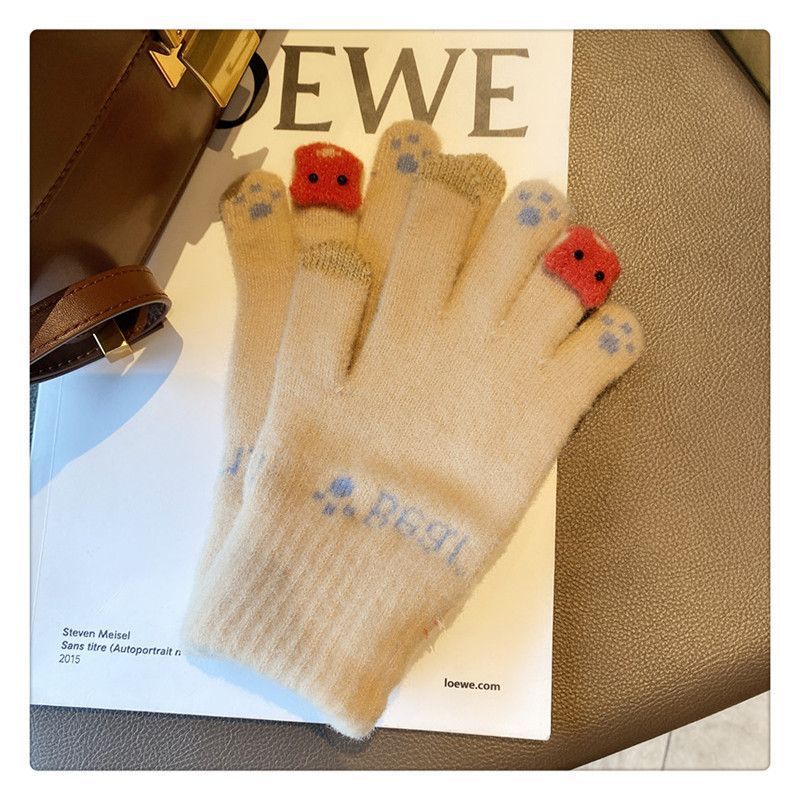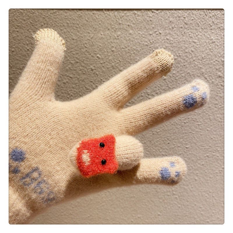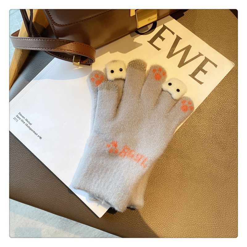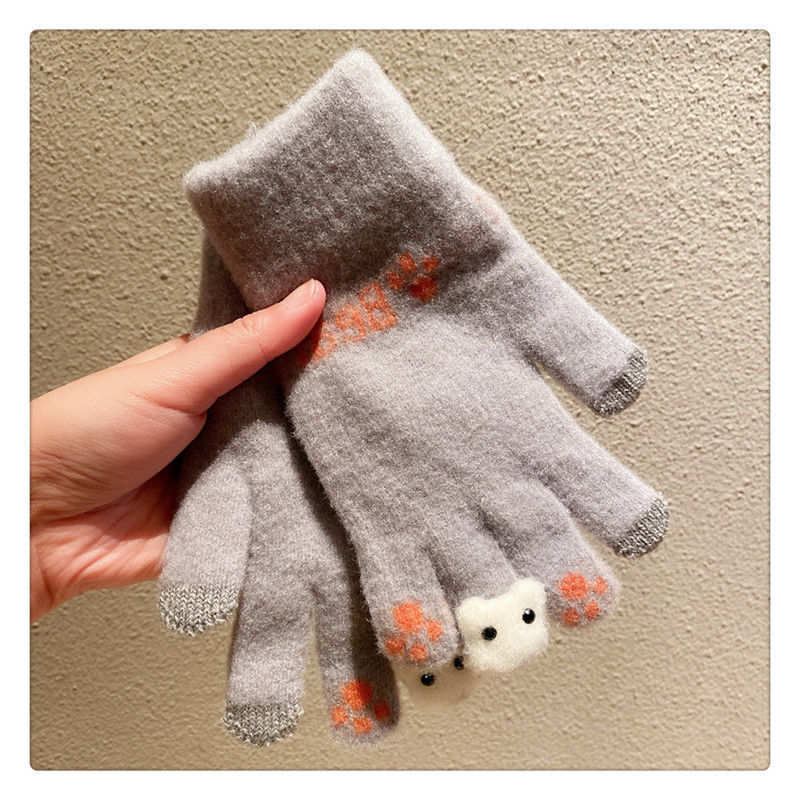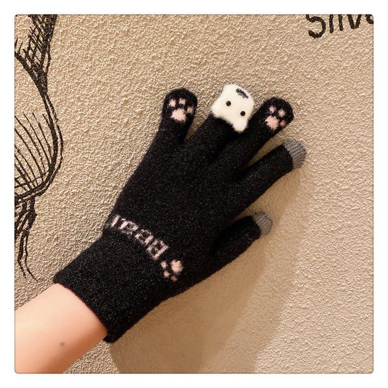 양모 장갑 겨울 여자의 일본식 따뜻한 귀여운 곰 다섯 손가락 터치 스크린 겨울 방한 사이클링 기모스토어 가기