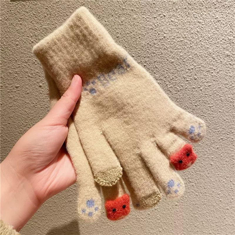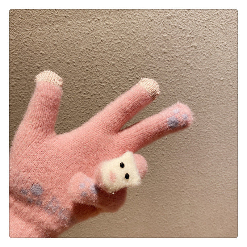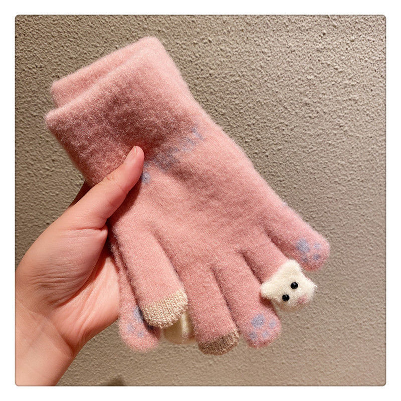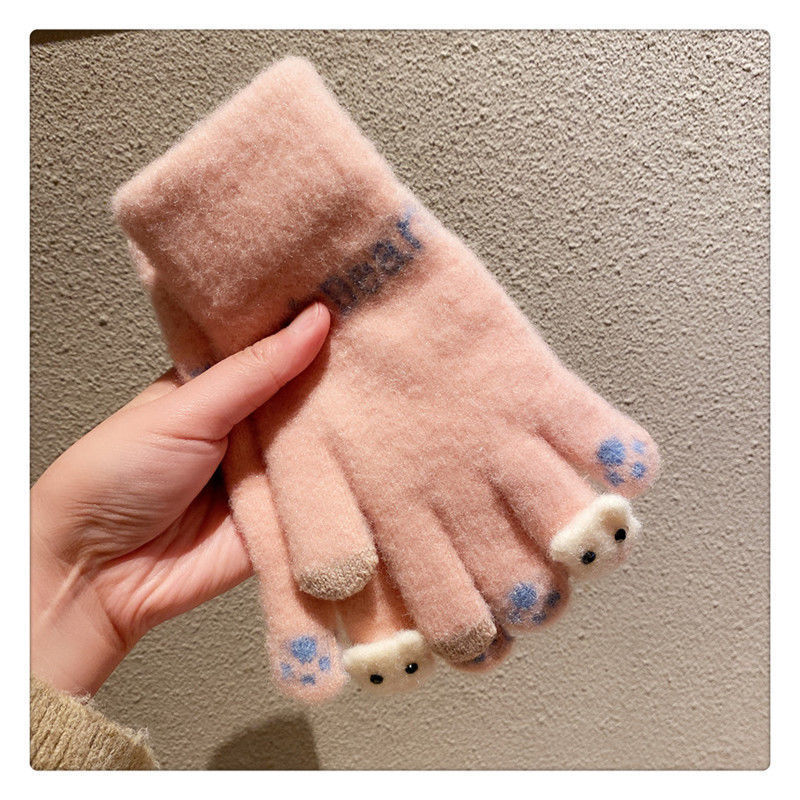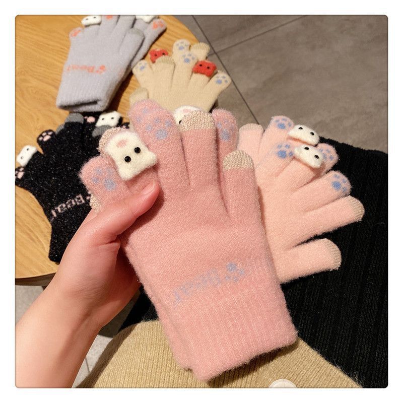 양모 장갑 겨울 여자의 일본식 따뜻한 귀여운 곰 다섯 손가락 터치 스크린 겨울 방한 사이클링 기모