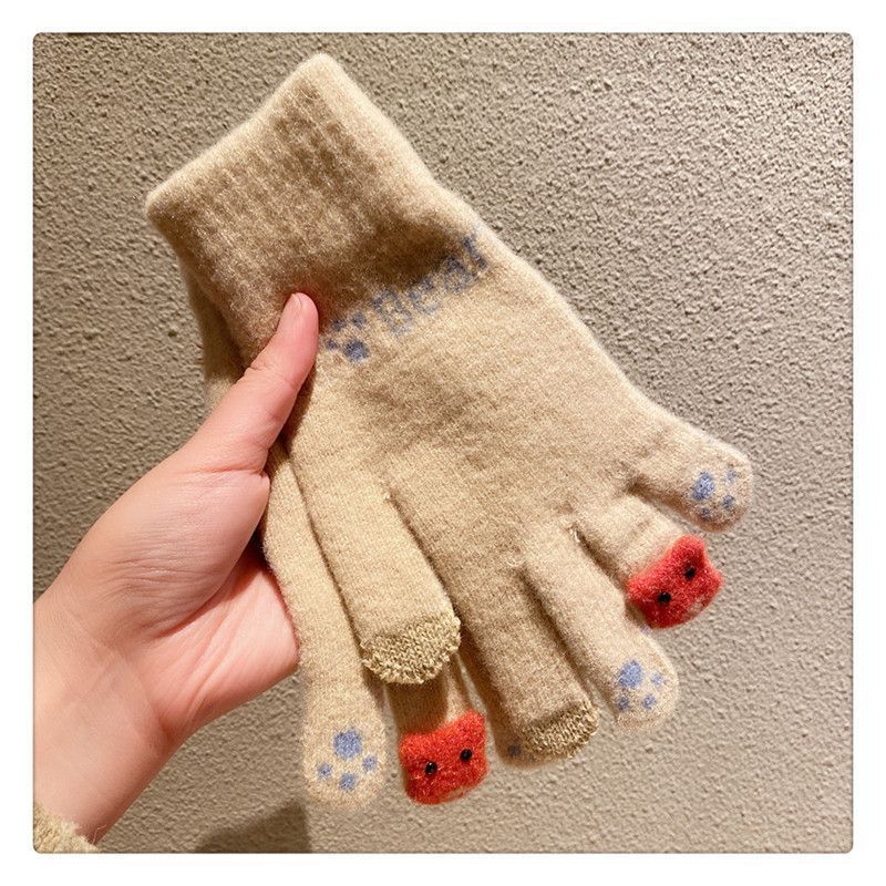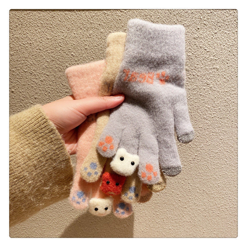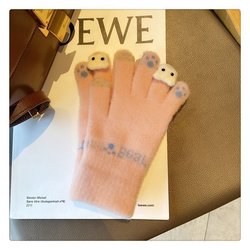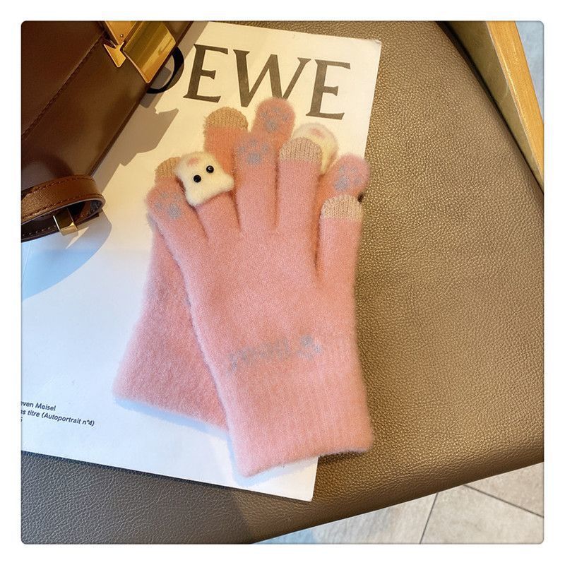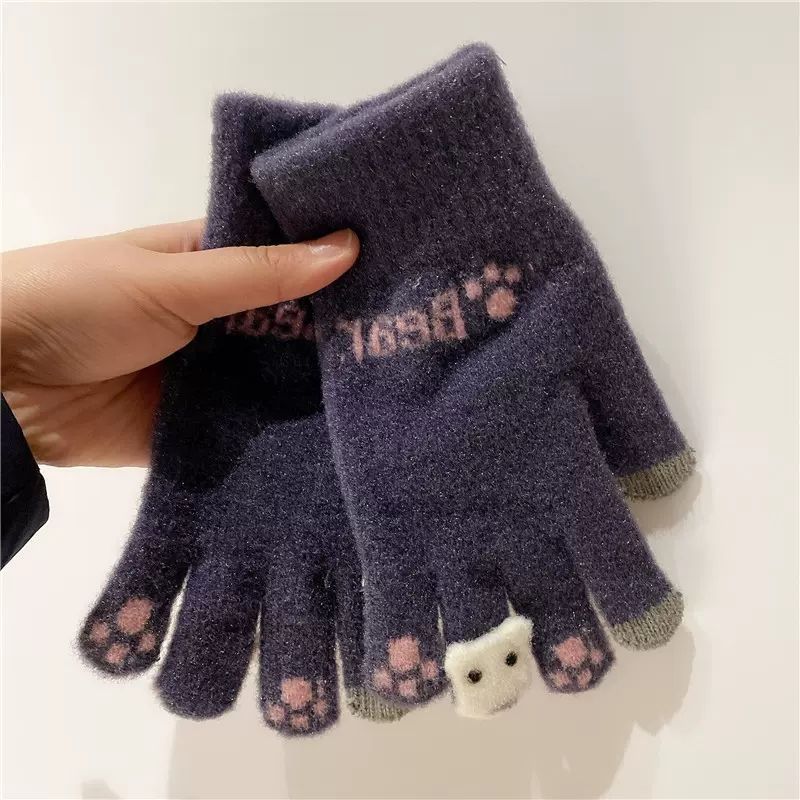 양모 장갑 겨울 여자의 일본식 따뜻한 귀여운 곰 다섯 손가락 터치 스크린 겨울 방한 사이클링 기모