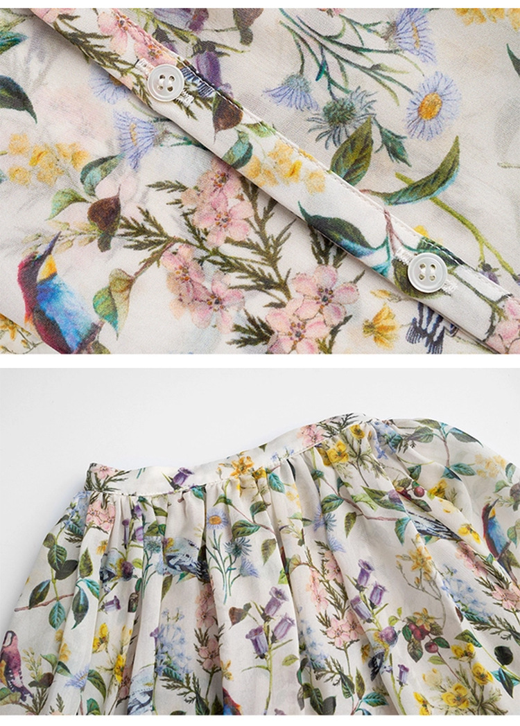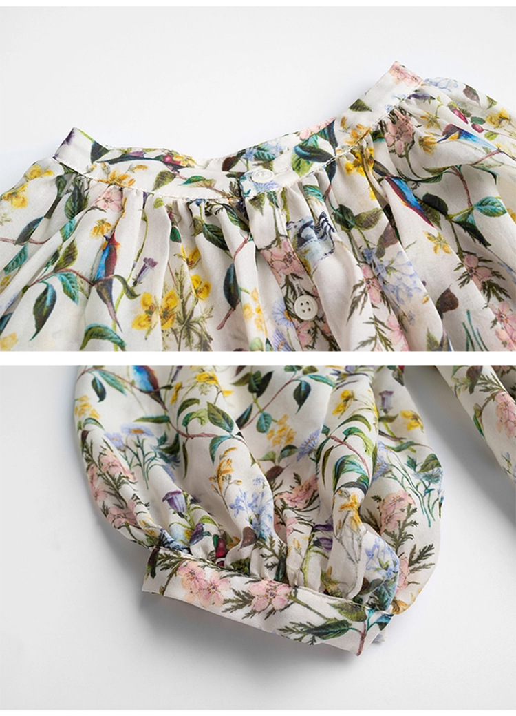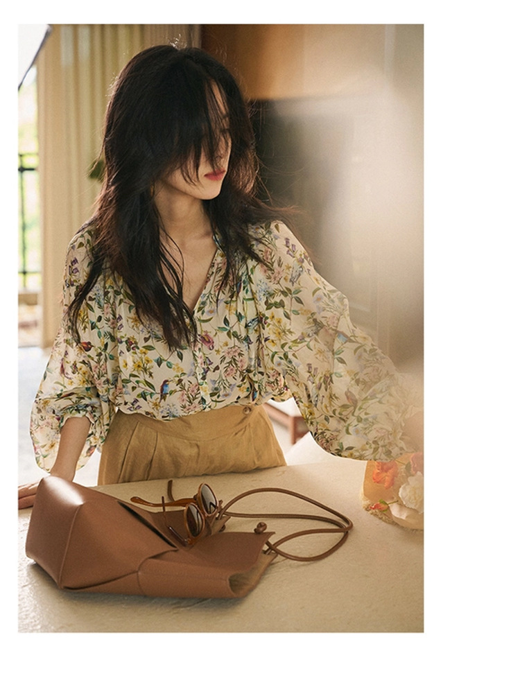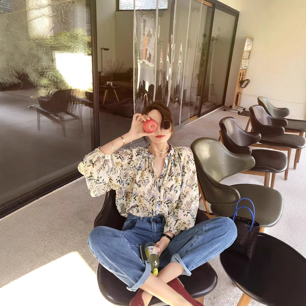 프랑스 스타일 시크 플로럴 쉬폰 탑 블라우스 느슨한 랜턴 슬리브 플라워 셔츠 여름 긴 소매 자외선 차단제 쉬폰 셔츠