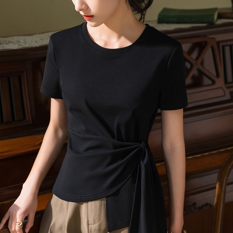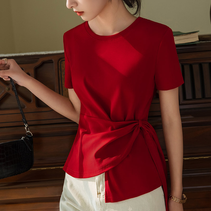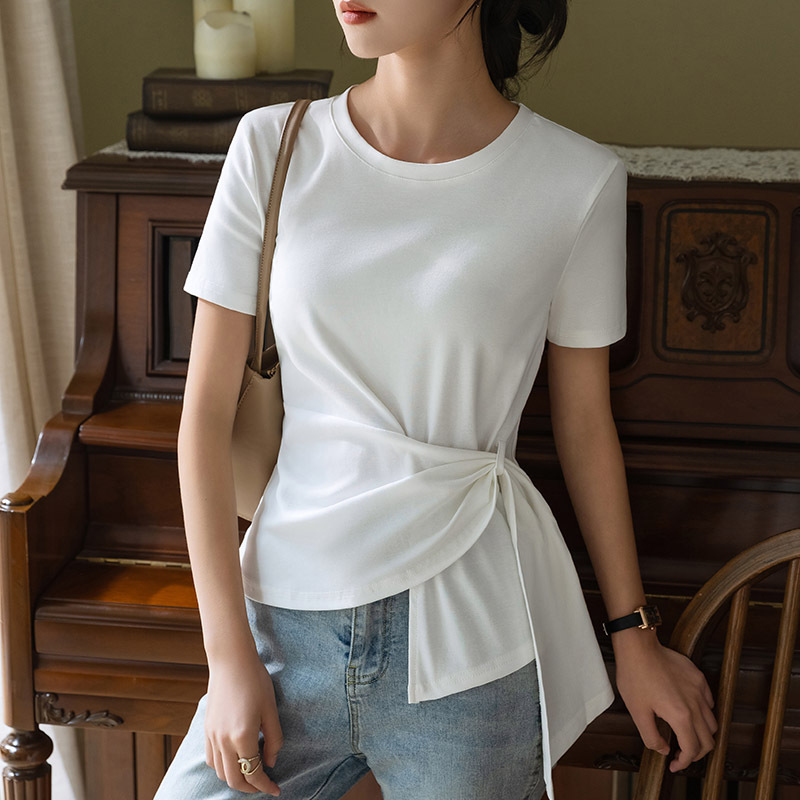 여성용 반팔 티셔츠 여름 2025 새로운 여성 솔리드 컬러 라운드 넥 스트레치 코튼 티셔츠 불규칙한 스트랩 허리 탑스토어 가기