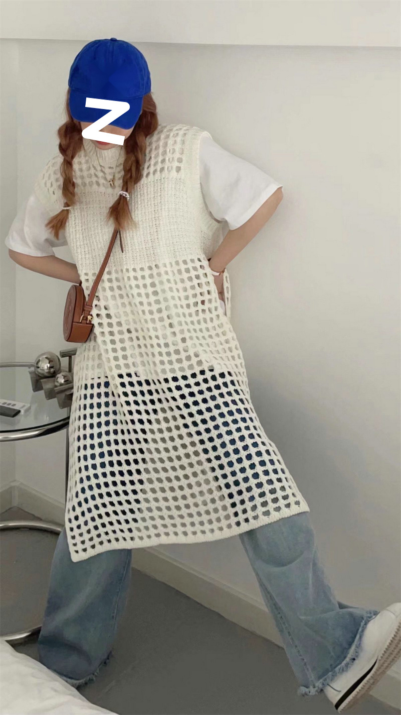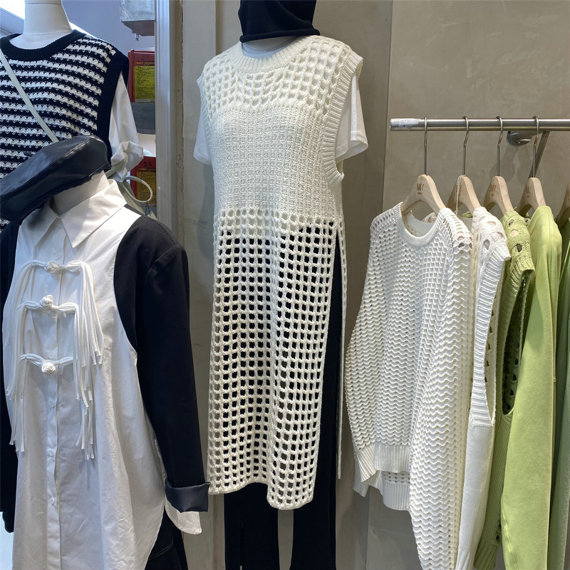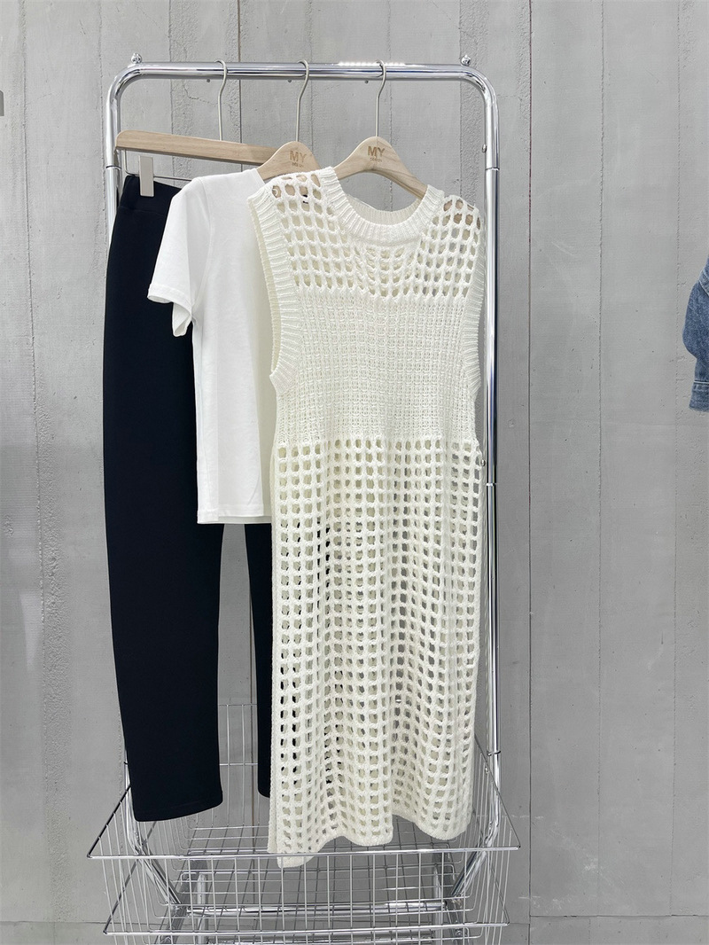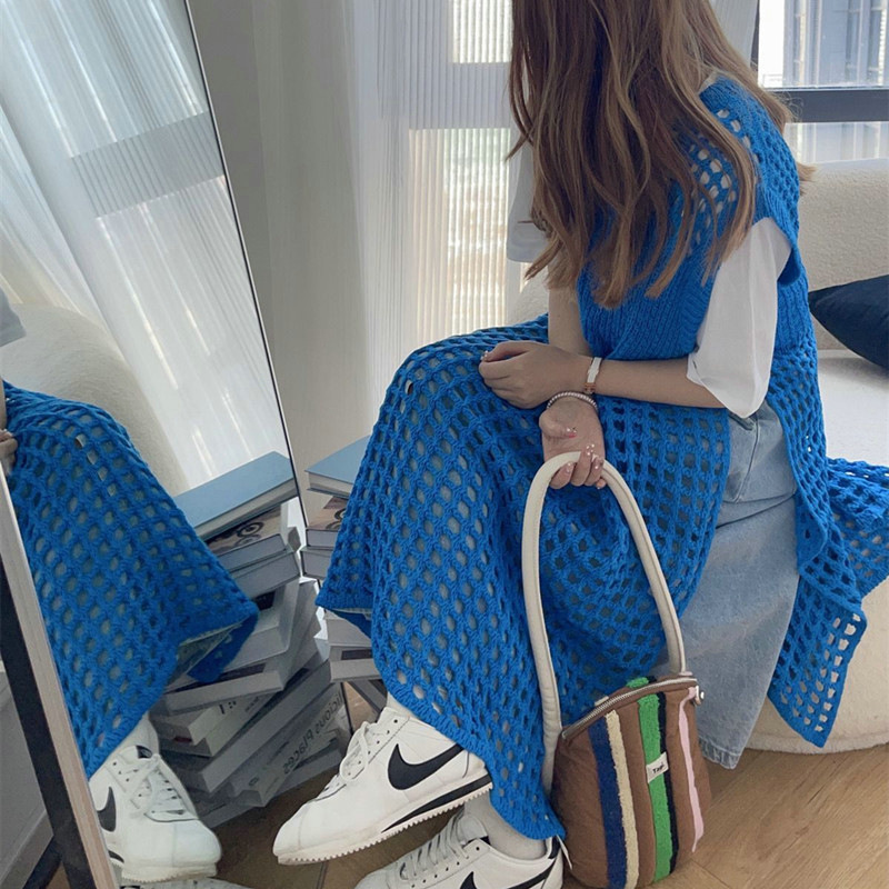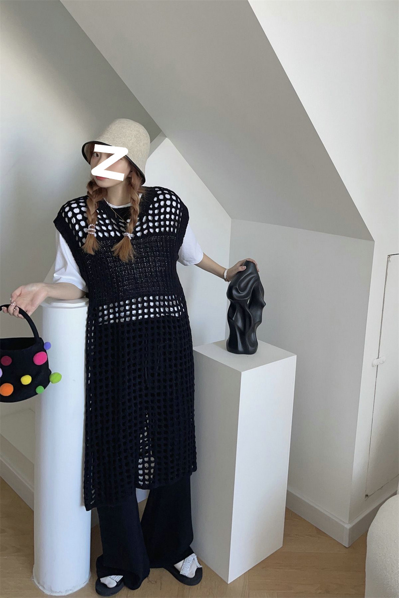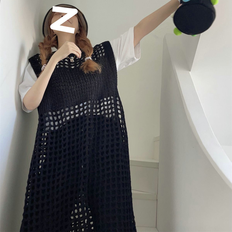 한국 디자인 중공 니트 메쉬 원피스 여성의 겹쳐진 분위기 조끼 스커트 봄과 여름 민소매 조끼 스커트스토어 가기