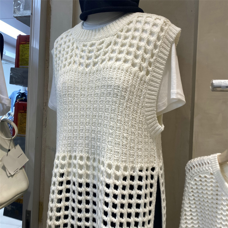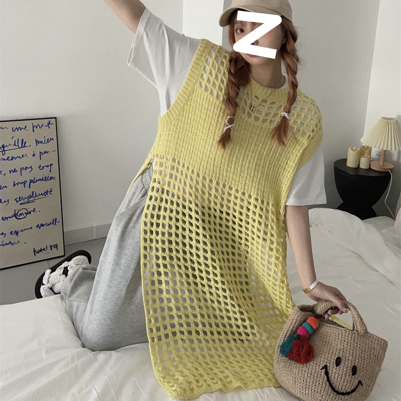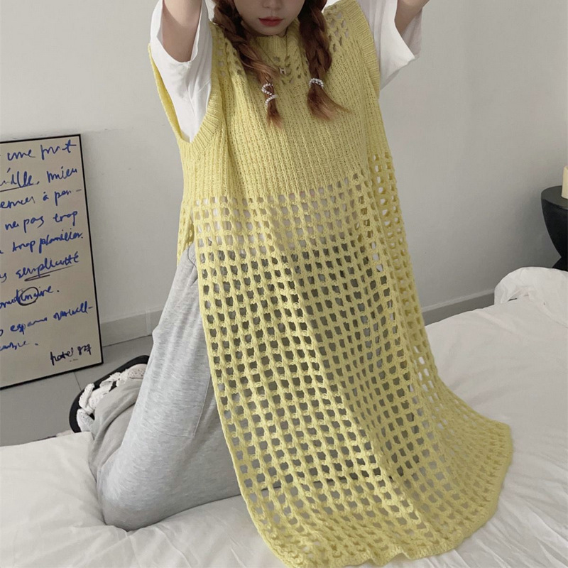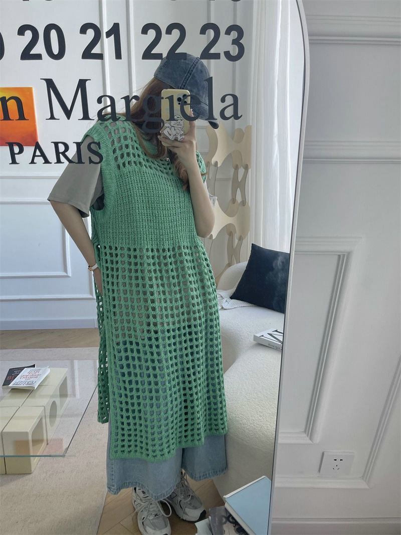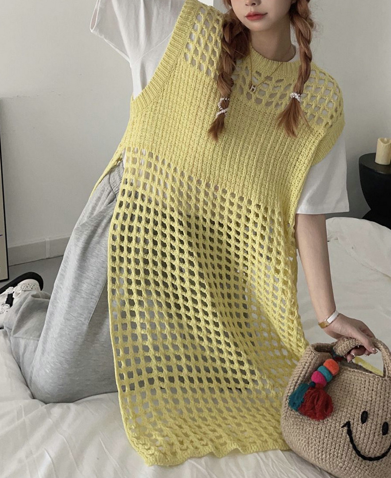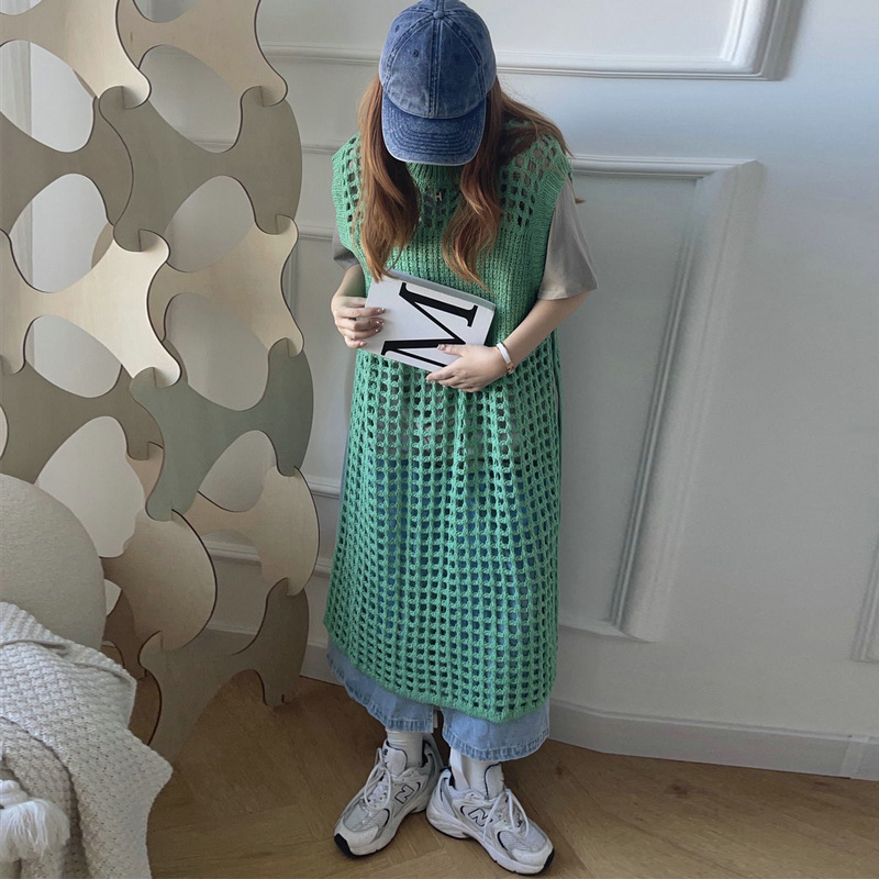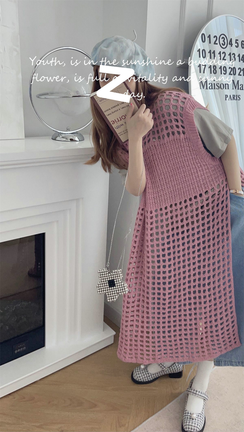 한국 디자인 중공 니트 메쉬 원피스 여성의 겹쳐진 분위기 조끼 스커트 봄과 여름 민소매 조끼 스커트스토어 가기