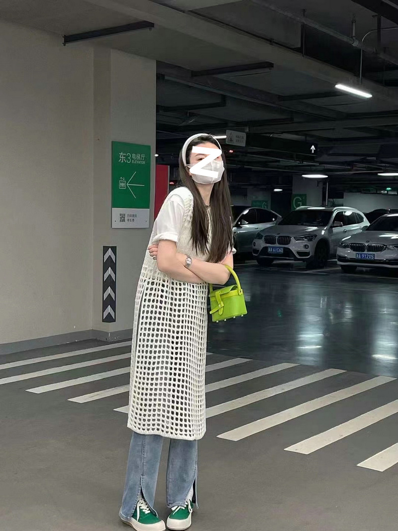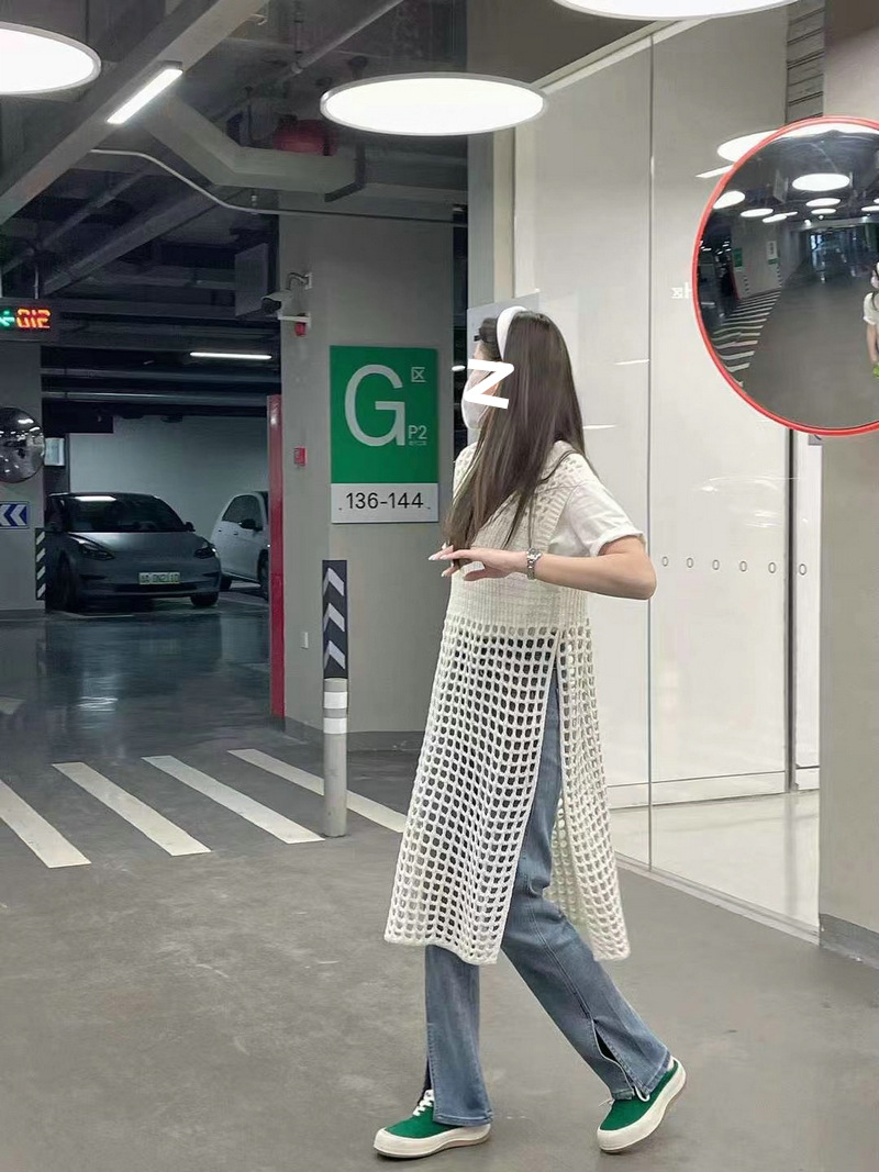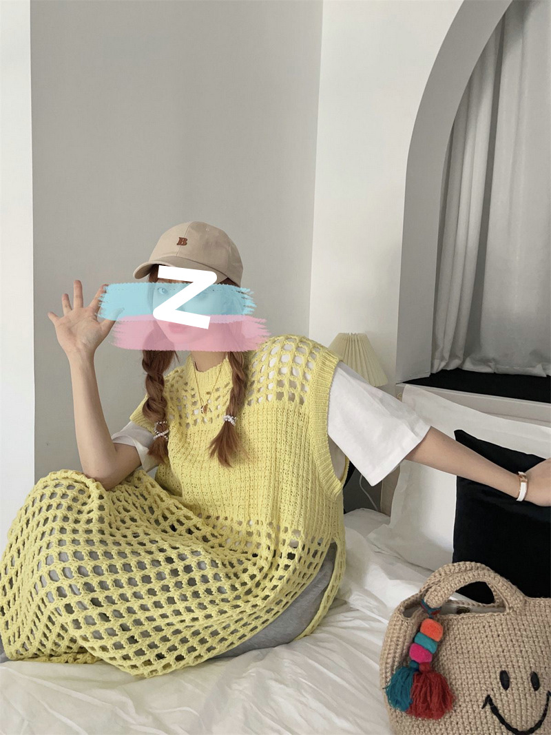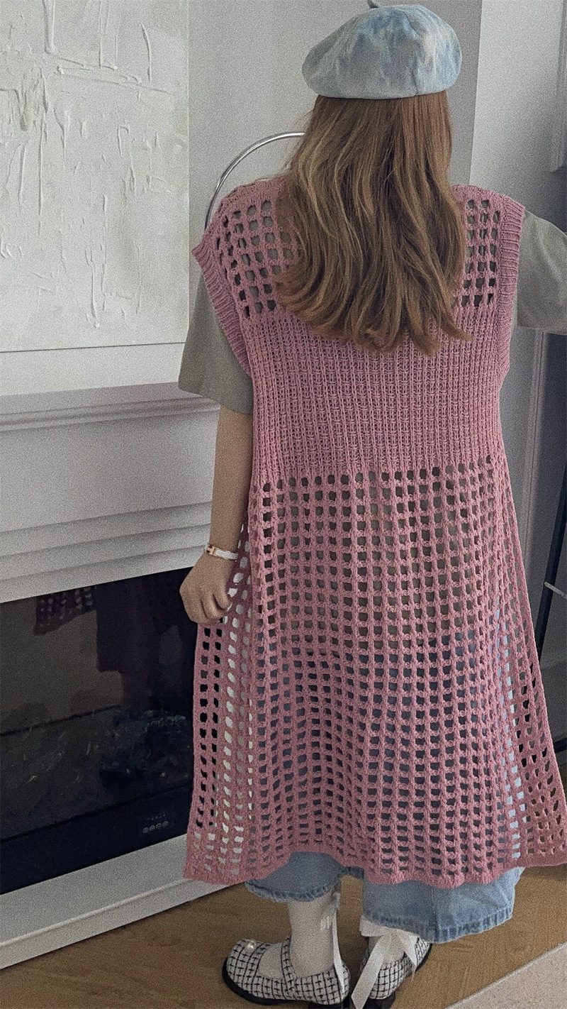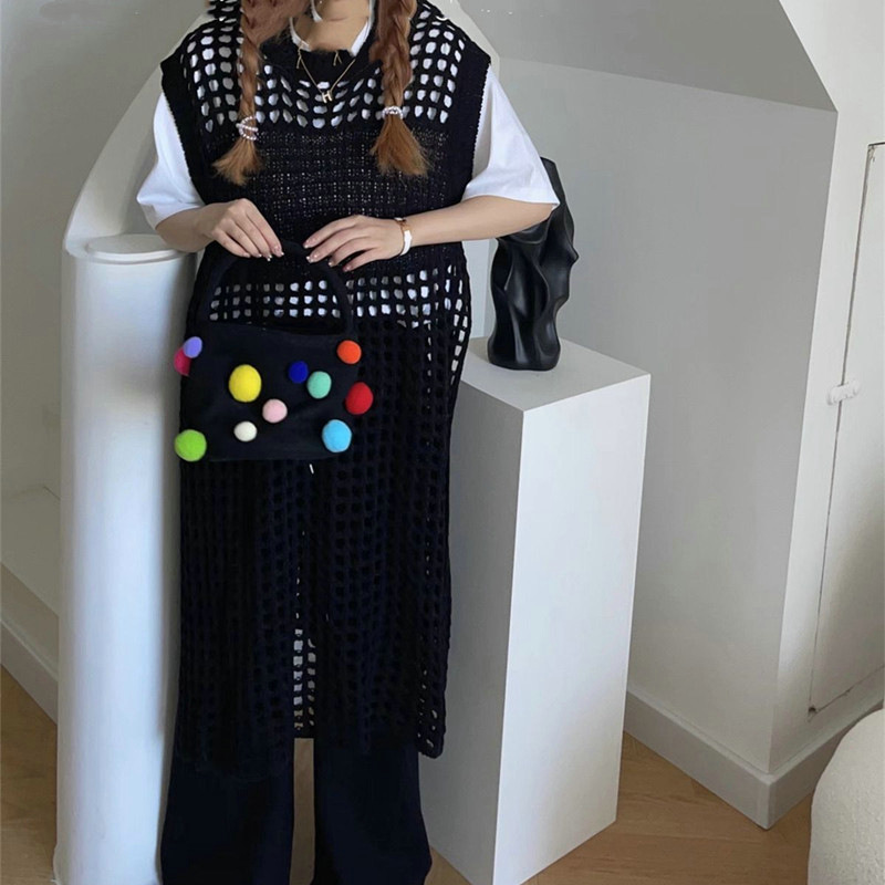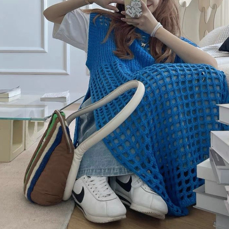 한국 디자인 중공 니트 메쉬 원피스 여성의 겹쳐진 분위기 조끼 스커트 봄과 여름 민소매 조끼 스커트스토어 가기