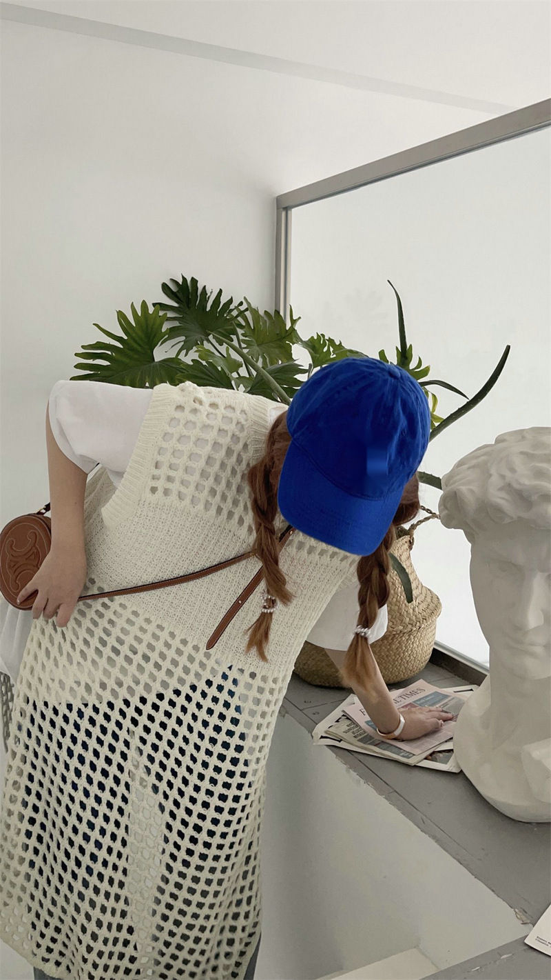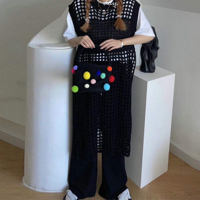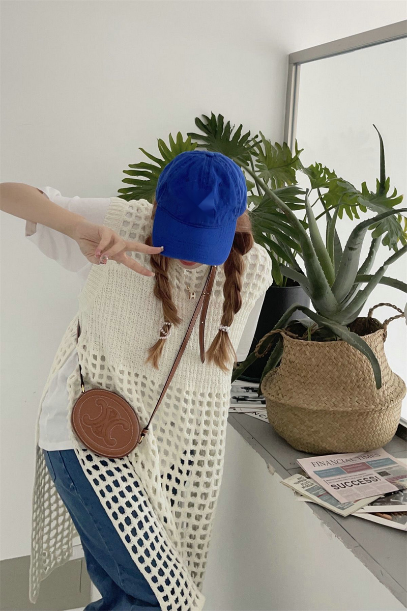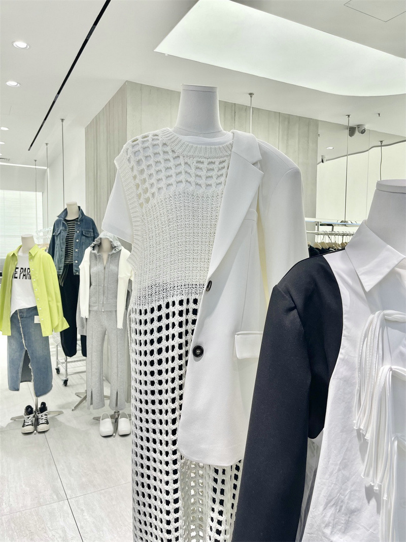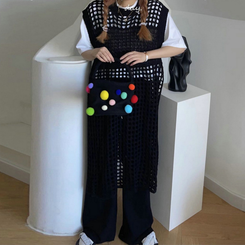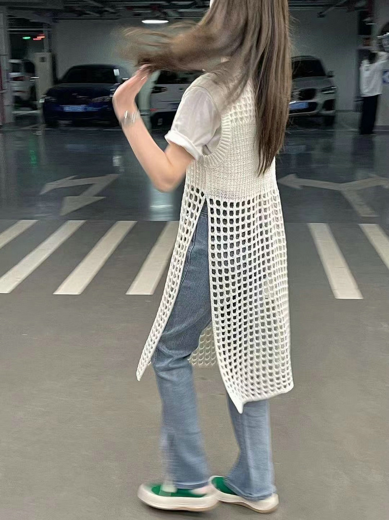 한국 디자인 중공 니트 메쉬 원피스 여성의 겹쳐진 분위기 조끼 스커트 봄과 여름 민소매 조끼 스커트스토어 가기