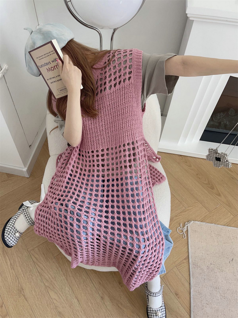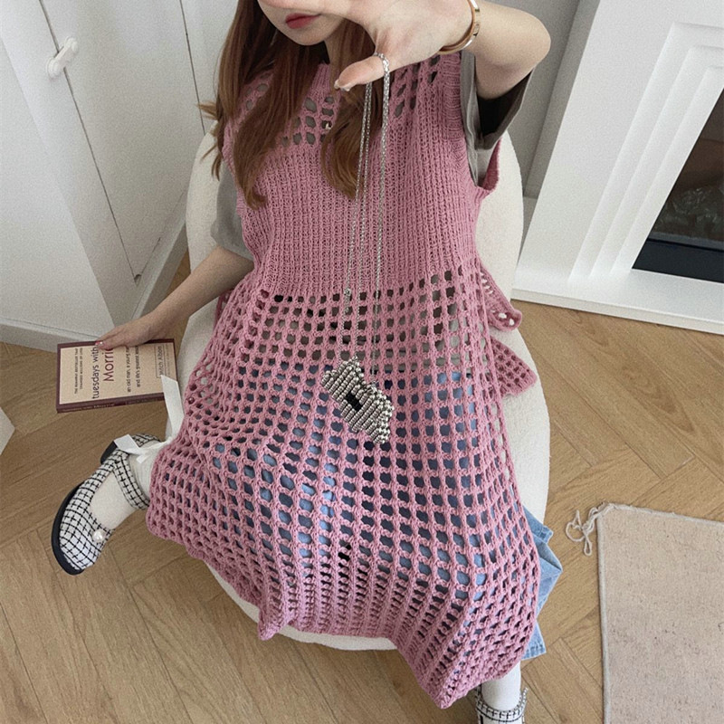 한국 디자인 중공 니트 메쉬 원피스 여성의 겹쳐진 분위기 조끼 스커트 봄과 여름 민소매 조끼 스커트