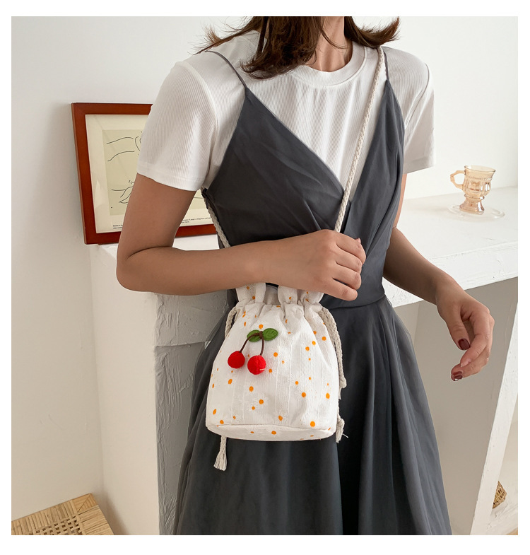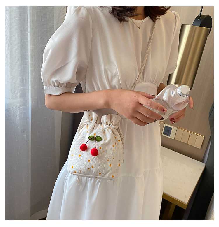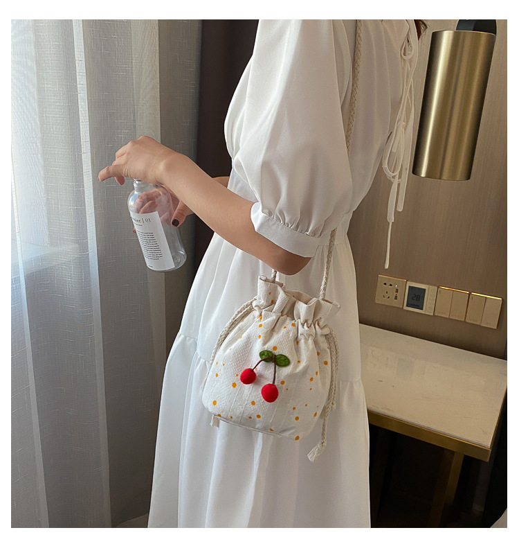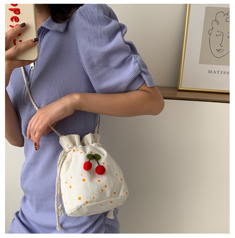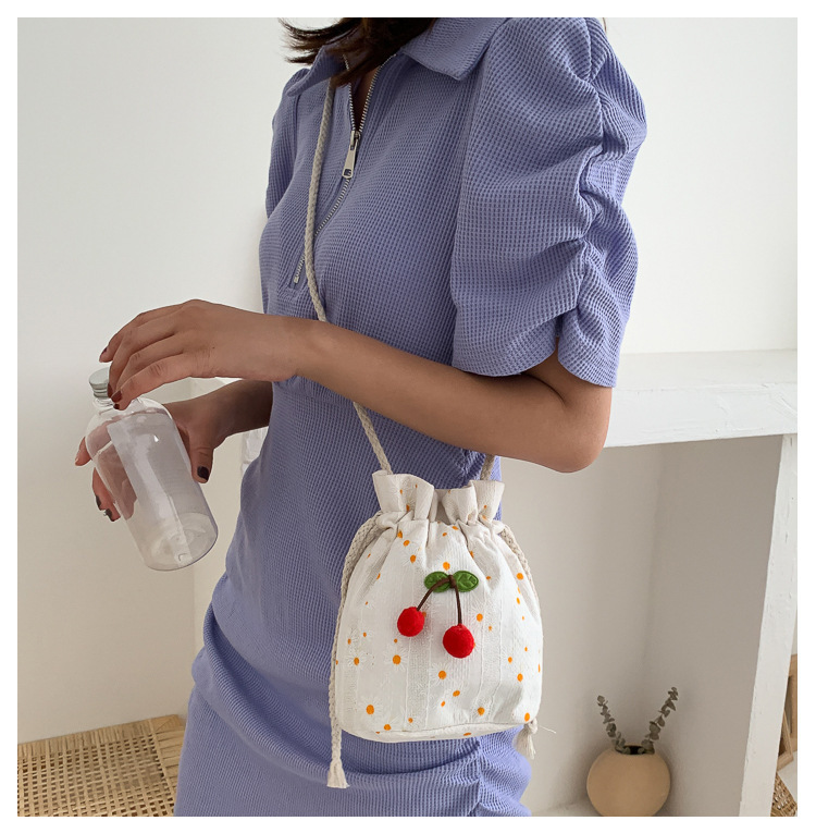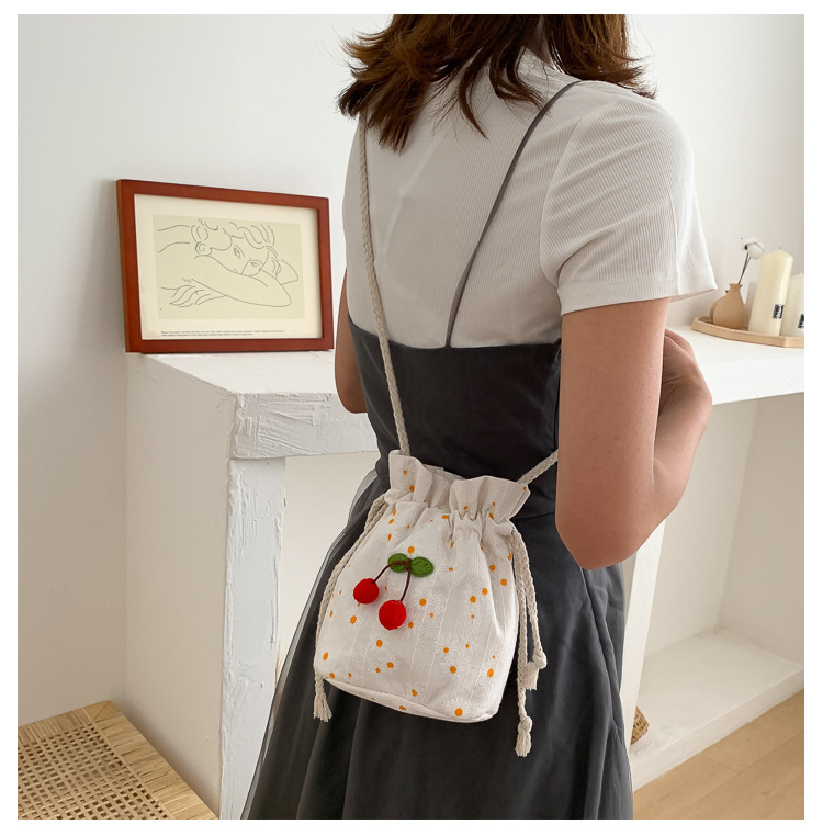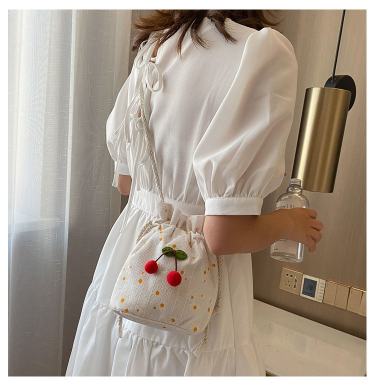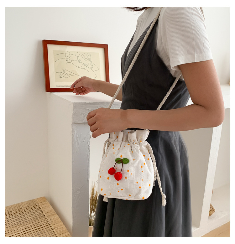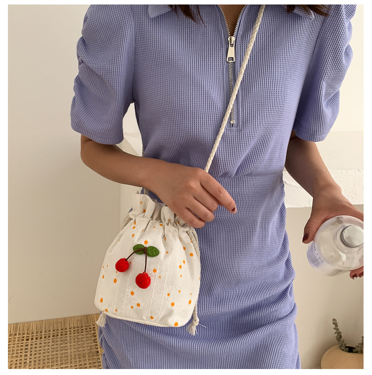 짠 체리 캔버스 버킷 작은 가방 여성 가방 23 여름 새로운 패션 한국 스타일 올 매치 숄더 메신저 백스토어 가기