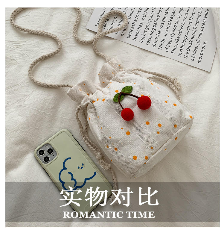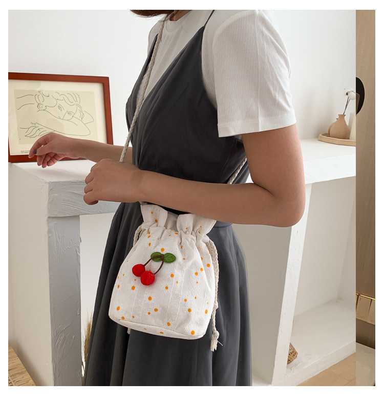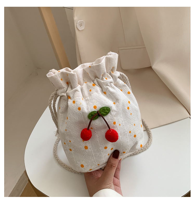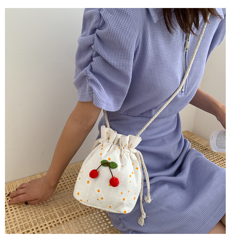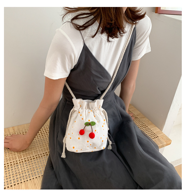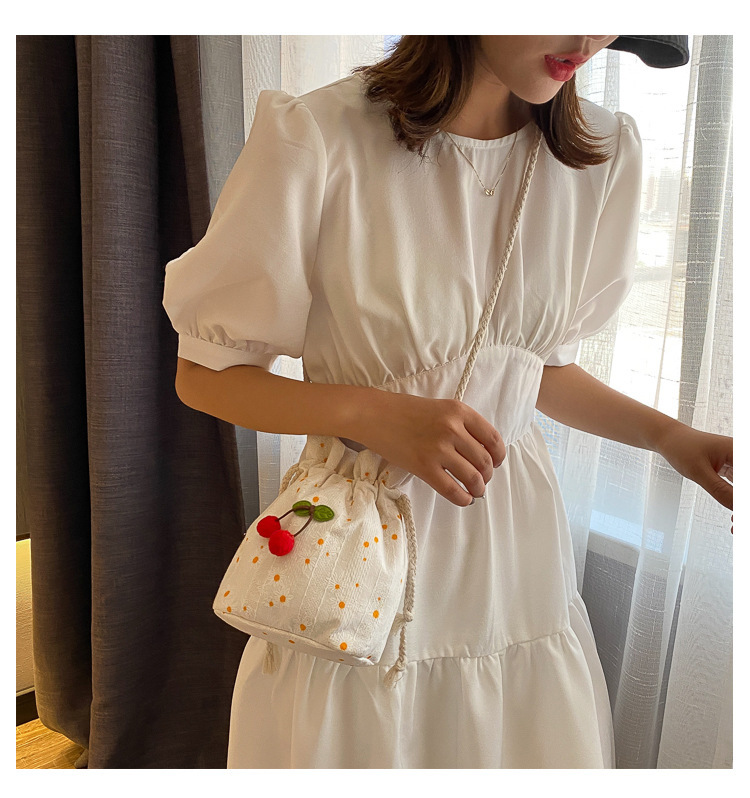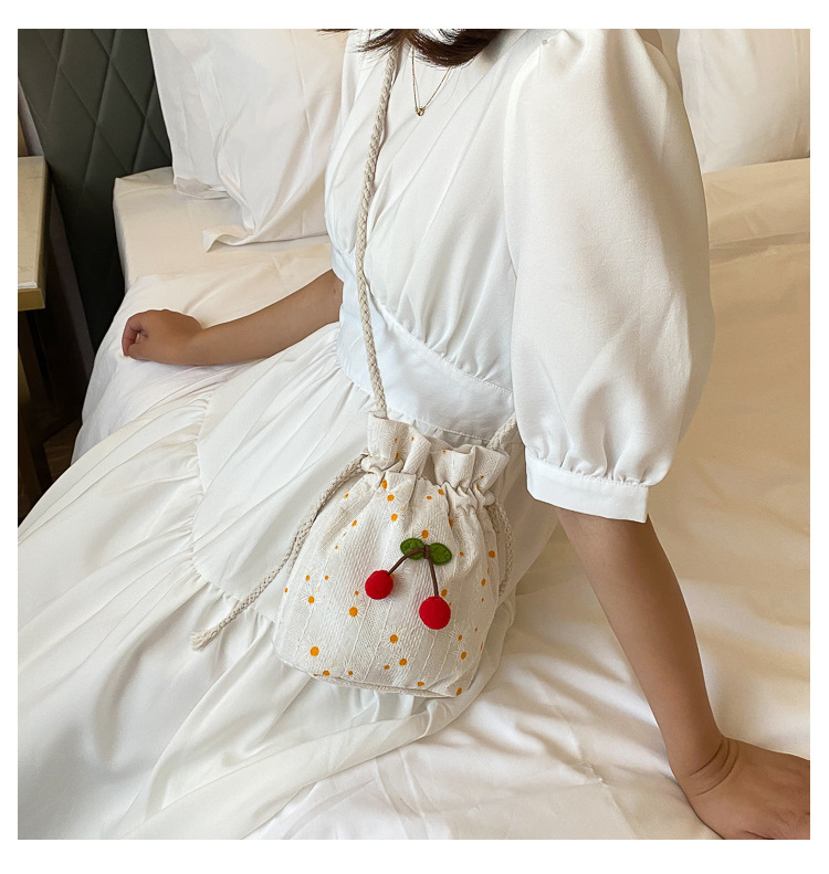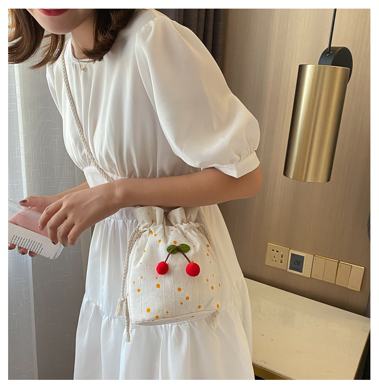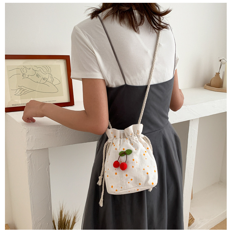 짠 체리 캔버스 버킷 작은 가방 여성 가방 23 여름 새로운 패션 한국 스타일 올 매치 숄더 메신저 백스토어 가기