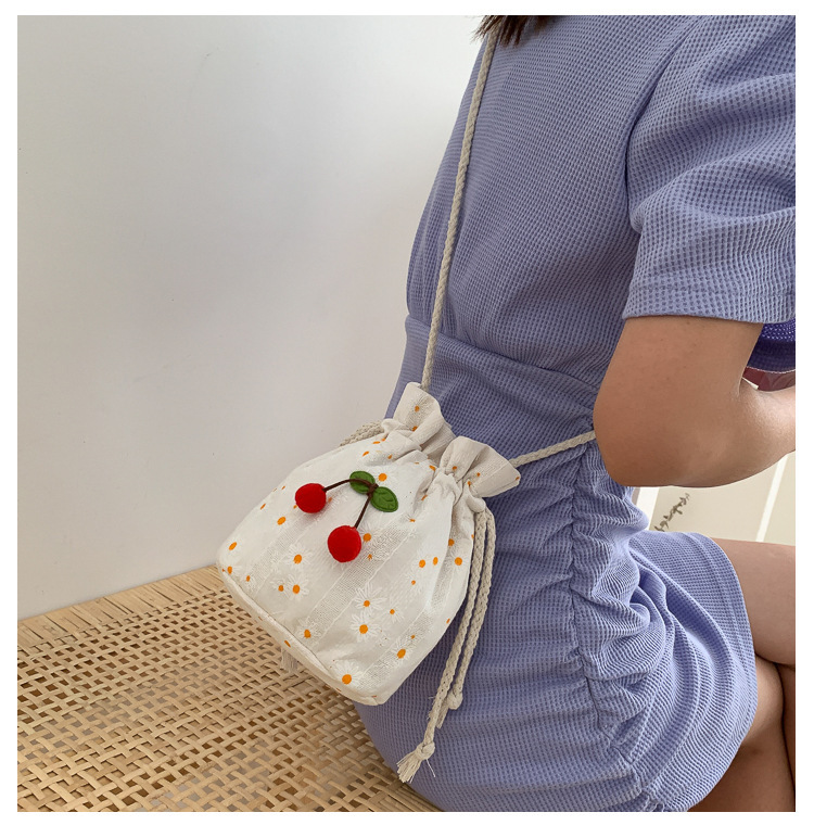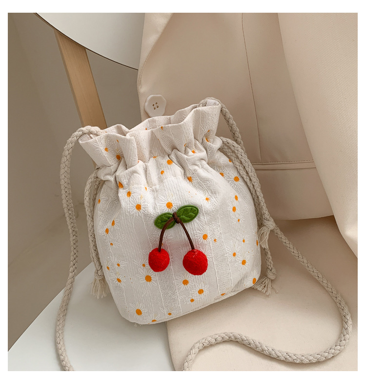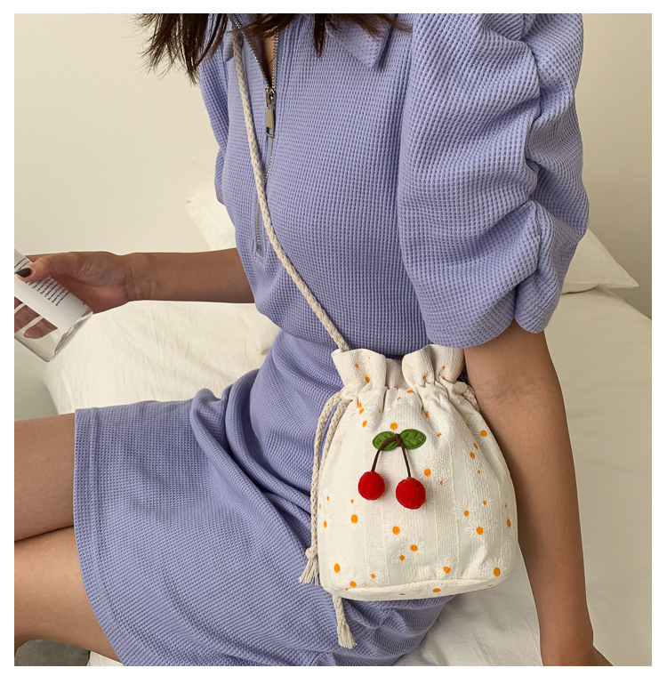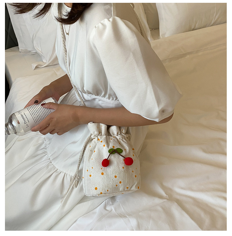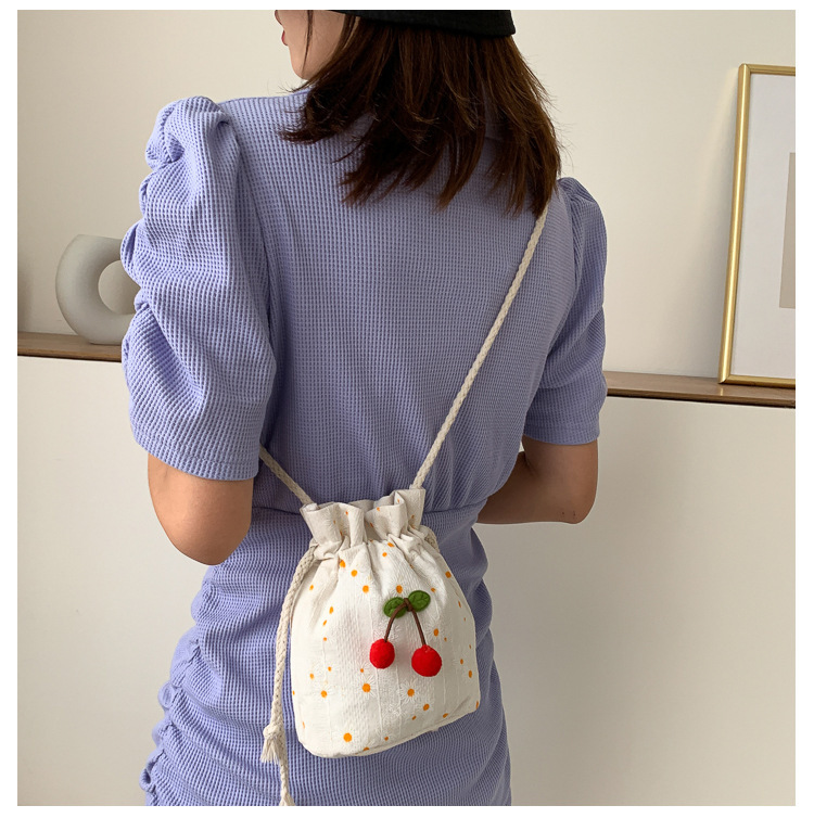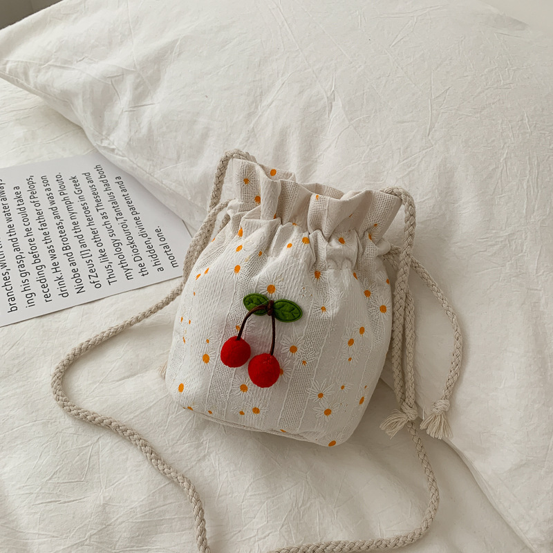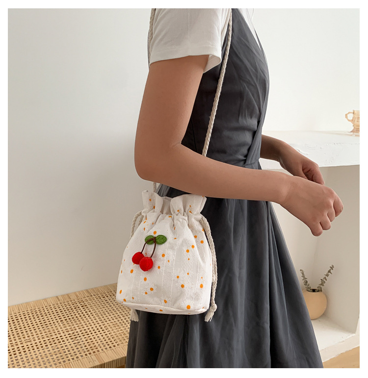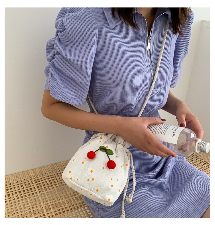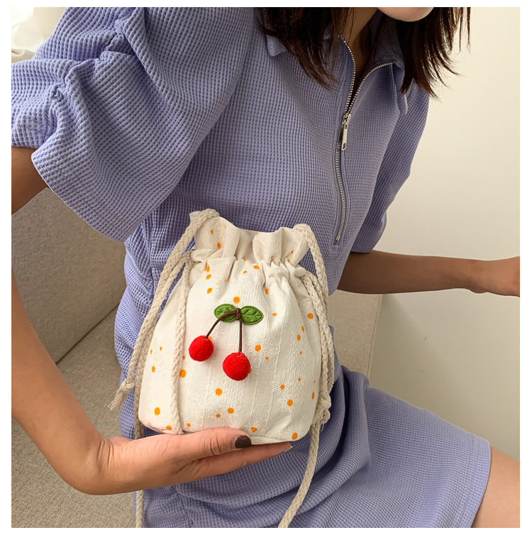 짠 체리 캔버스 버킷 작은 가방 여성 가방 23 여름 새로운 패션 한국 스타일 올 매치 숄더 메신저 백스토어 가기