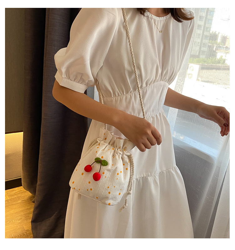 编织樱桃帆布水桶小包包女包2020夏季新款时尚韩版百搭单肩斜跨包
