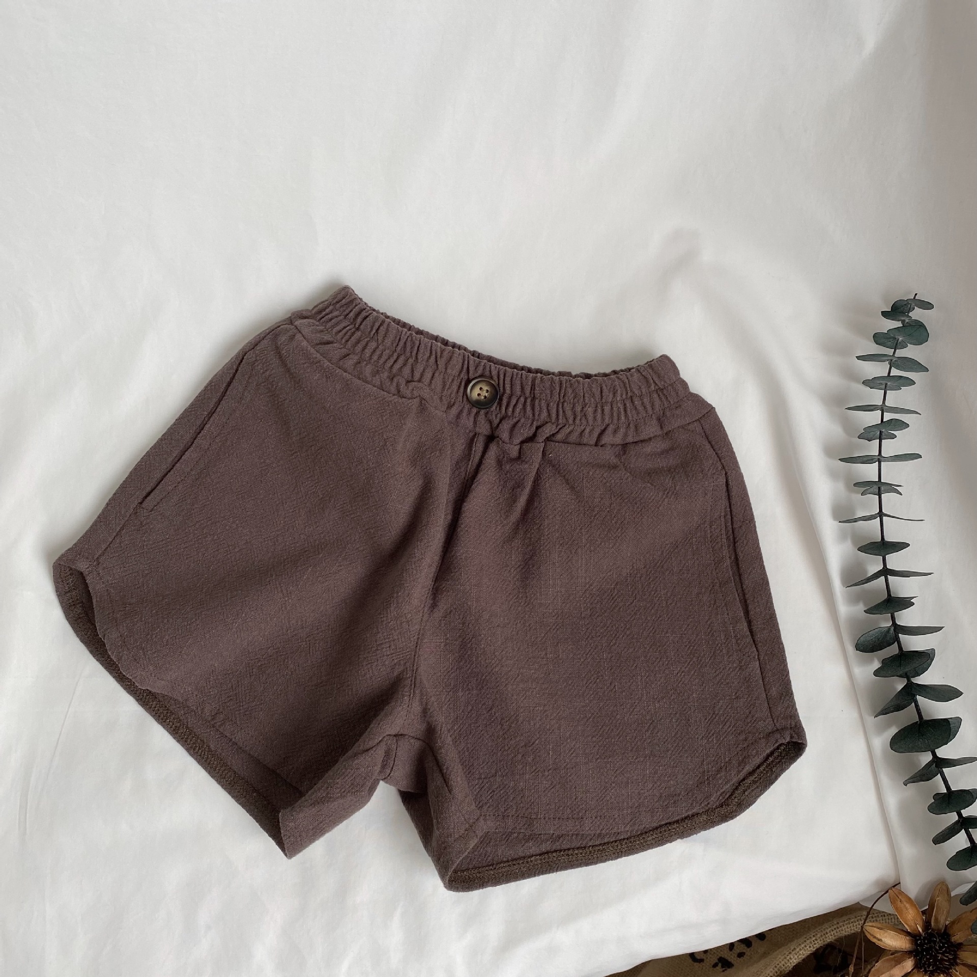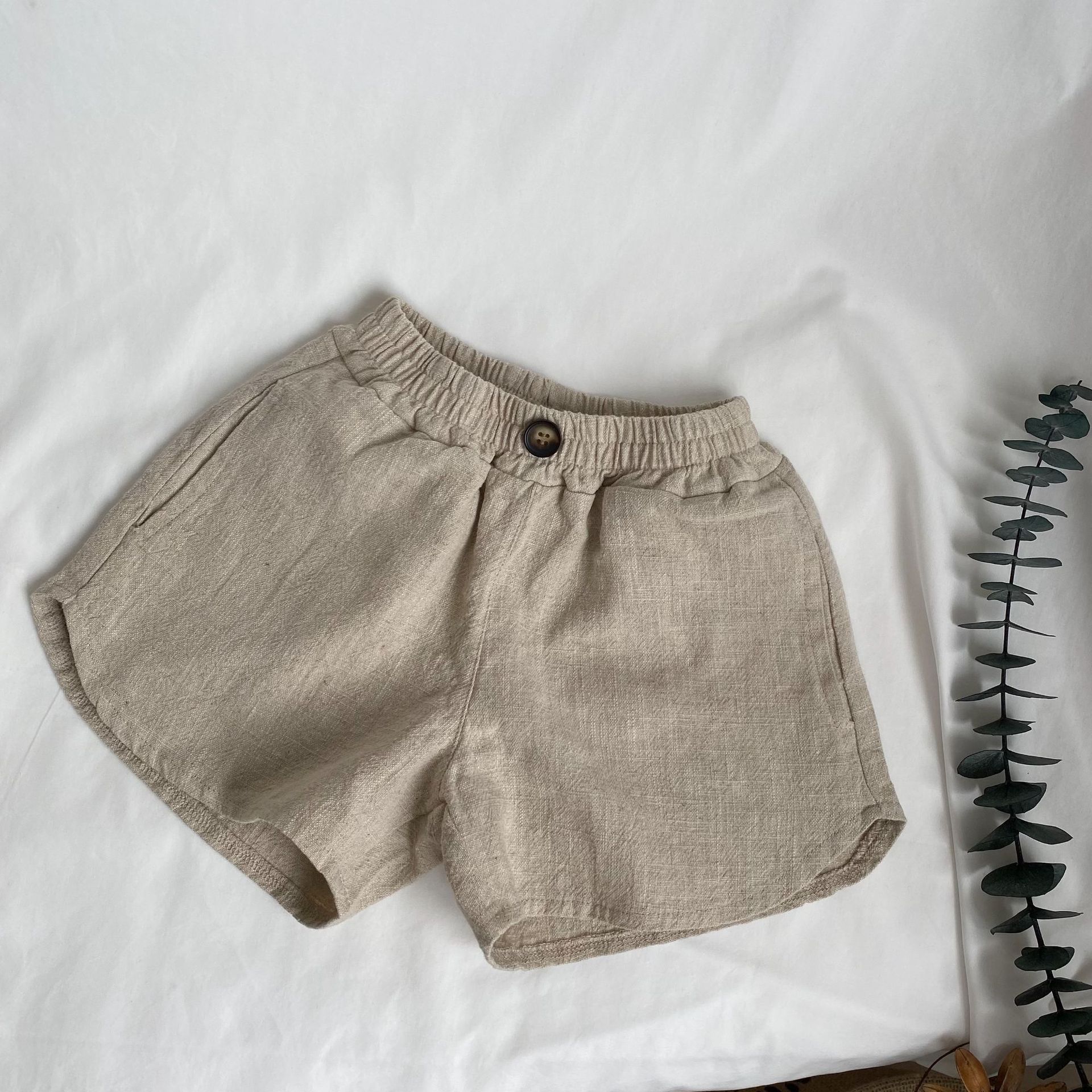 GL-kids 한국 스타일 여름 새로운 어린이 레트로 싱글 버튼 면과 린넨 반바지 트렌디 한 소년과 소녀를위한 미드 웨이스트 워싱 반바지스토어 가기