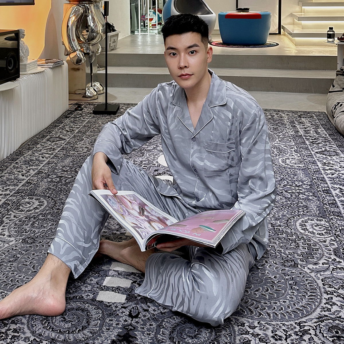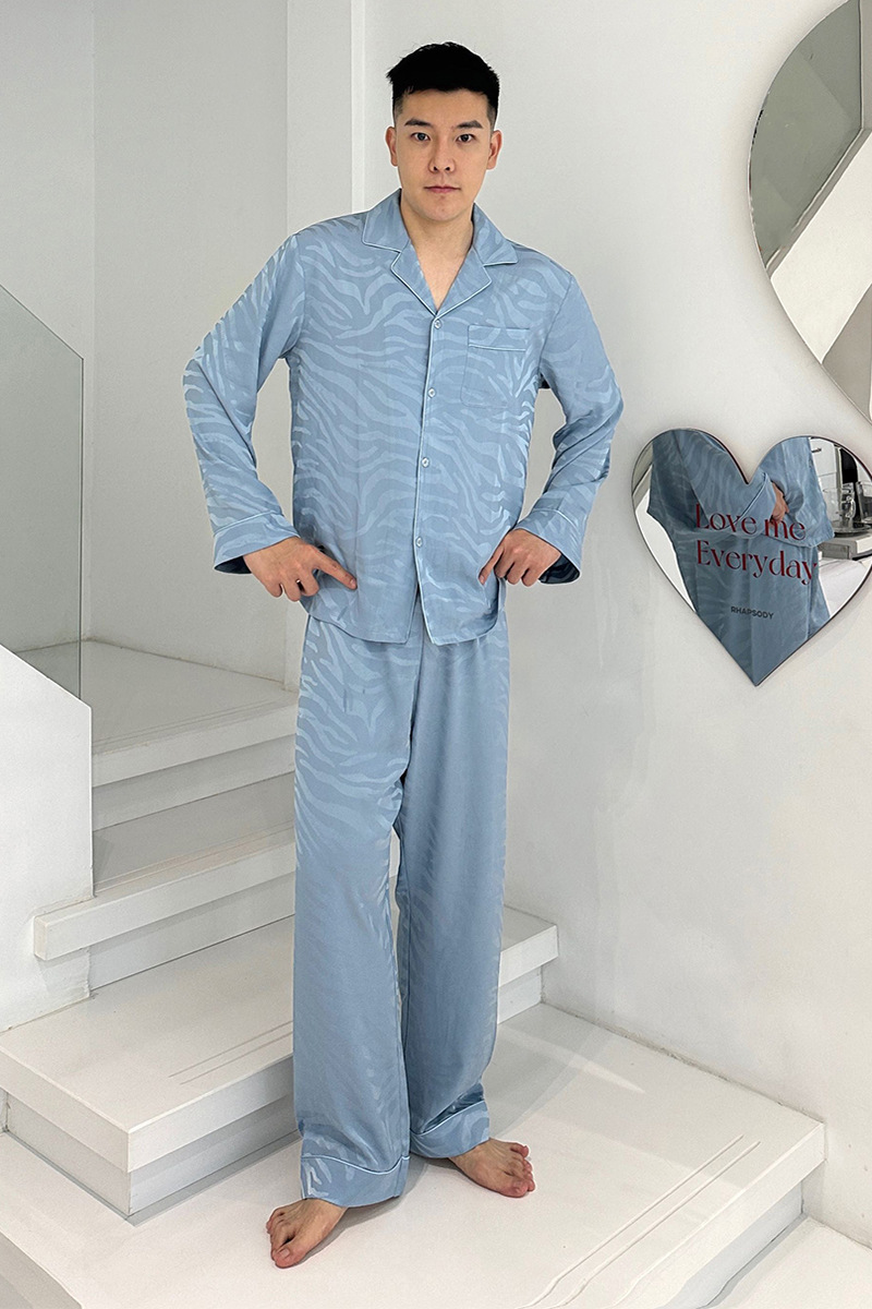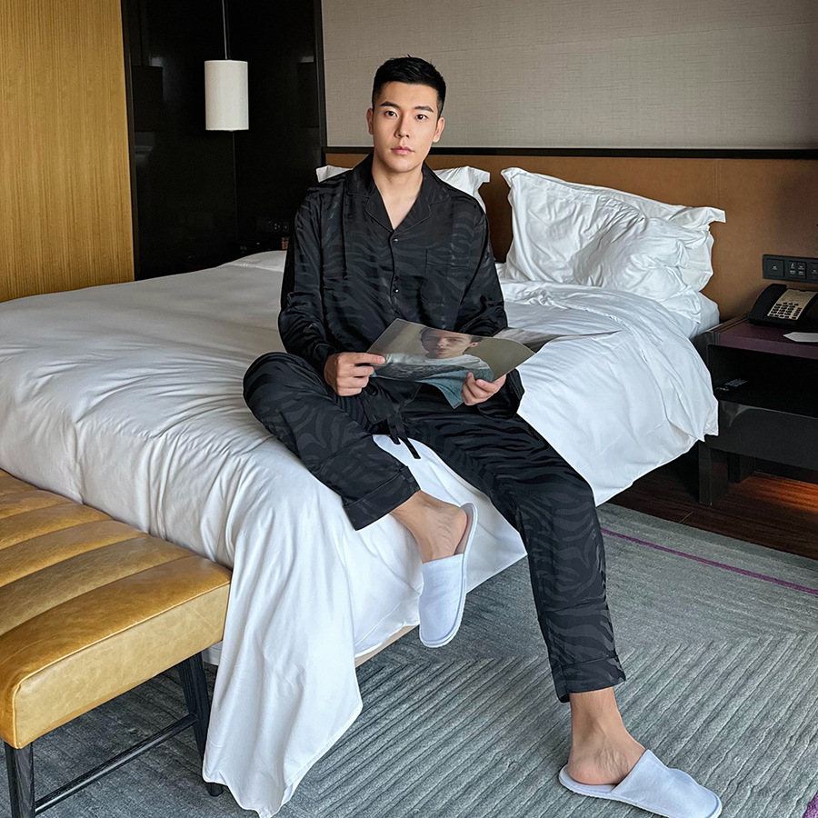 작은 빨간 책 추천 새틴 얼룩말 패턴 얼음 실크 잠옷 자카드 남자의 긴 소매 바지 세트 가정 의류 봄과 가을