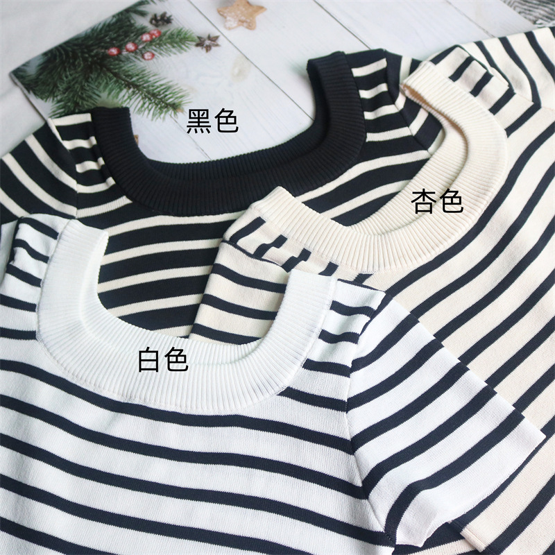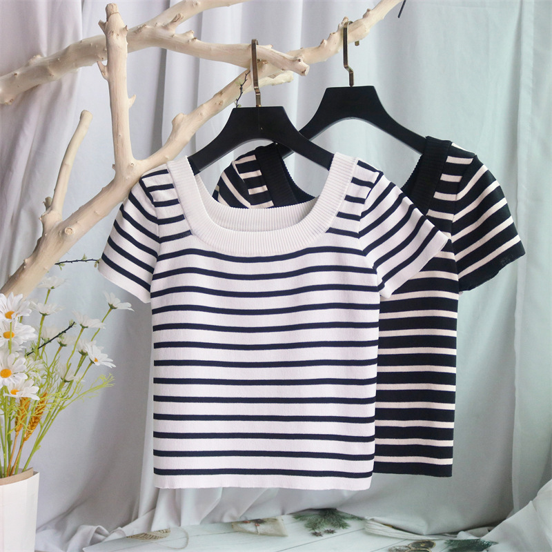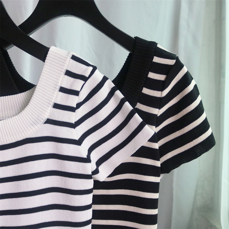 2023新款韩系夏季圆领修身短款黑白条纹针织短袖T恤小衫上衣女潮