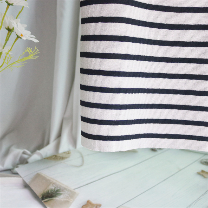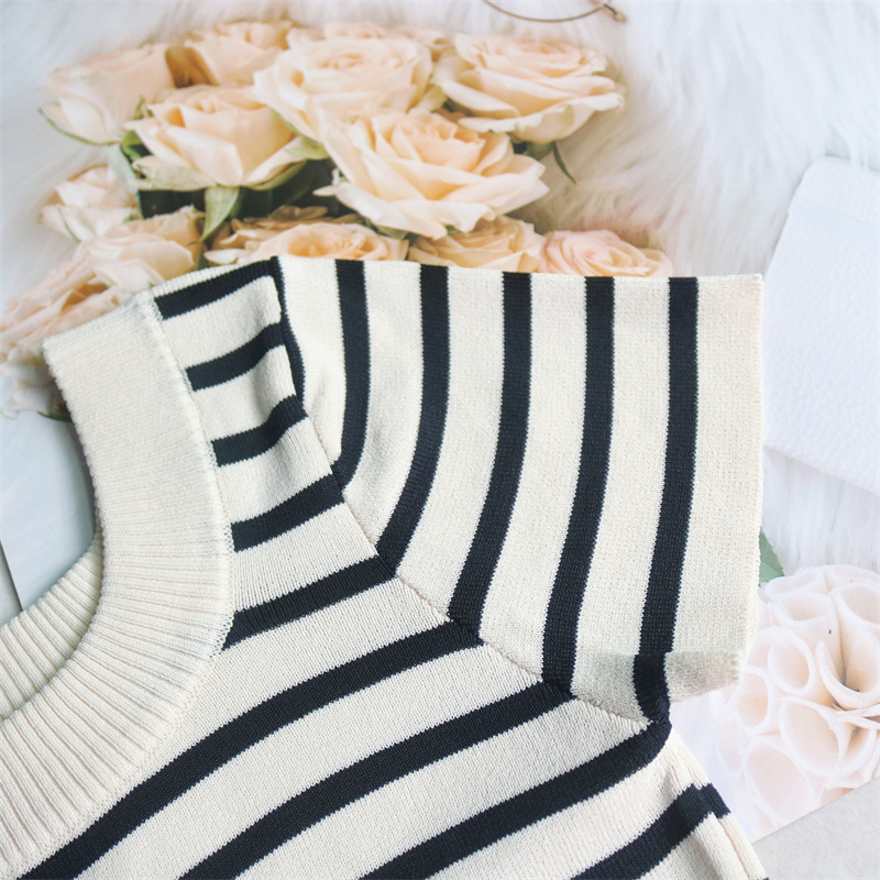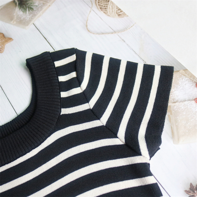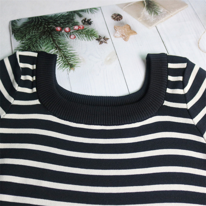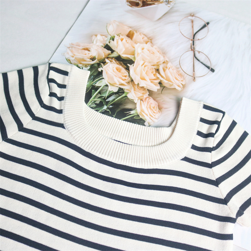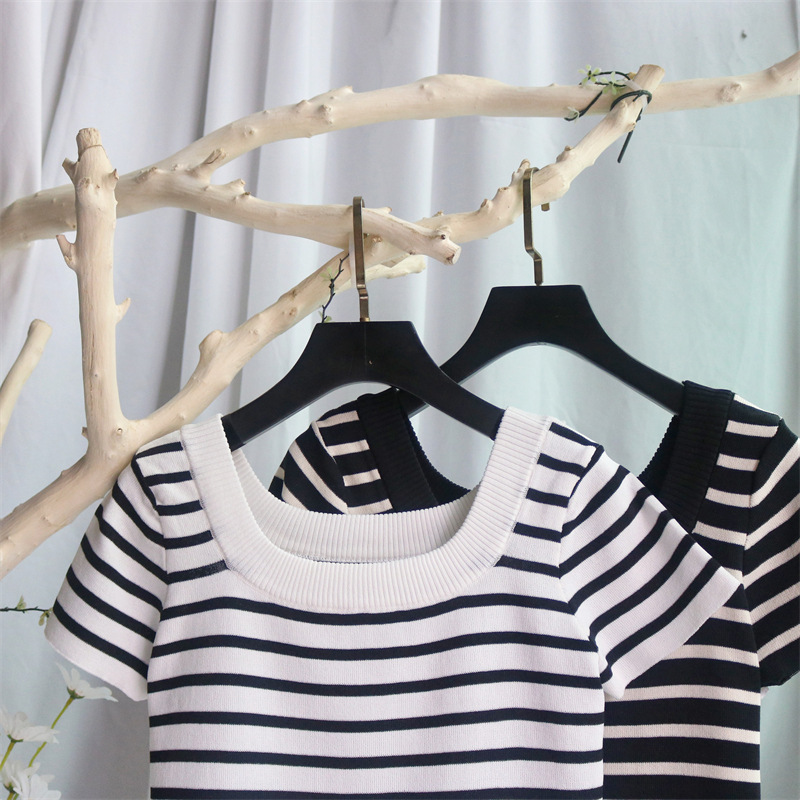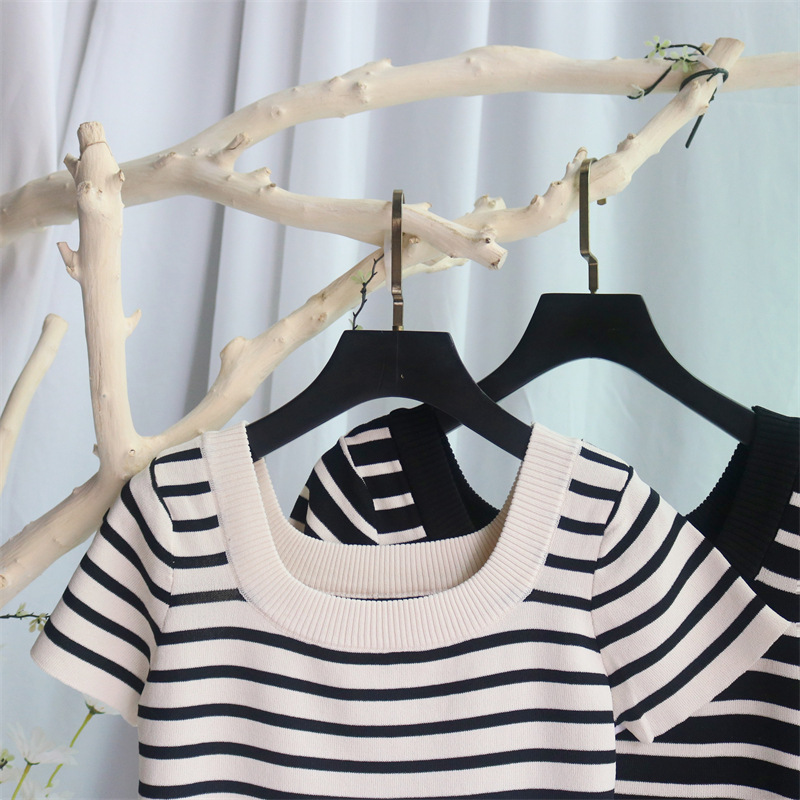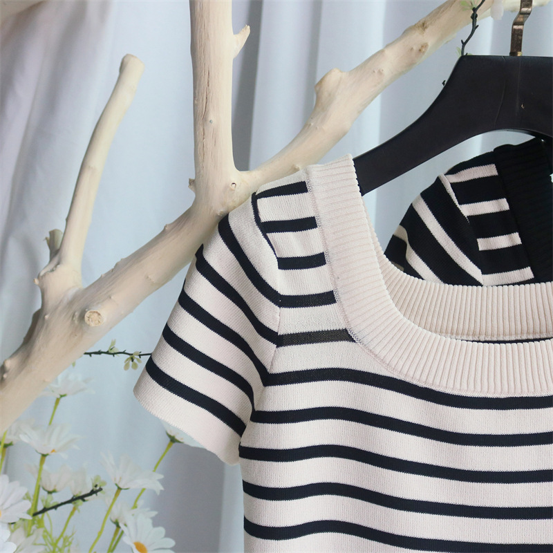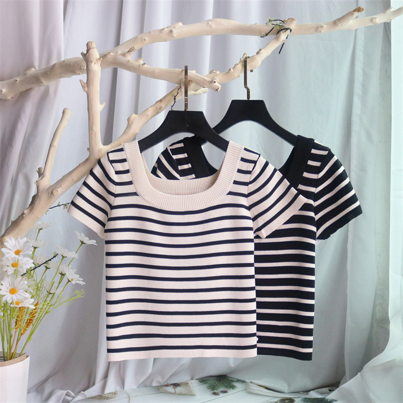 새로운 한국 스타일 여름 대비 색상 내부 스티칭 U 칼라 티셔츠 반팔 티셔츠 여성을위한 최고 줄무늬 니트 스웨터