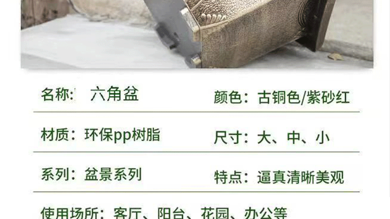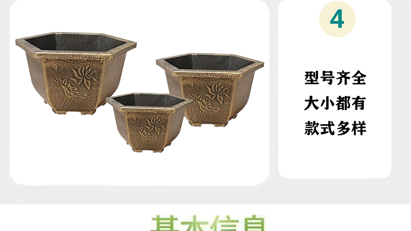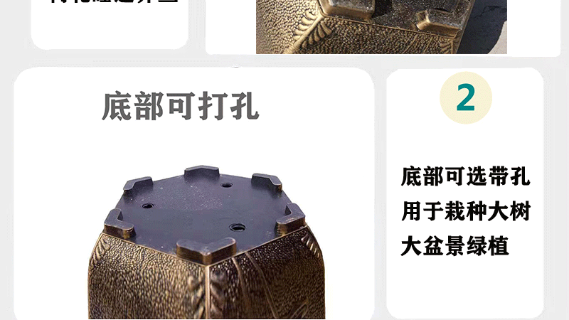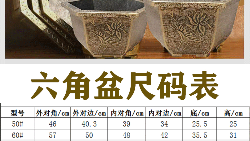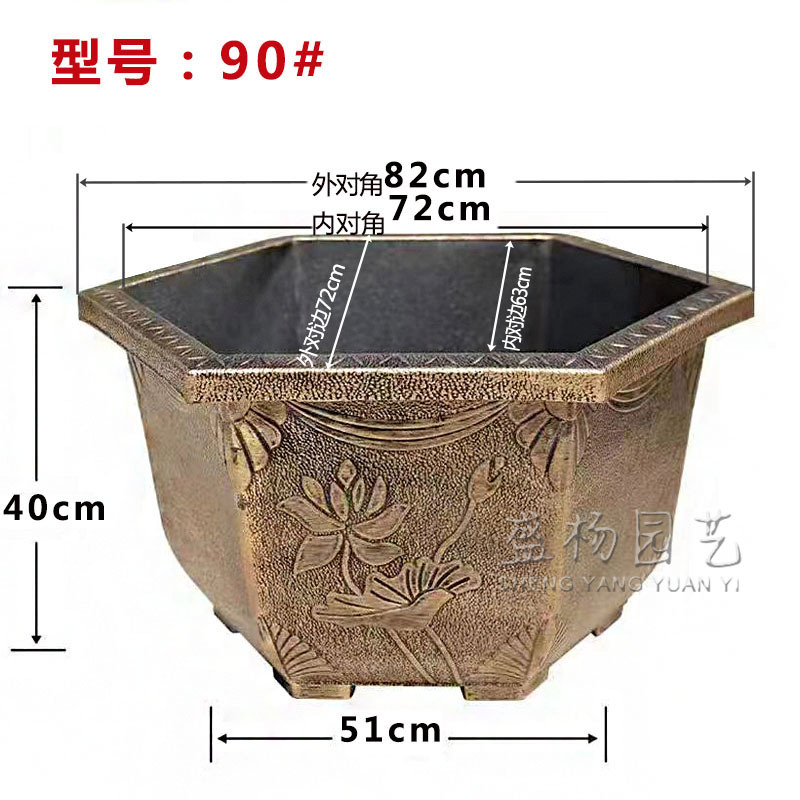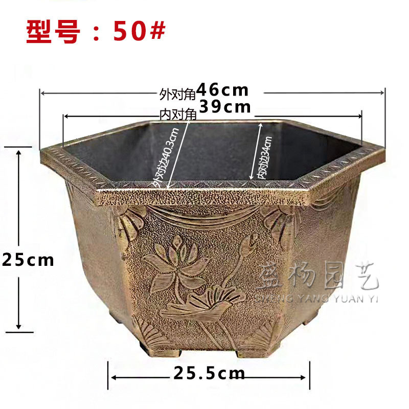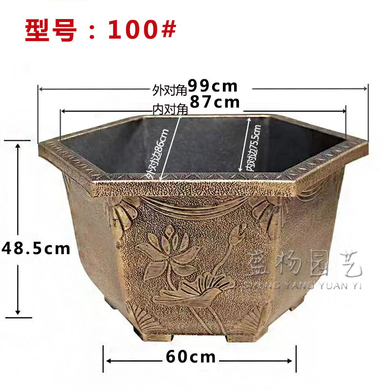 대형 육각 분지 청동 두꺼운 수지 야외 큰 나무 알루미늄 플라스틱 화분 구멍이있는 비 다공성 수경 화분스토어 가기