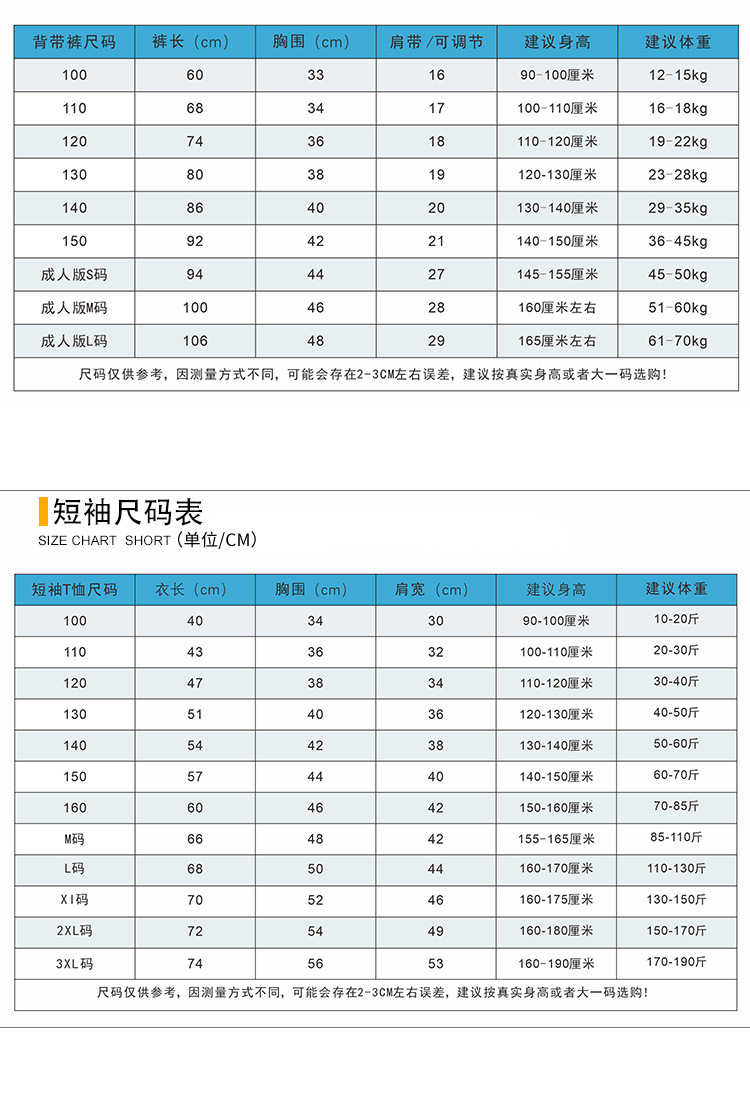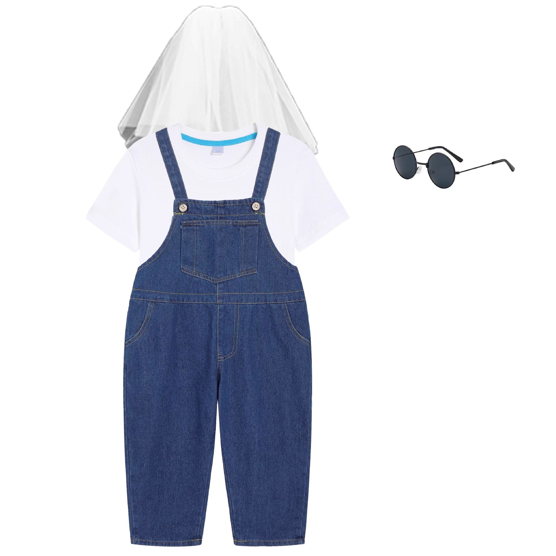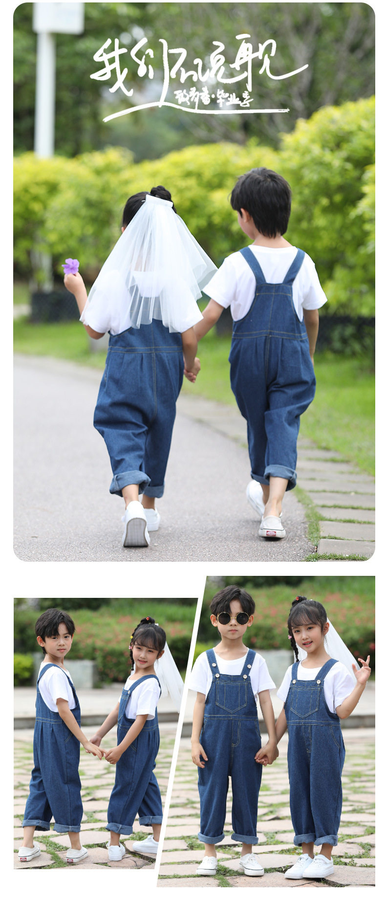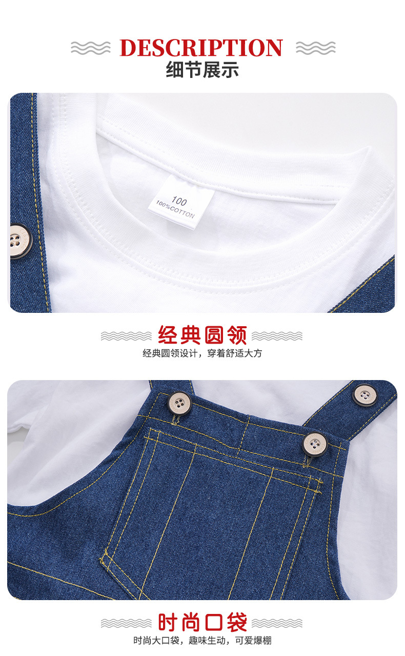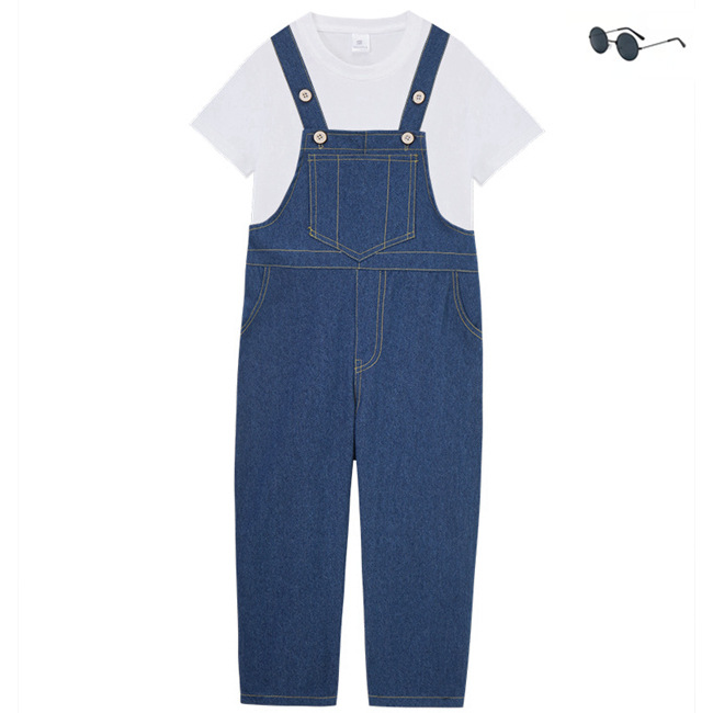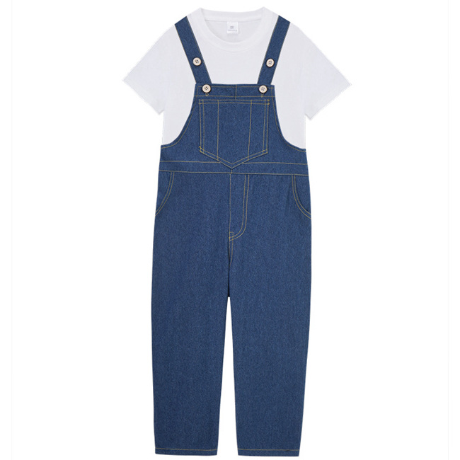• 흰색 반소매 + 파란색 스트랩 바지가있는 남성과 여성