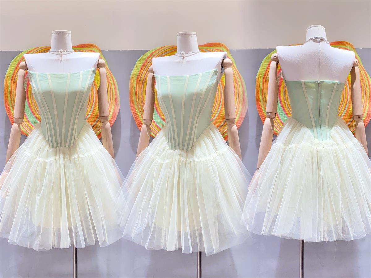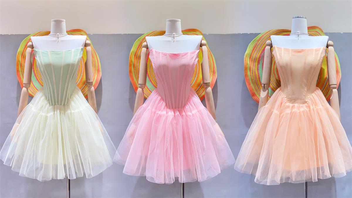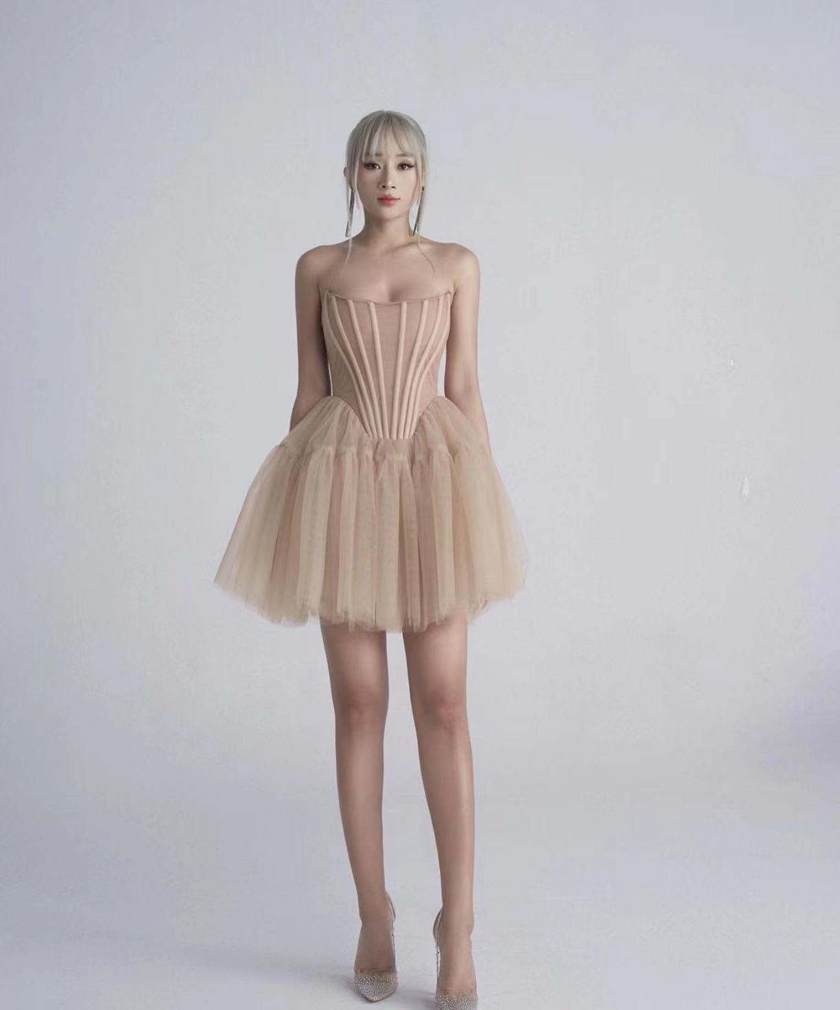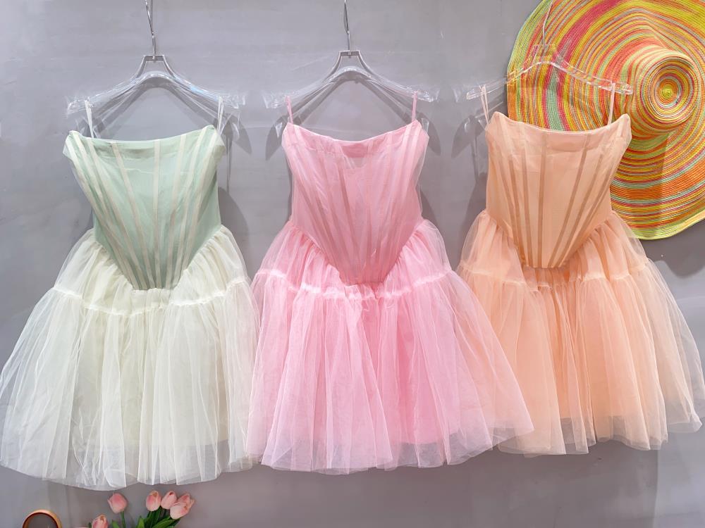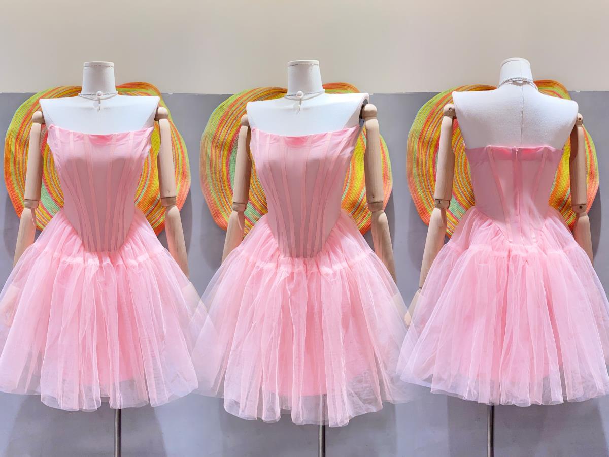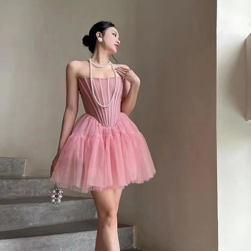 핑크 하이 엔드 센스 사교계 스타일 끈이 없는 원피스 여성의 여름 새로운 프랑스 스타일 우아한 슬림 핏 푹신한 원피스스토어 가기