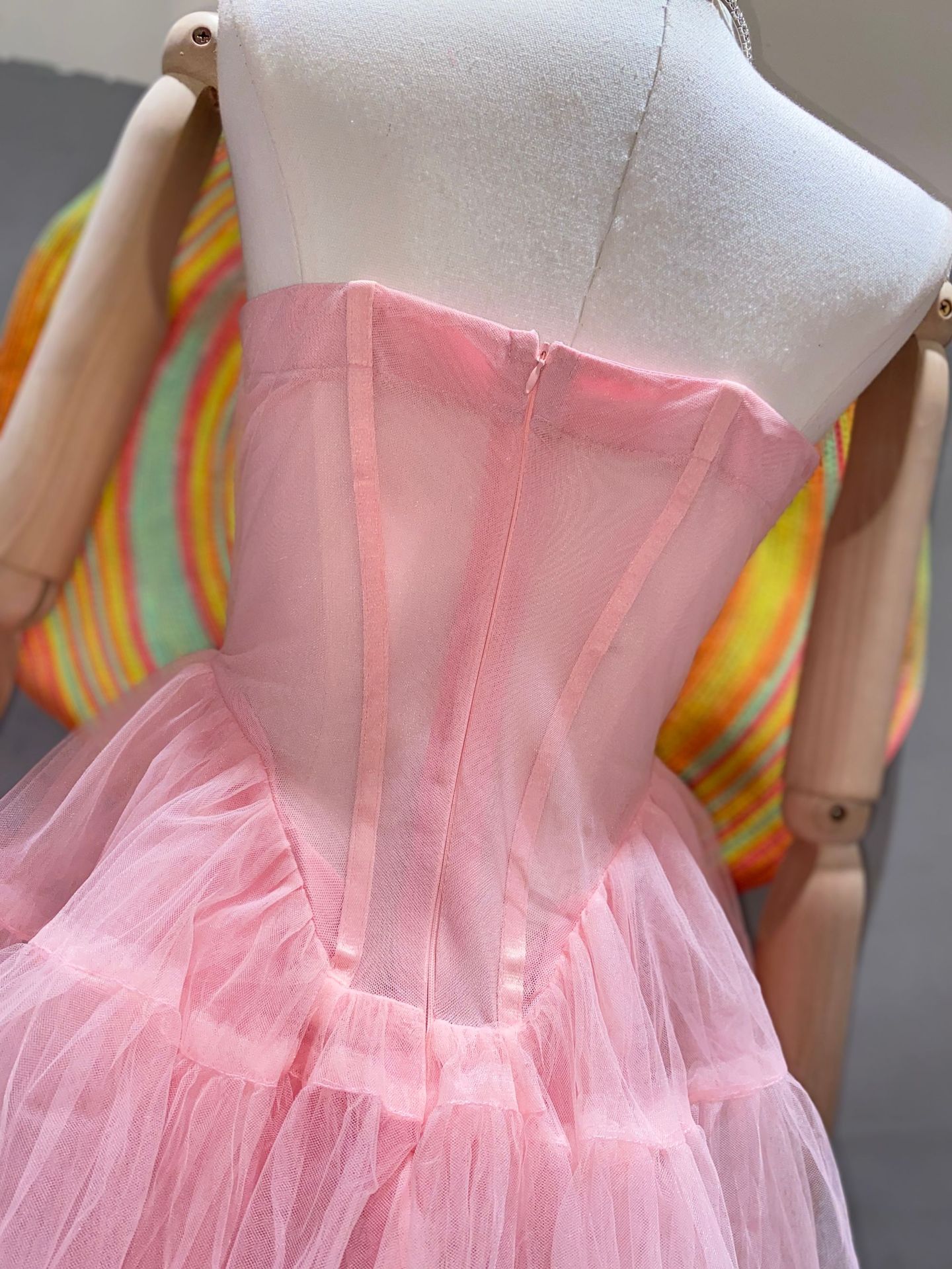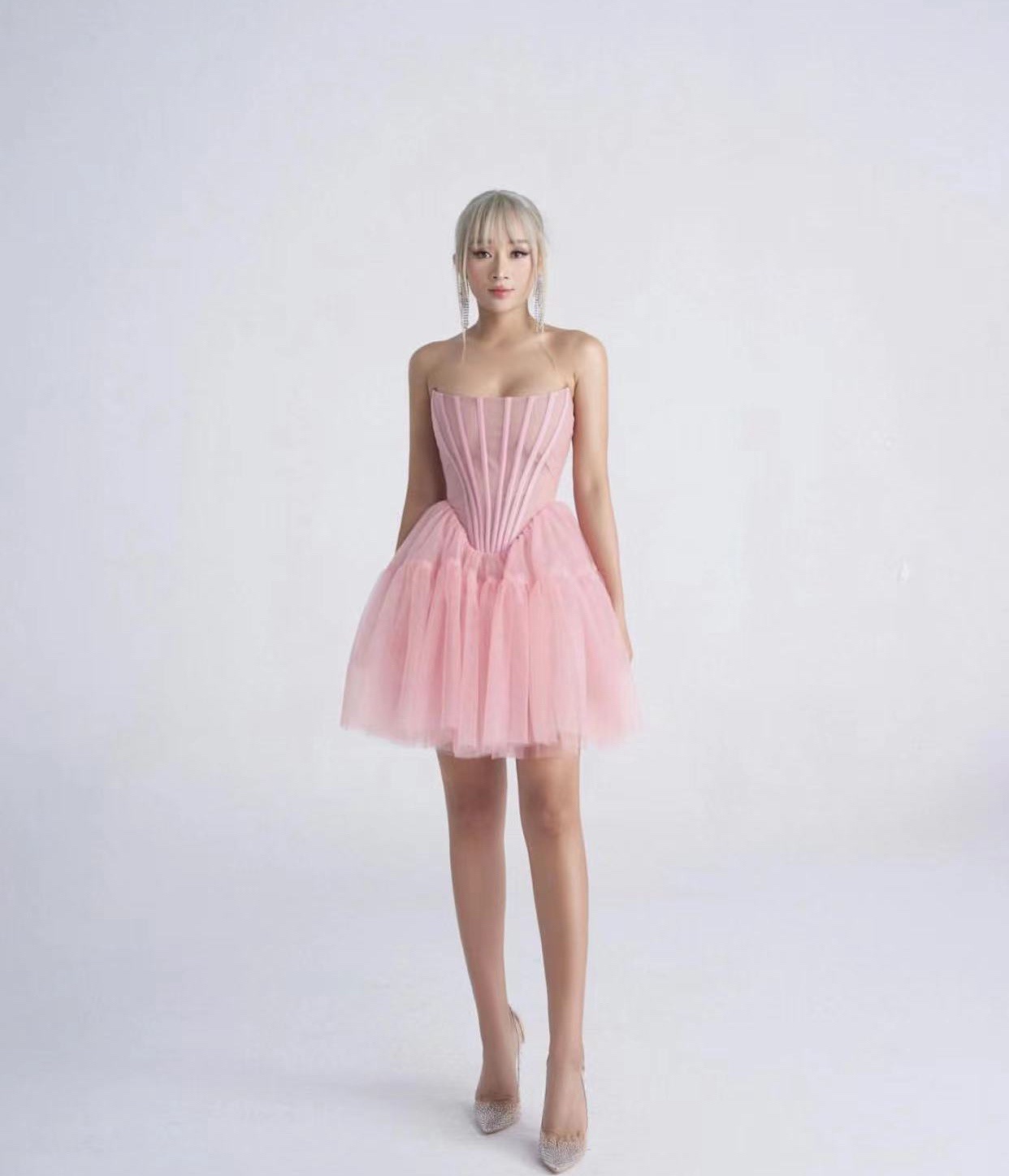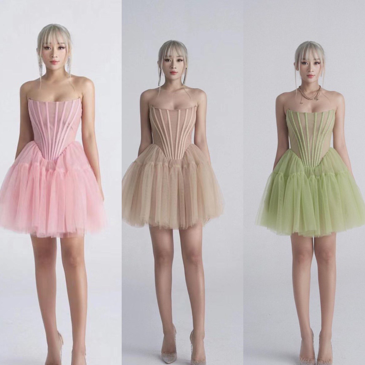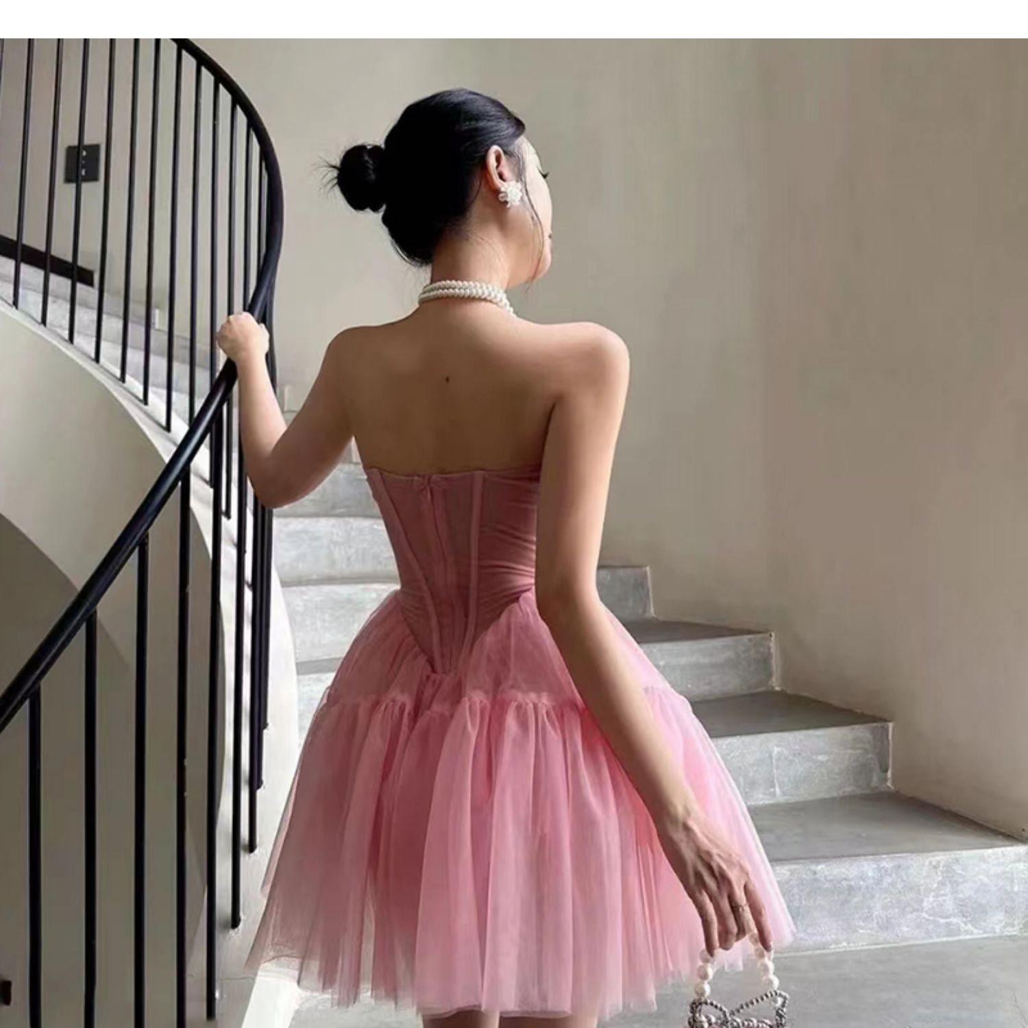핑크 하이 엔드 센스 사교계 스타일 끈이 없는 원피스 여성의 여름 새로운 프랑스 스타일 우아한 슬림 핏 푹신한 원피스스토어 가기