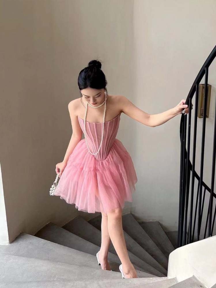 핑크 하이 엔드 센스 사교계 스타일 끈이 없는 원피스 여성의 여름 새로운 프랑스 스타일 우아한 슬림 핏 푹신한 원피스