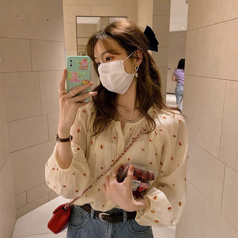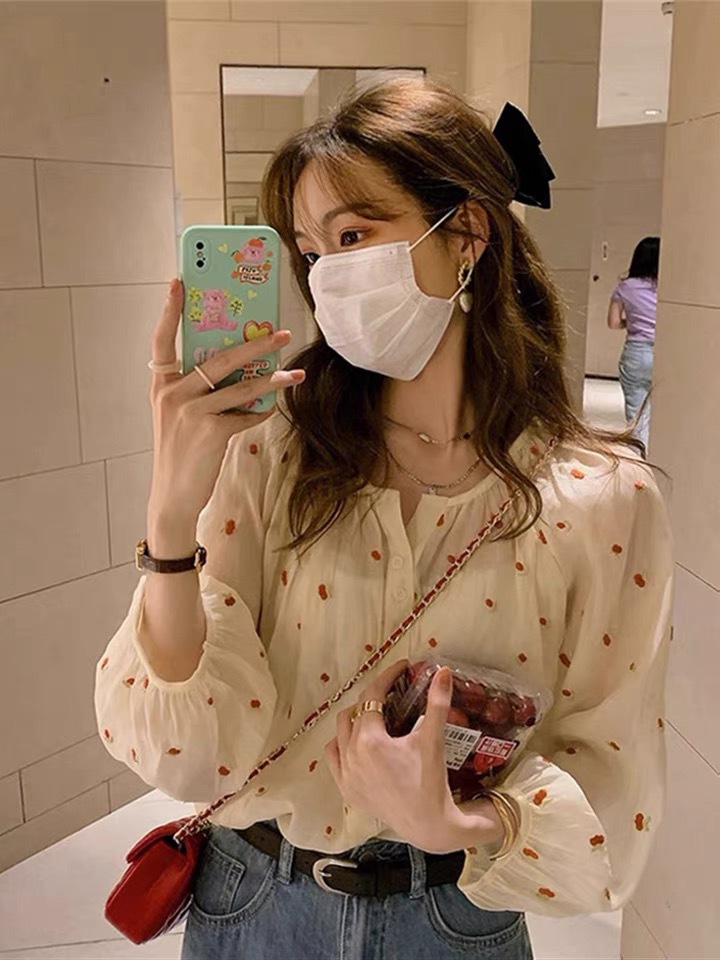 랜턴 슬리브 자수 프랑스 고급 아이스 실크 쉬폰 셔츠 여성용 여름 자외선 차단제 셔츠 작고 신선한 달콤한 탑 블라우스스토어 가기
