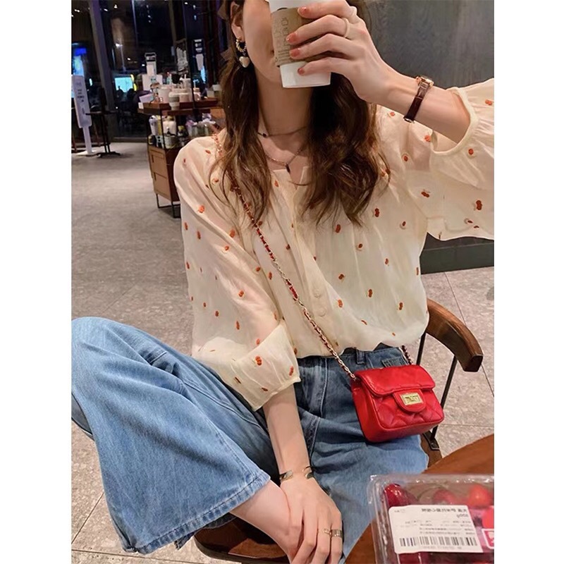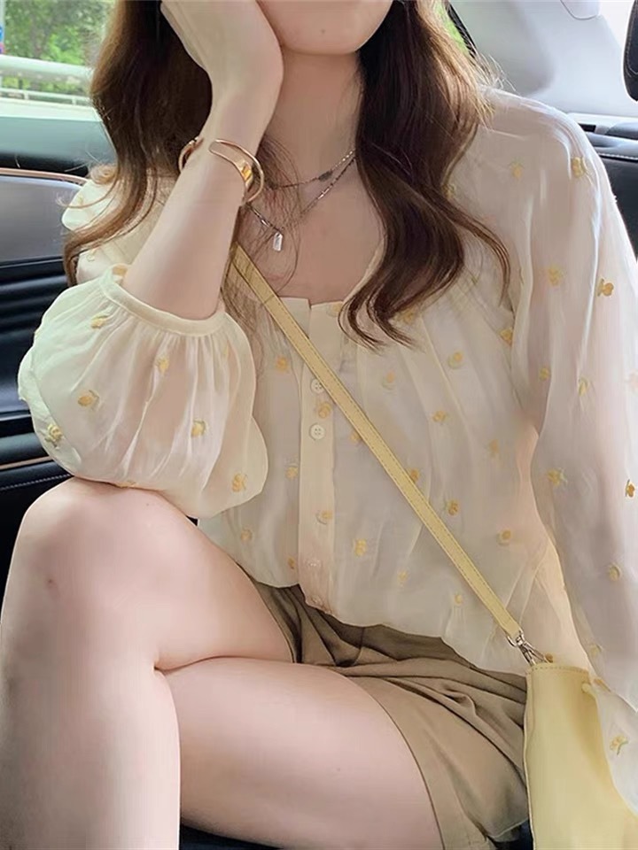 랜턴 슬리브 자수 프랑스 고급 아이스 실크 쉬폰 셔츠 여성용 여름 자외선 차단제 셔츠 작고 신선한 달콤한 탑 블라우스