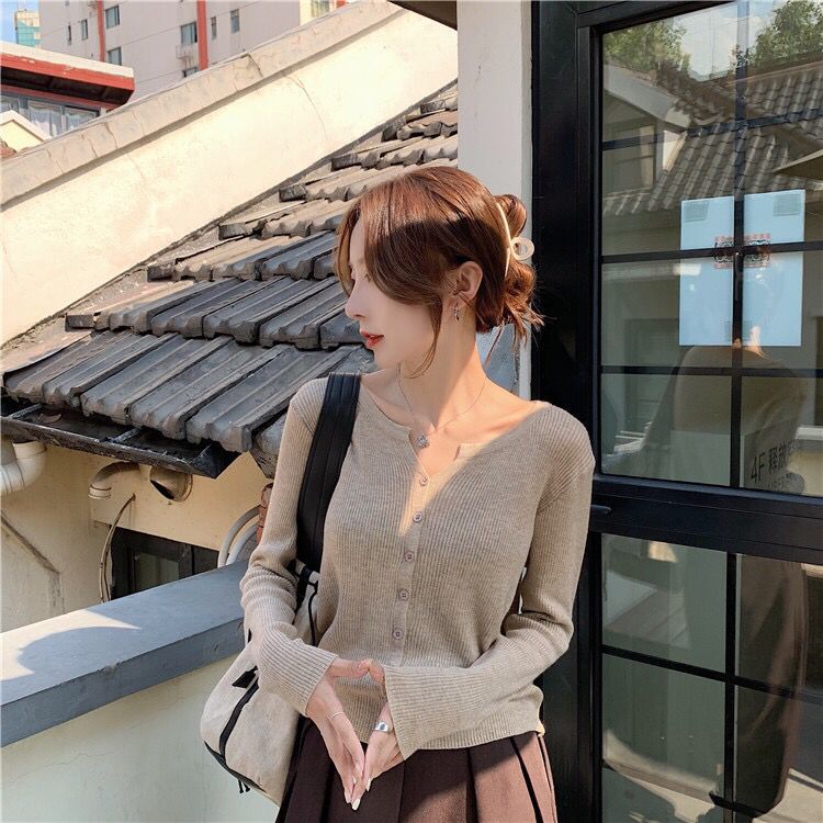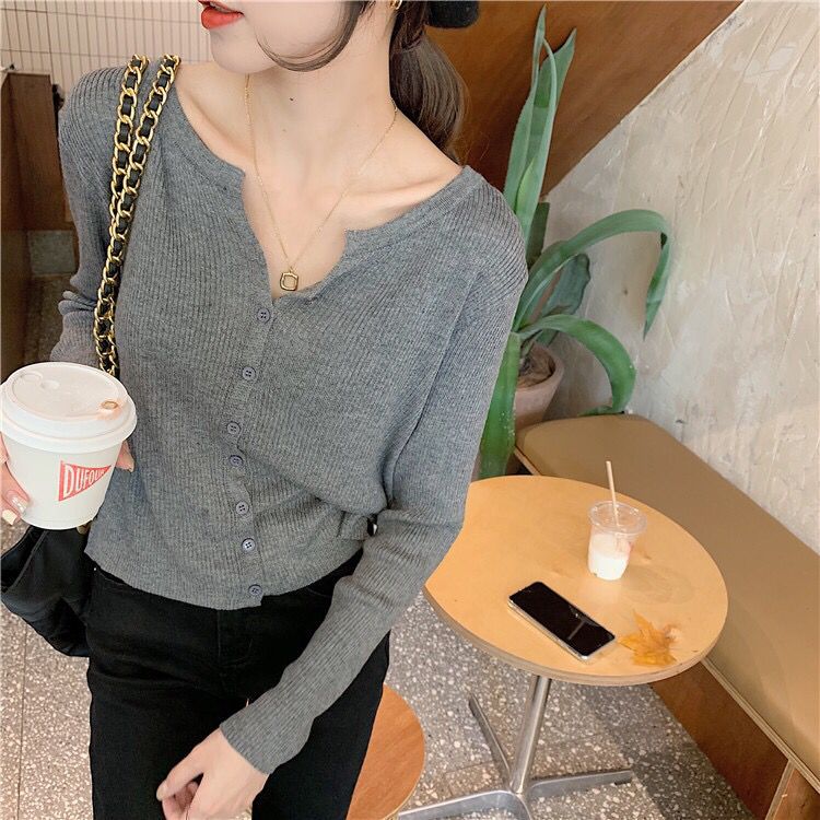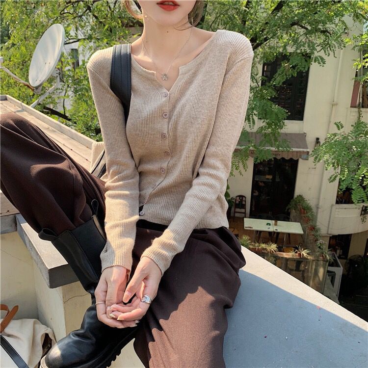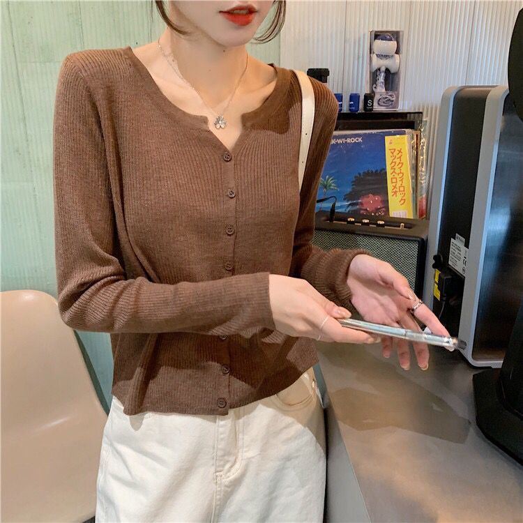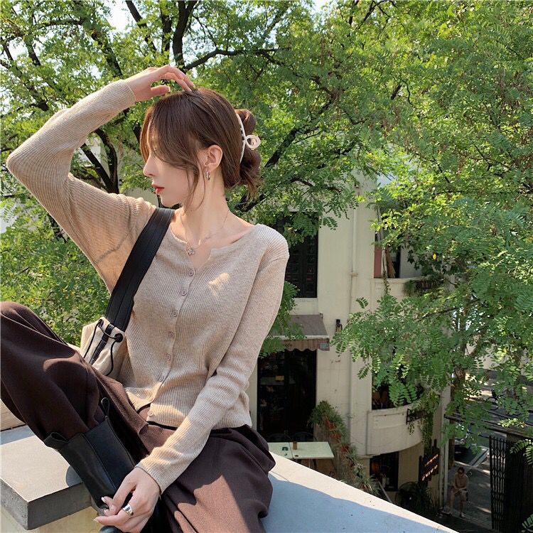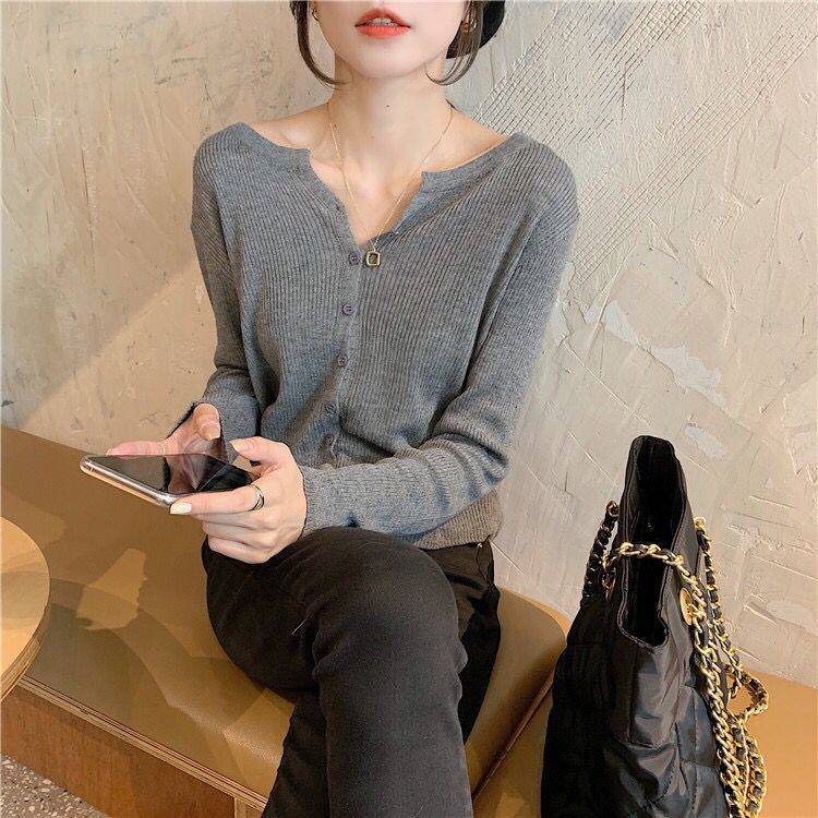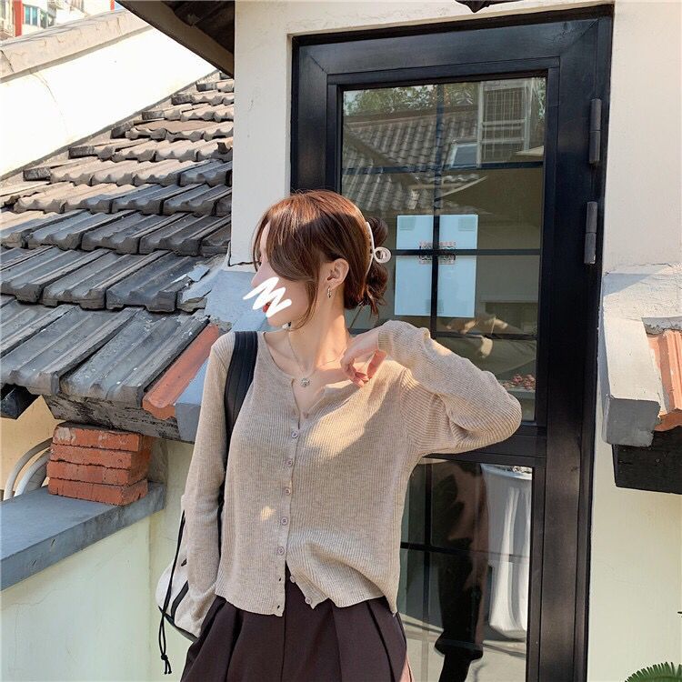 6 울 봄과 가을 V-넥 스웨터 여성용 얇은 긴팔 단색 베이스 탑 짧은 외부 자외선 차단제 재킷 가디건스토어 가기