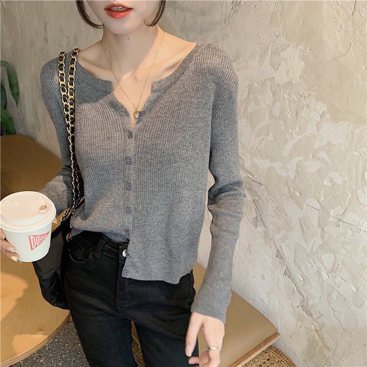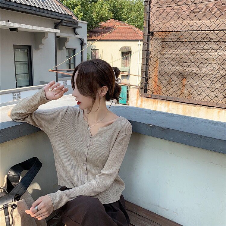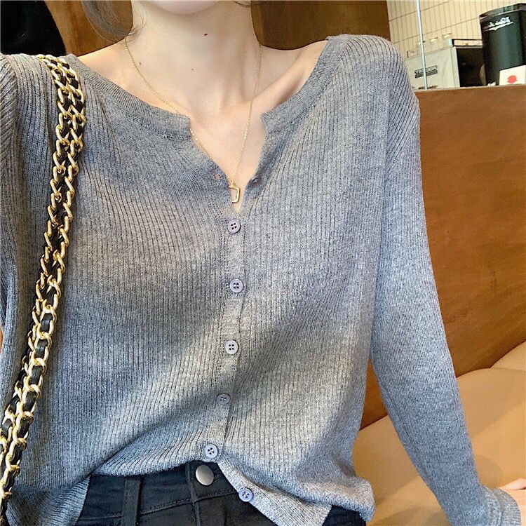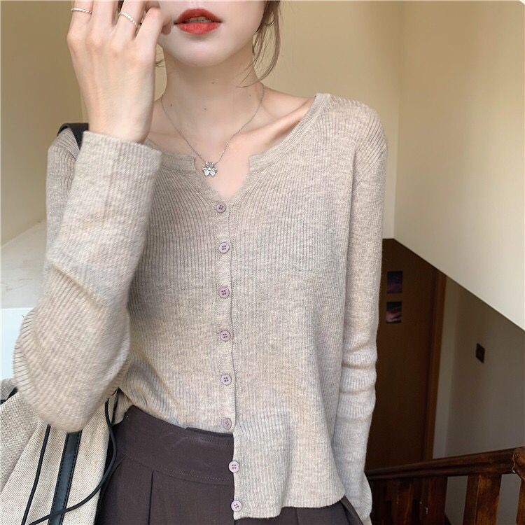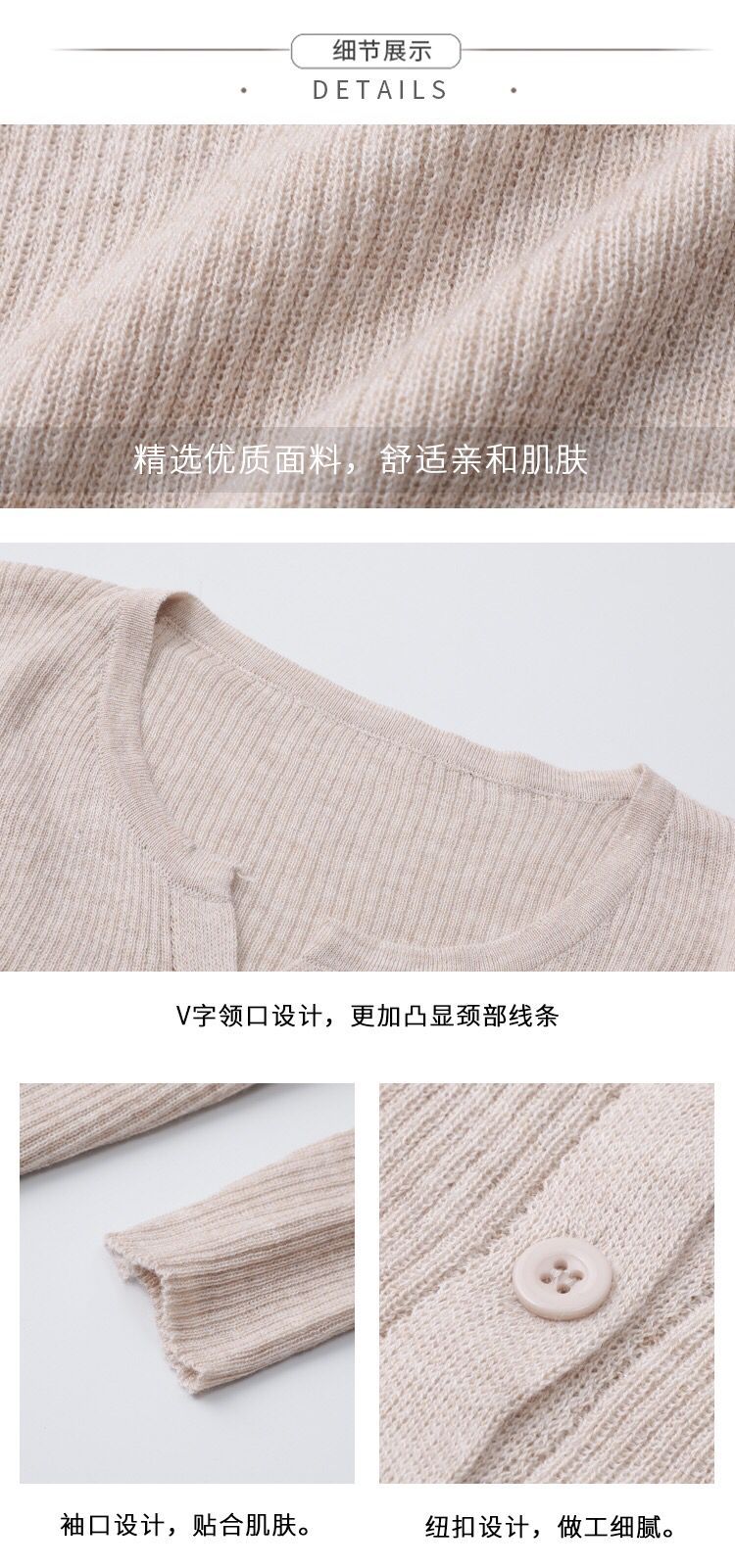 6 울 봄과 가을 V-넥 스웨터 여성용 얇은 긴팔 단색 베이스 탑 짧은 외부 자외선 차단제 재킷 가디건