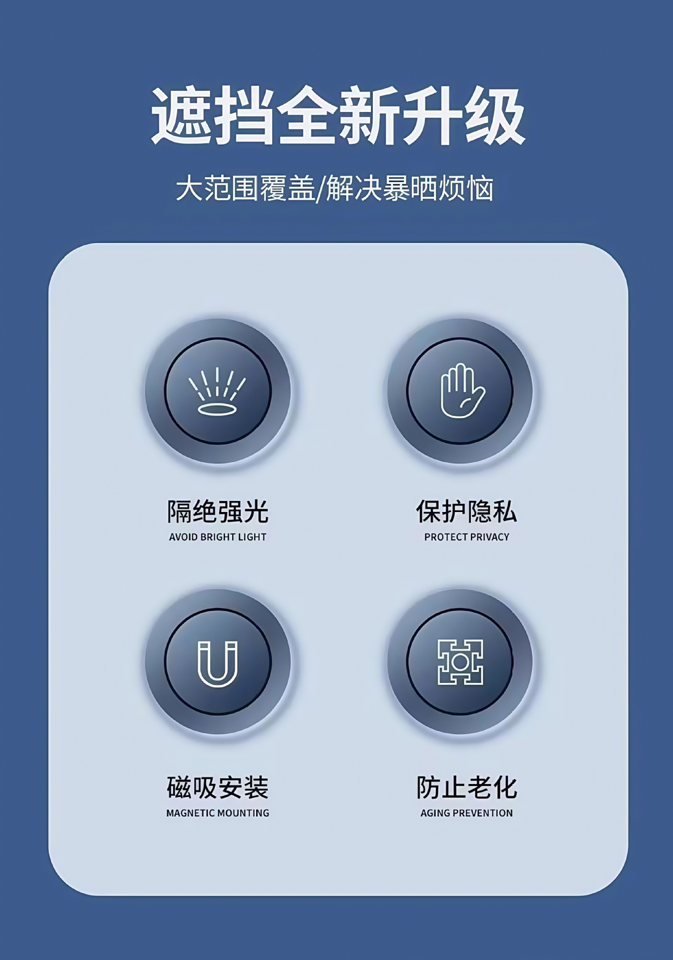 特点:8颗强磁,滑动顺畅,不会吸在一起。钛银涂层均匀,遮光性能很好,保护隐私。