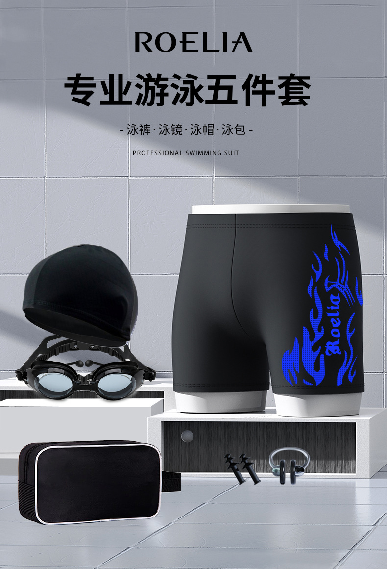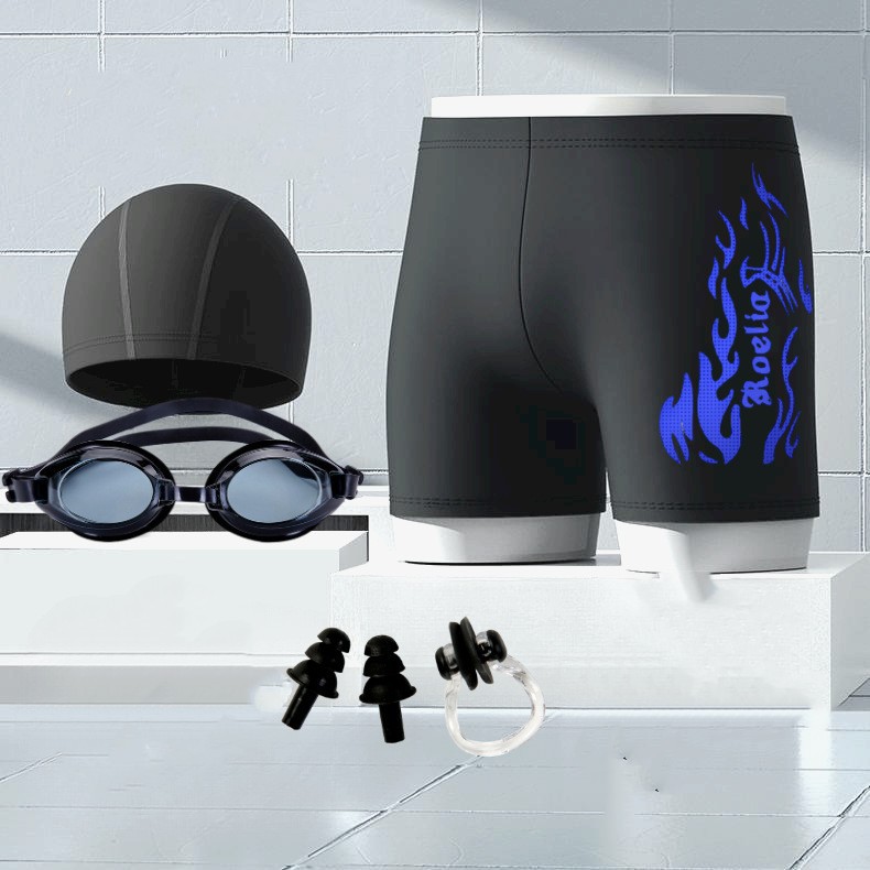 • 푸른 불꽃 바지 + 수영 모자 + 수영 고글 + 코 클립 귀마개
