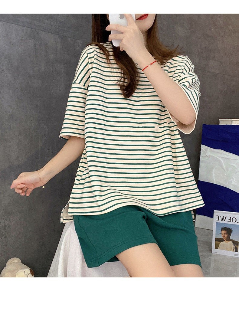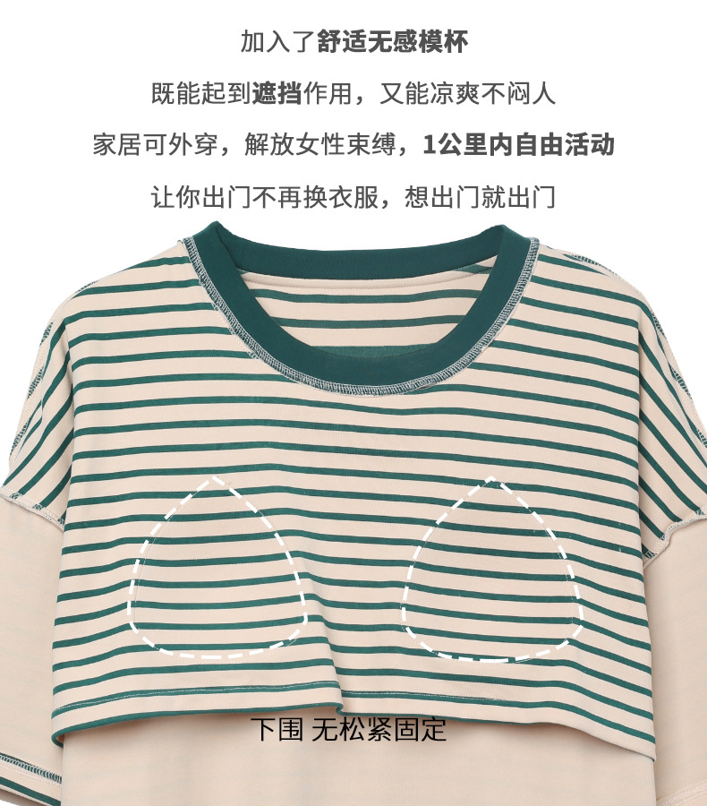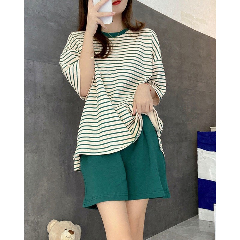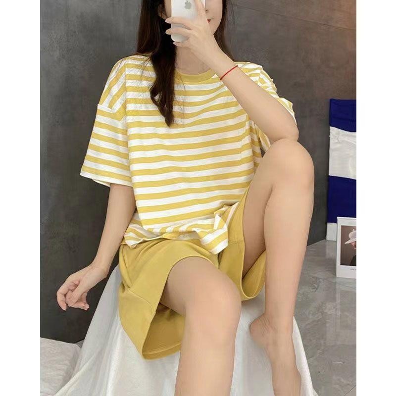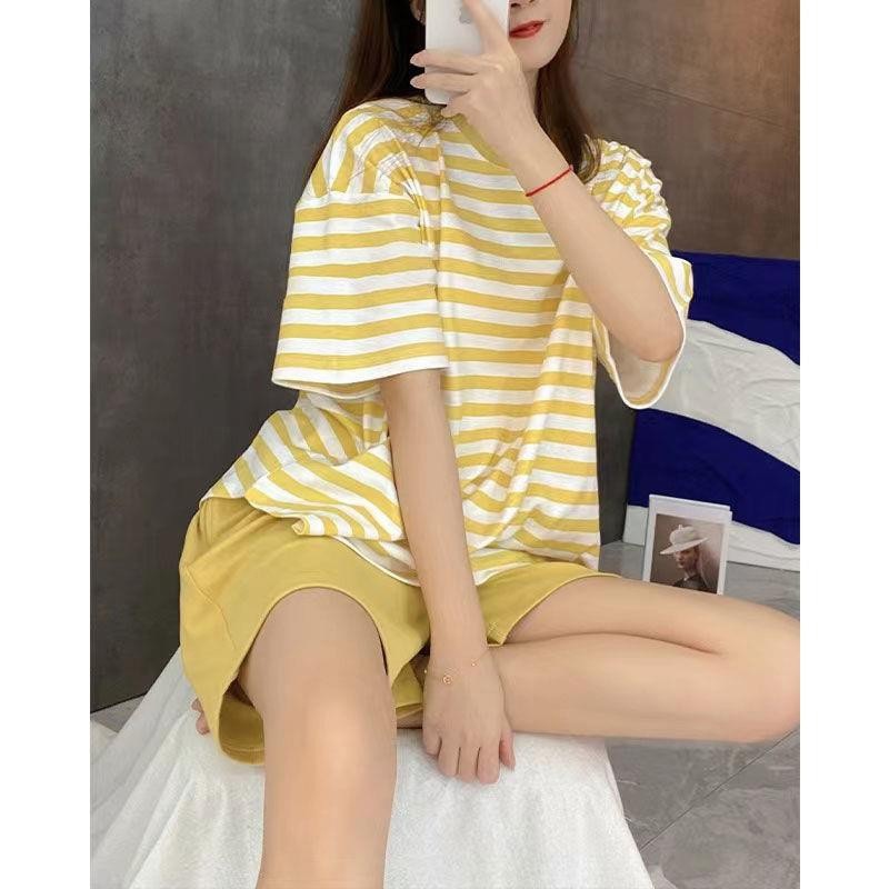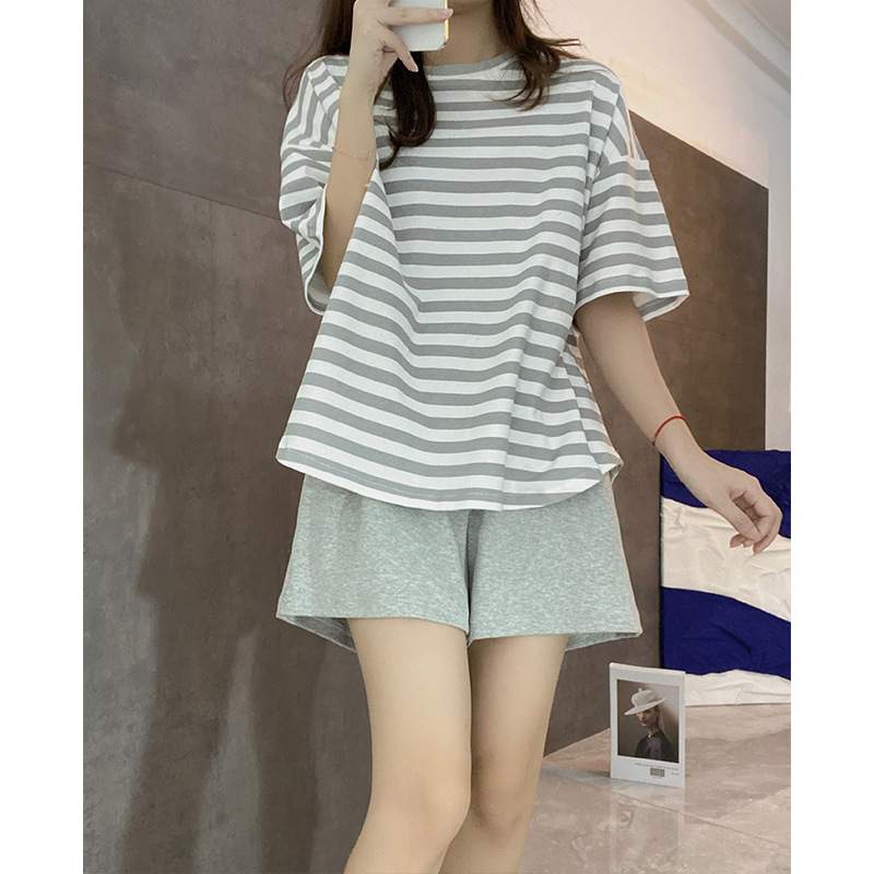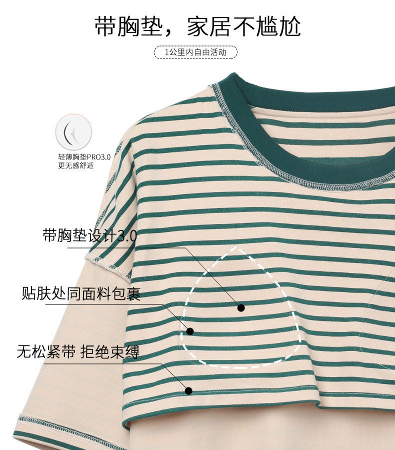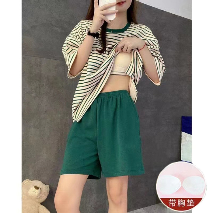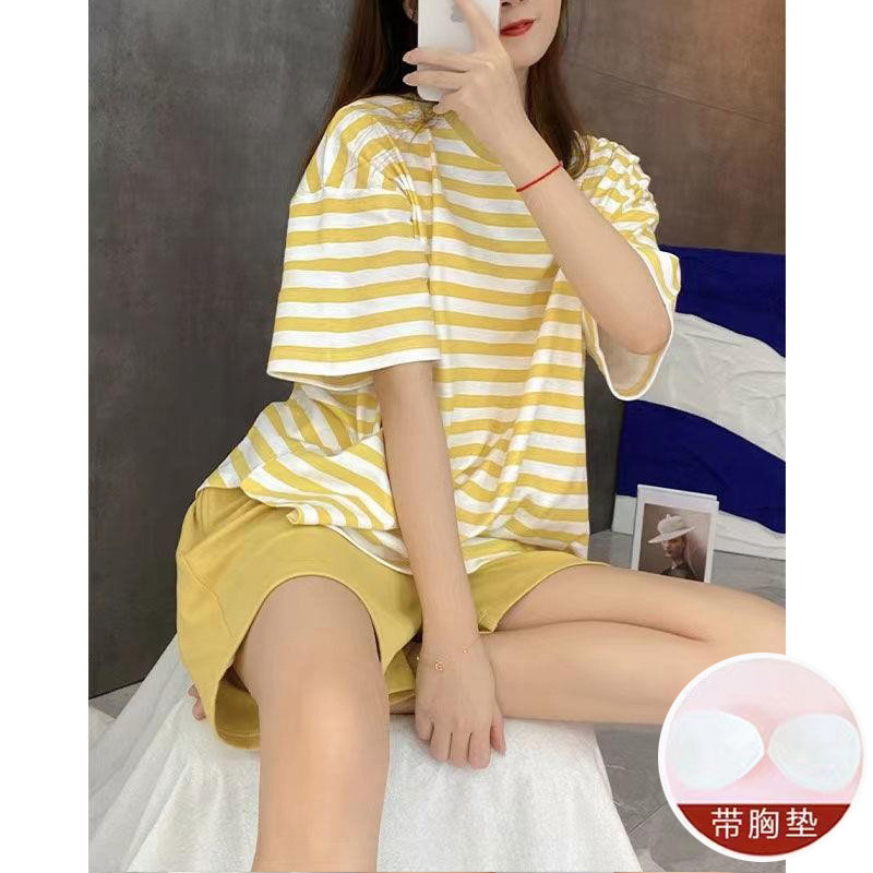 국경 간 여름 새로운 스타일 파자마 여성의 폭발적인 반팔 반바지 가슴 패드 줄무늬 간단한 세트 만화 홈 옷스토어 가기