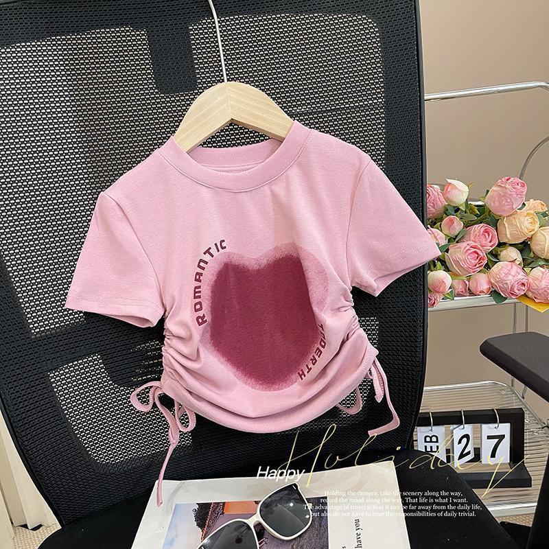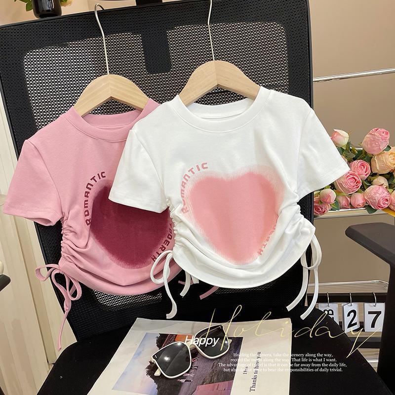 아기 소녀 drawstring 반팔 얼음 실크 탑 25 여름 새 스타일 소녀 복숭아 심장 사랑 달콤한 만화 반팔 티셔츠