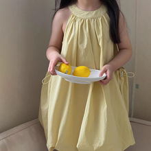 女童连衣裙2026春夏新款黄色背心裙韩系时髦女孩法式挂脖花苞裙