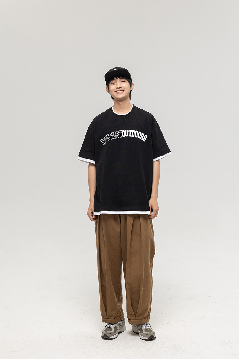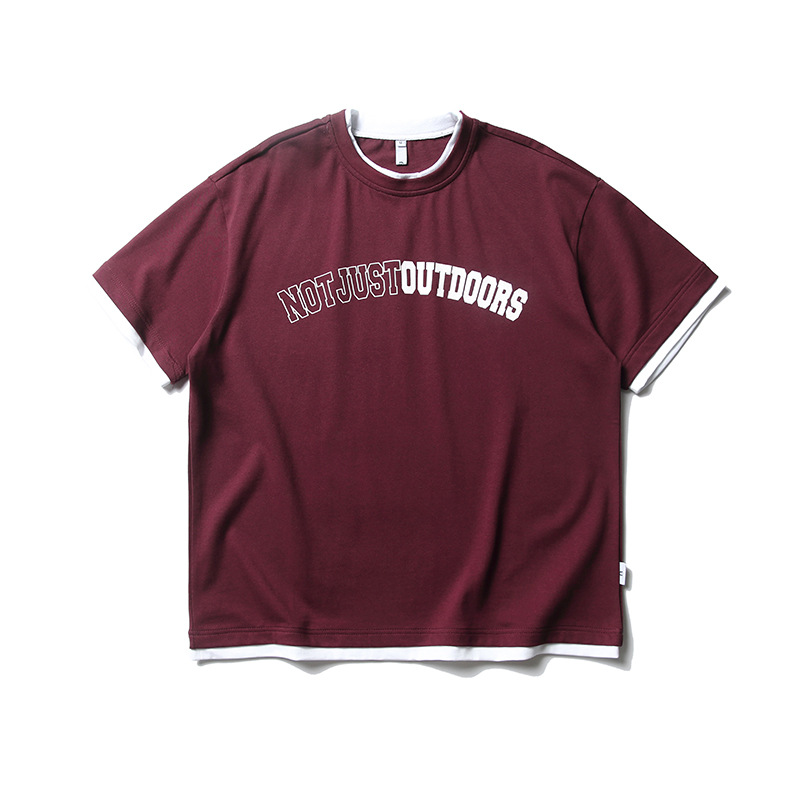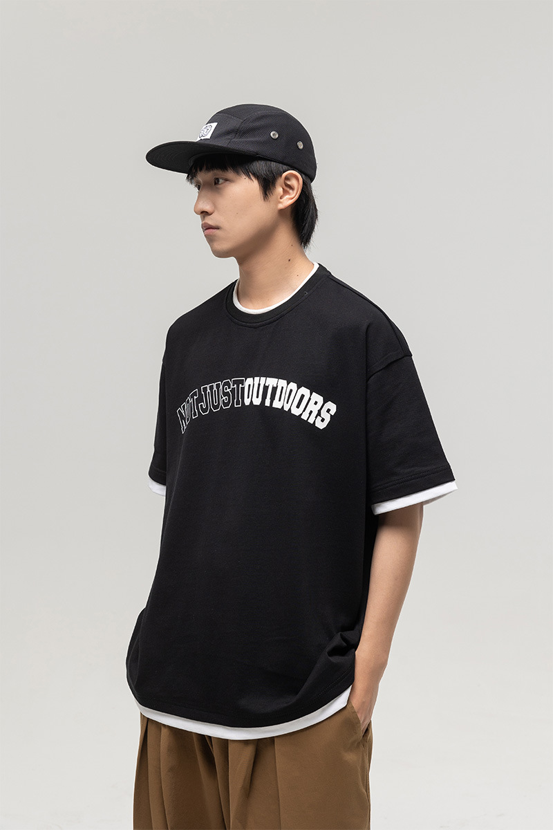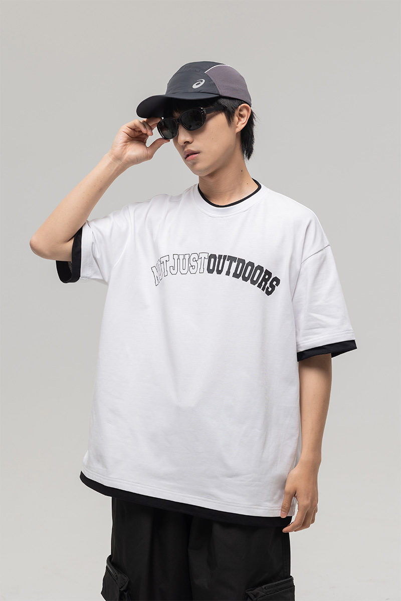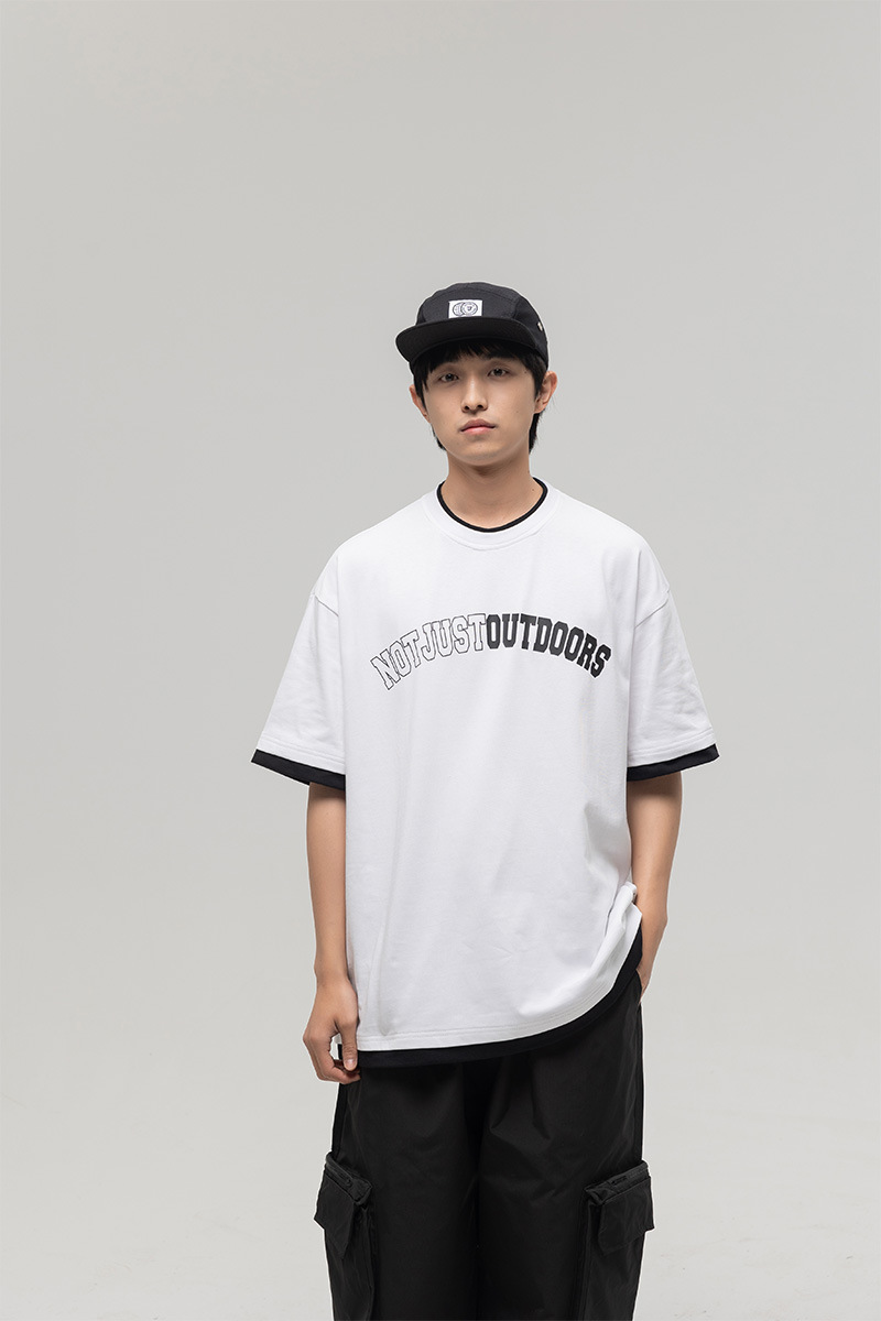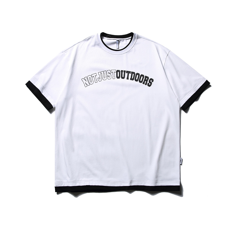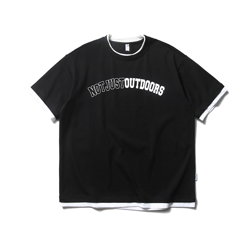 ATBORDER 여름 신작 솔리드 컬러 레터 프린트 라운드 넥 티셔츠 남성용 일본 패션 가짜 투피스 반팔 루즈스토어 가기