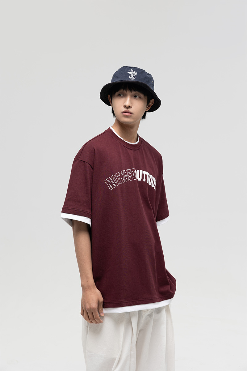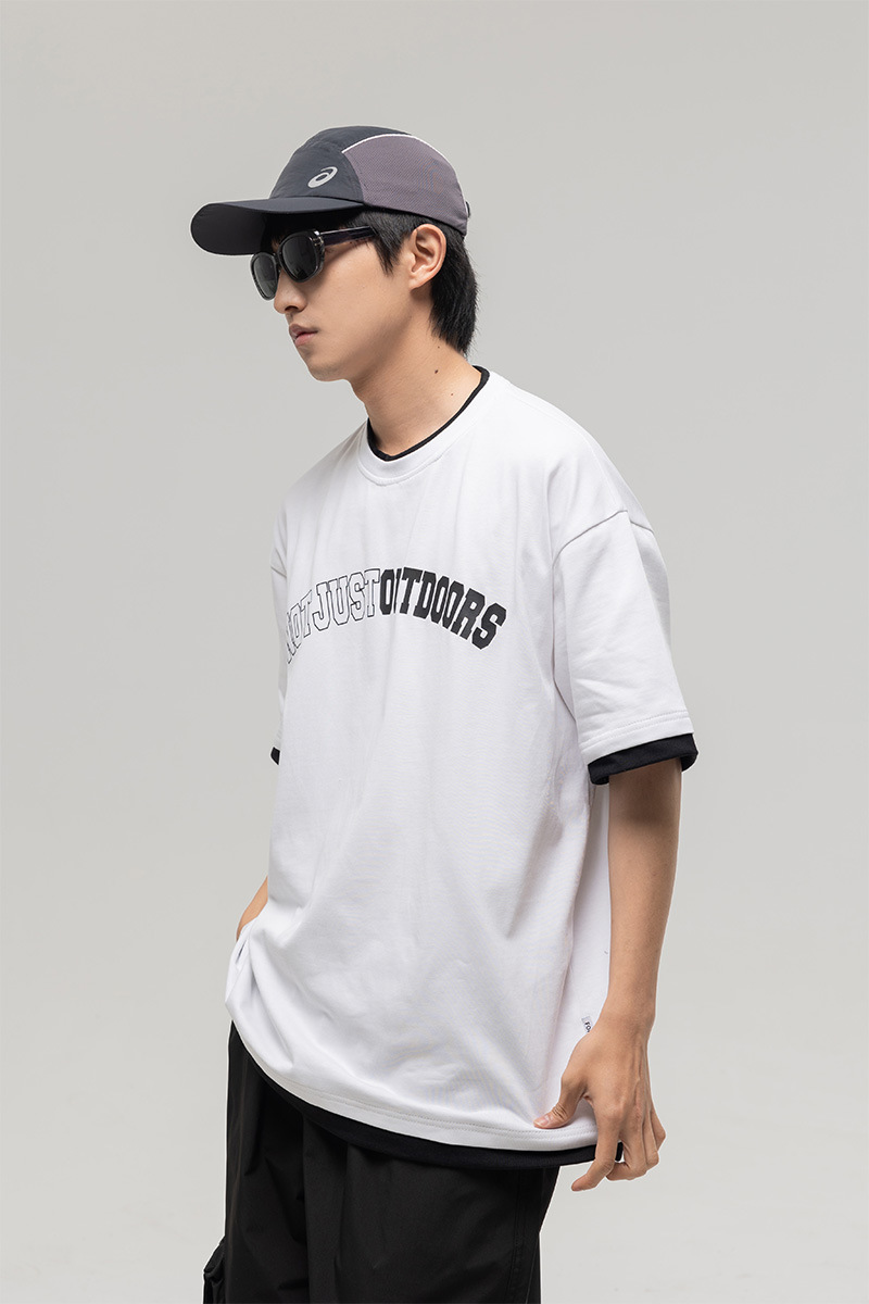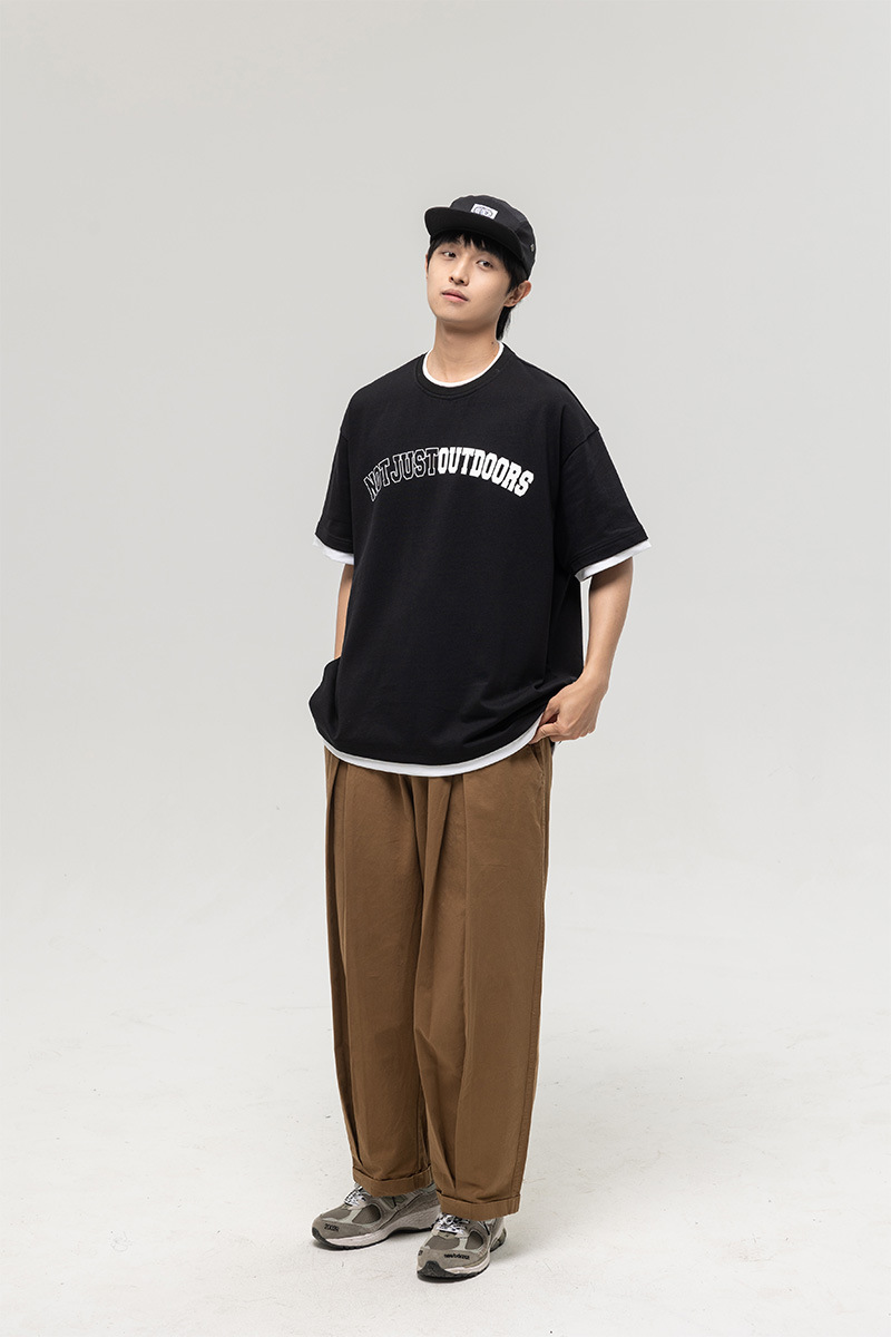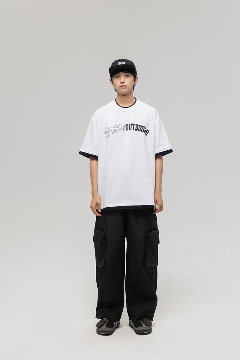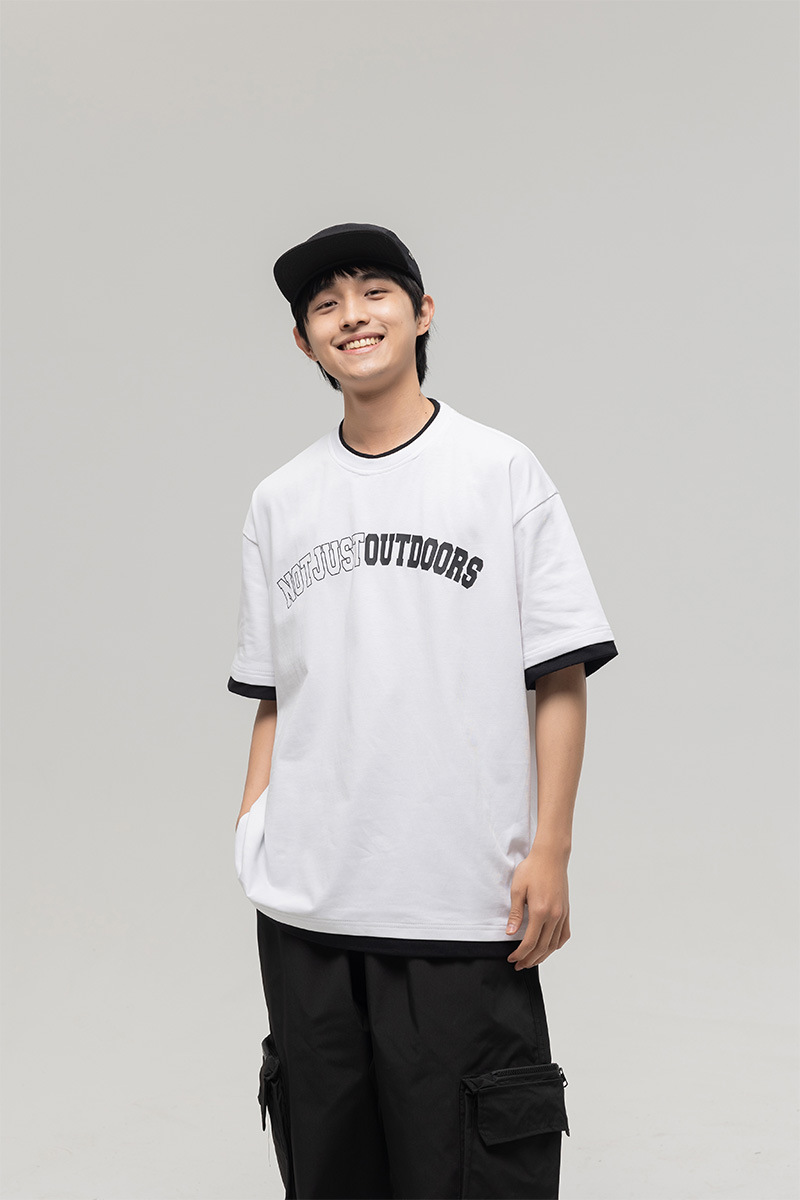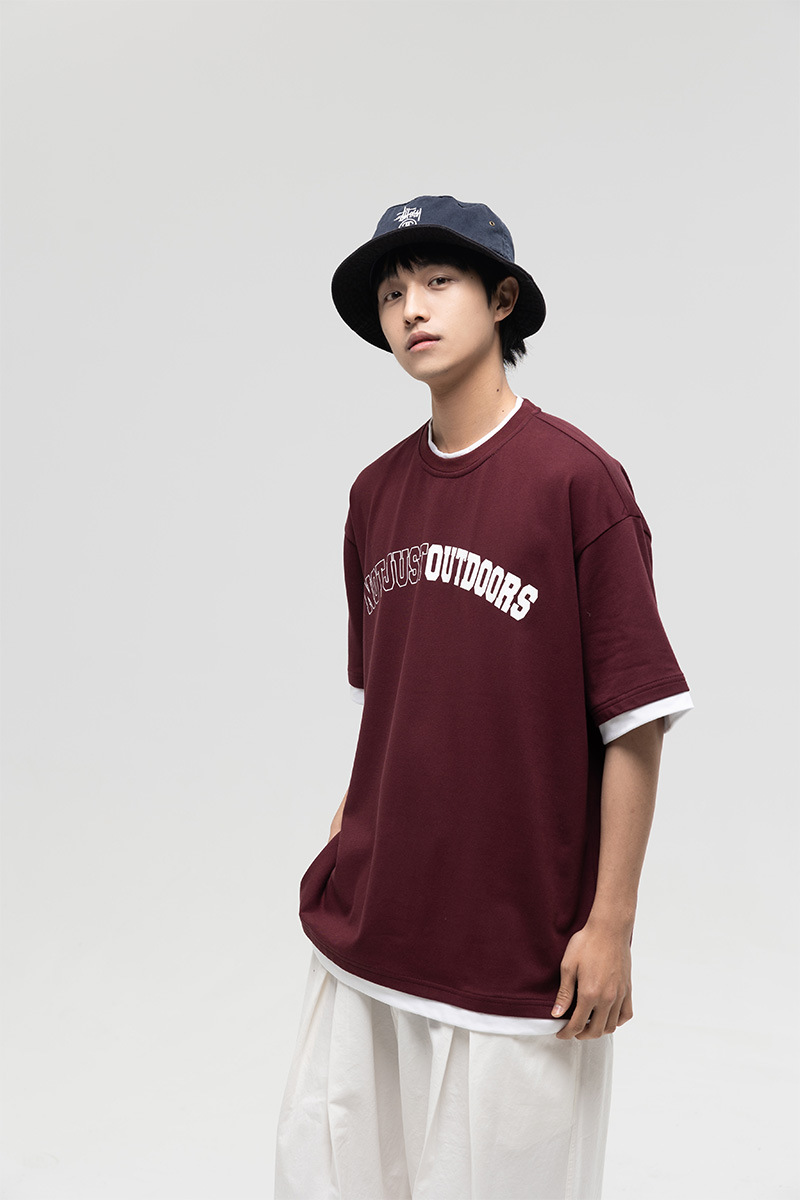 ATBORDER 여름 신작 솔리드 컬러 레터 프린트 라운드 넥 티셔츠 남성용 일본 패션 가짜 투피스 반팔 루즈스토어 가기