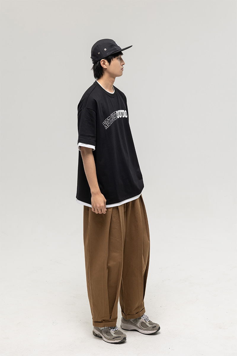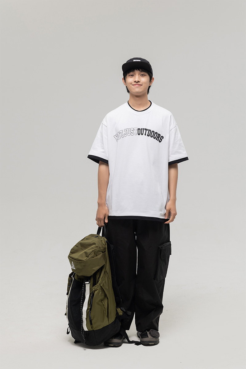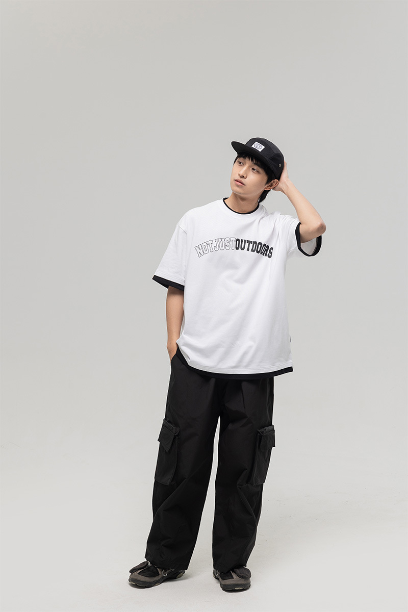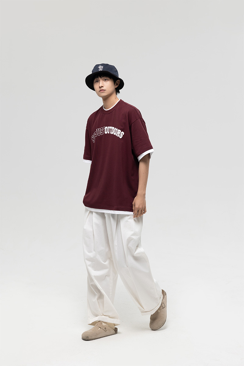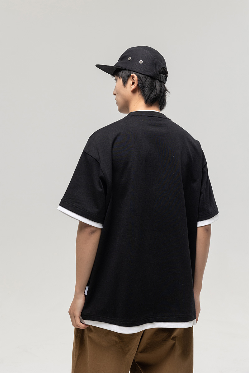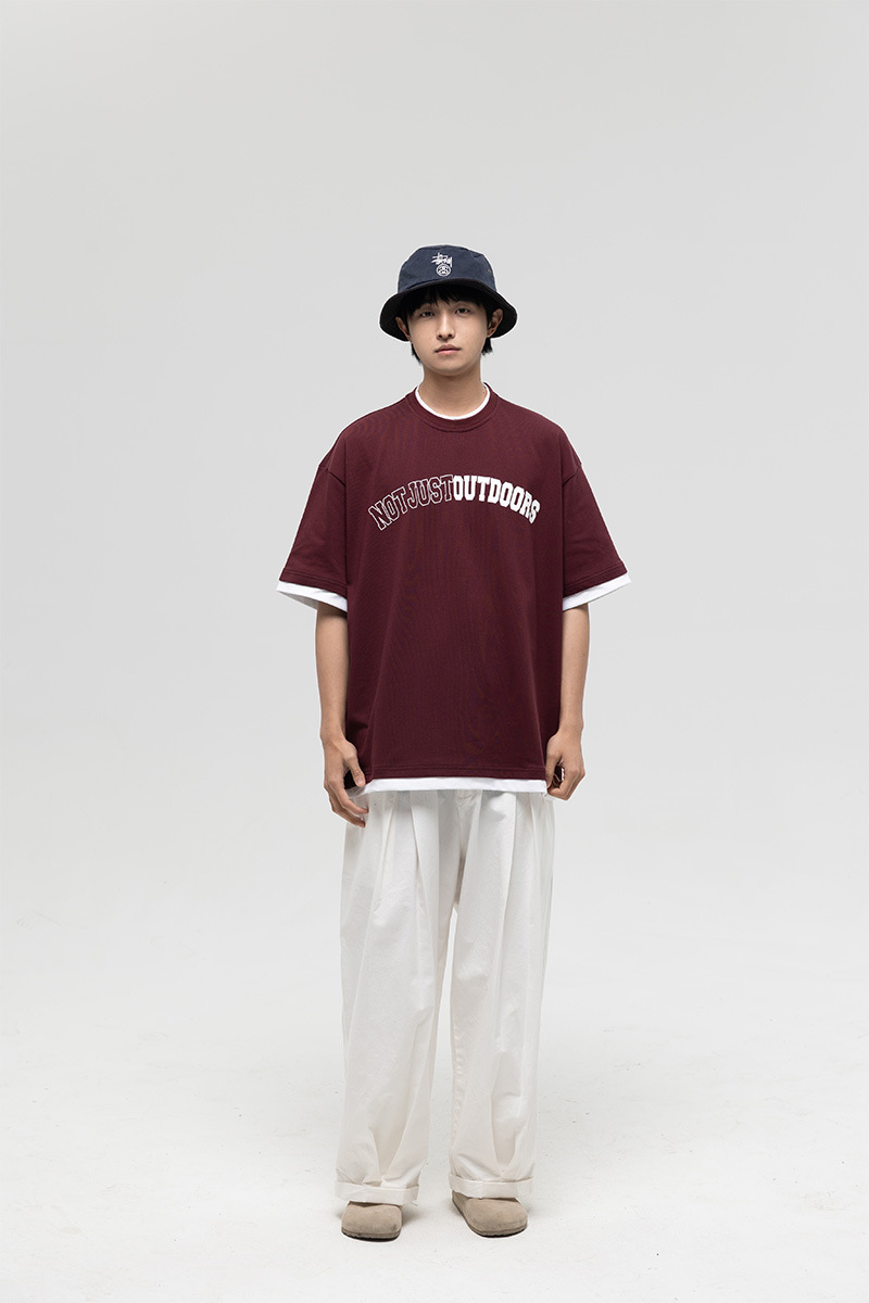 ATBORDER 여름 신작 솔리드 컬러 레터 프린트 라운드 넥 티셔츠 남성용 일본 패션 가짜 투피스 반팔 루즈스토어 가기