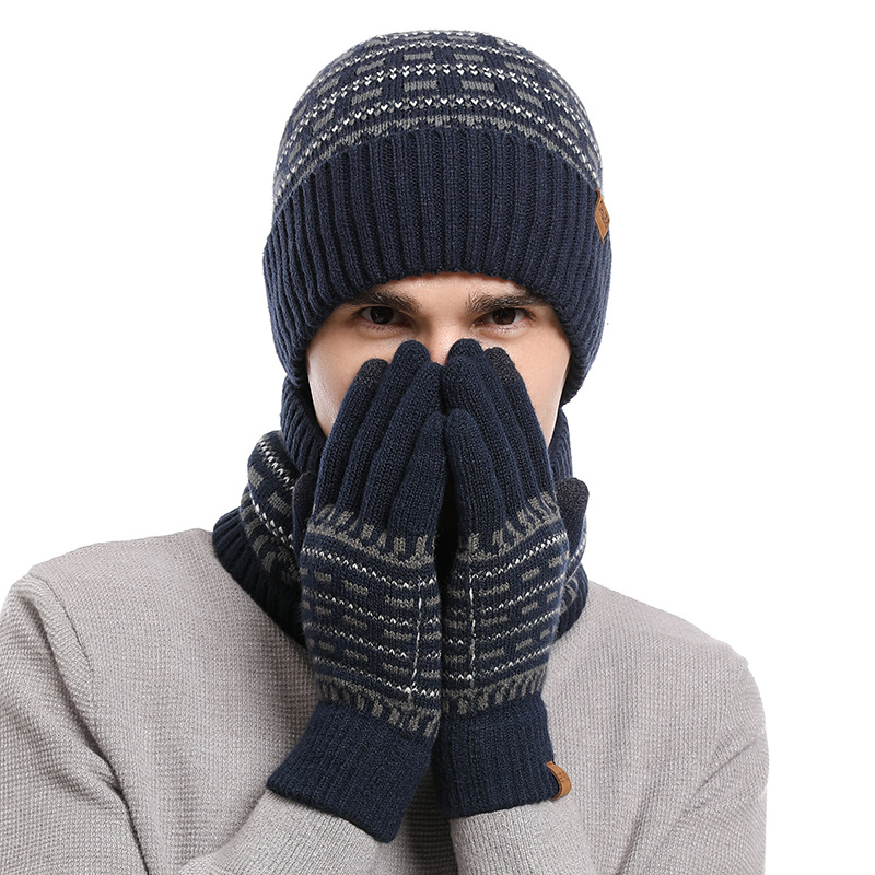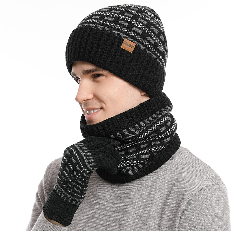 유럽과 미국 사이로 수출되는 가을 겨울 남성용 따뜻한 모직 모자, 두꺼운 니트 방한 성인 모자, 스카프, 장갑 3종 세트스토어 가기