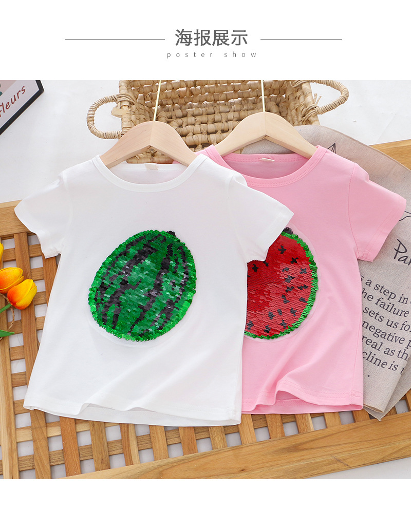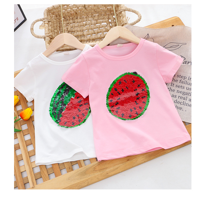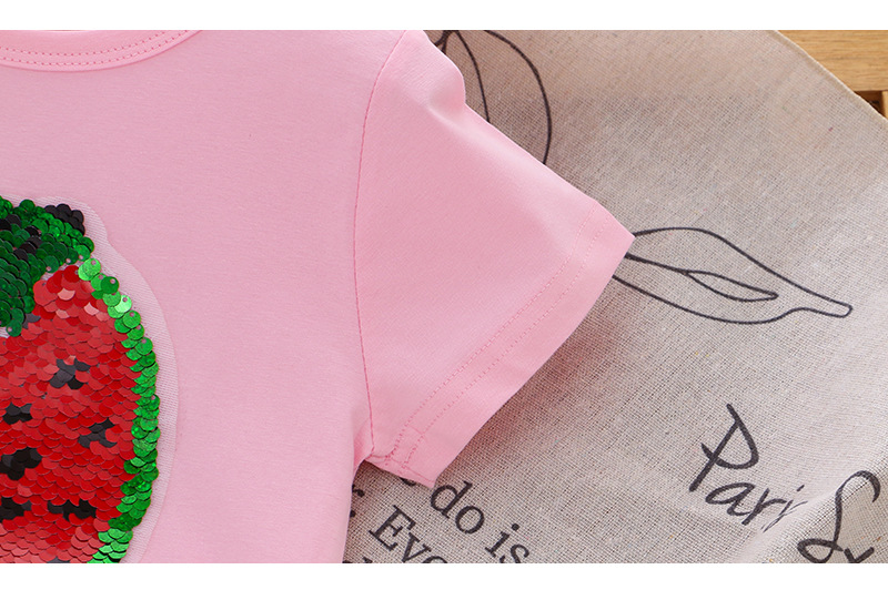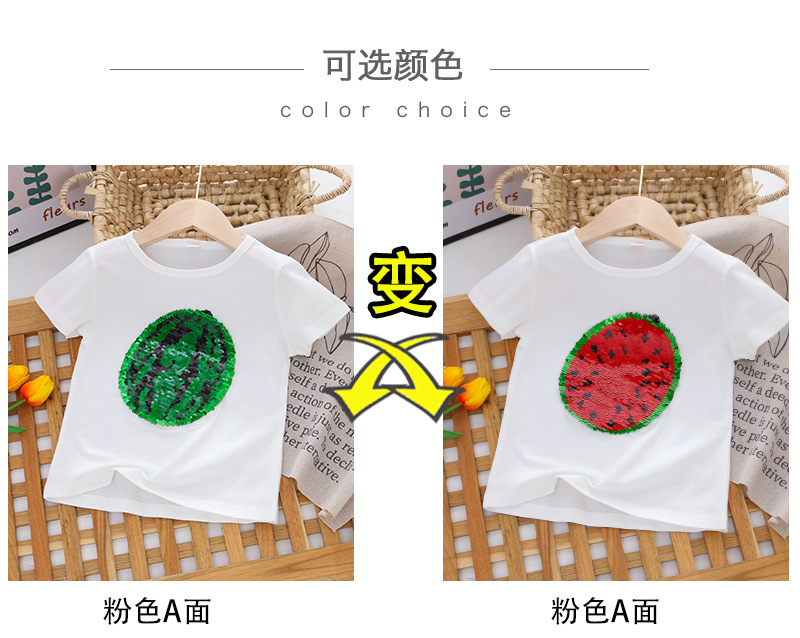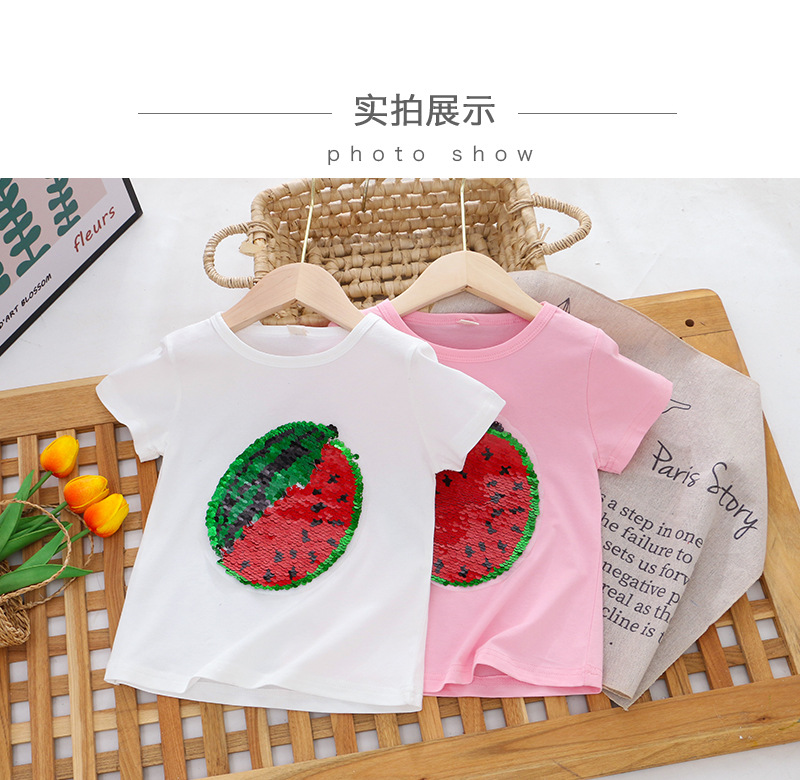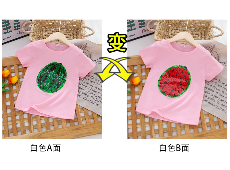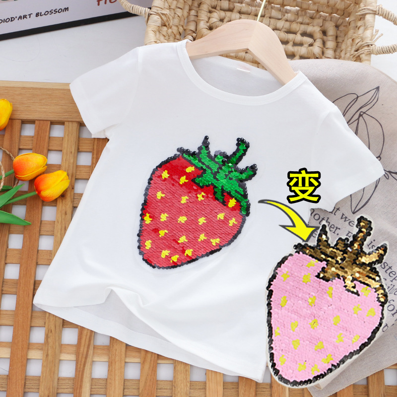 여자 반팔 티셔츠 아동 의류 여름 어린 소녀 딸기 색상 변경 스팽글 티셔츠 아동상의 코튼 라이브 방송 드롭 배송