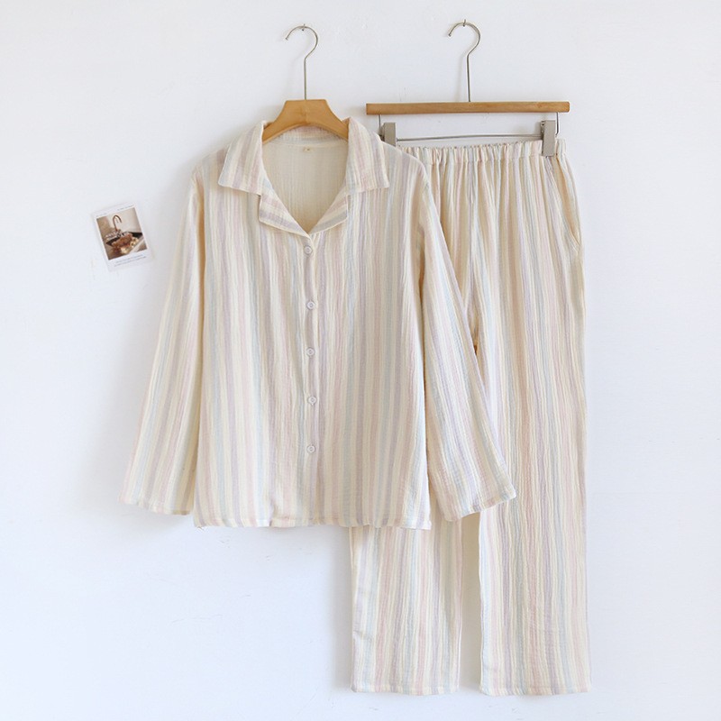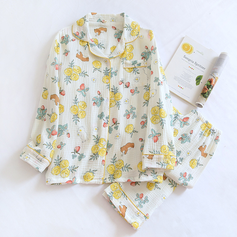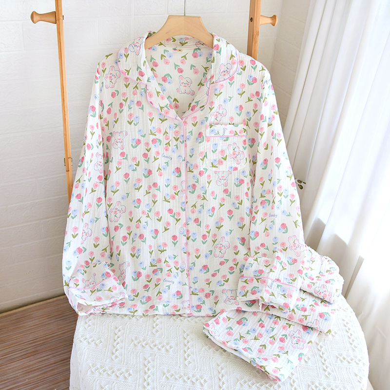 봄과 여름 새로운 면사 잠옷 꽃 바다 소녀 달콤한 스타일 홈 의류 카디건 잠옷 캐주얼 긴 소매 플러스 사이즈 세트