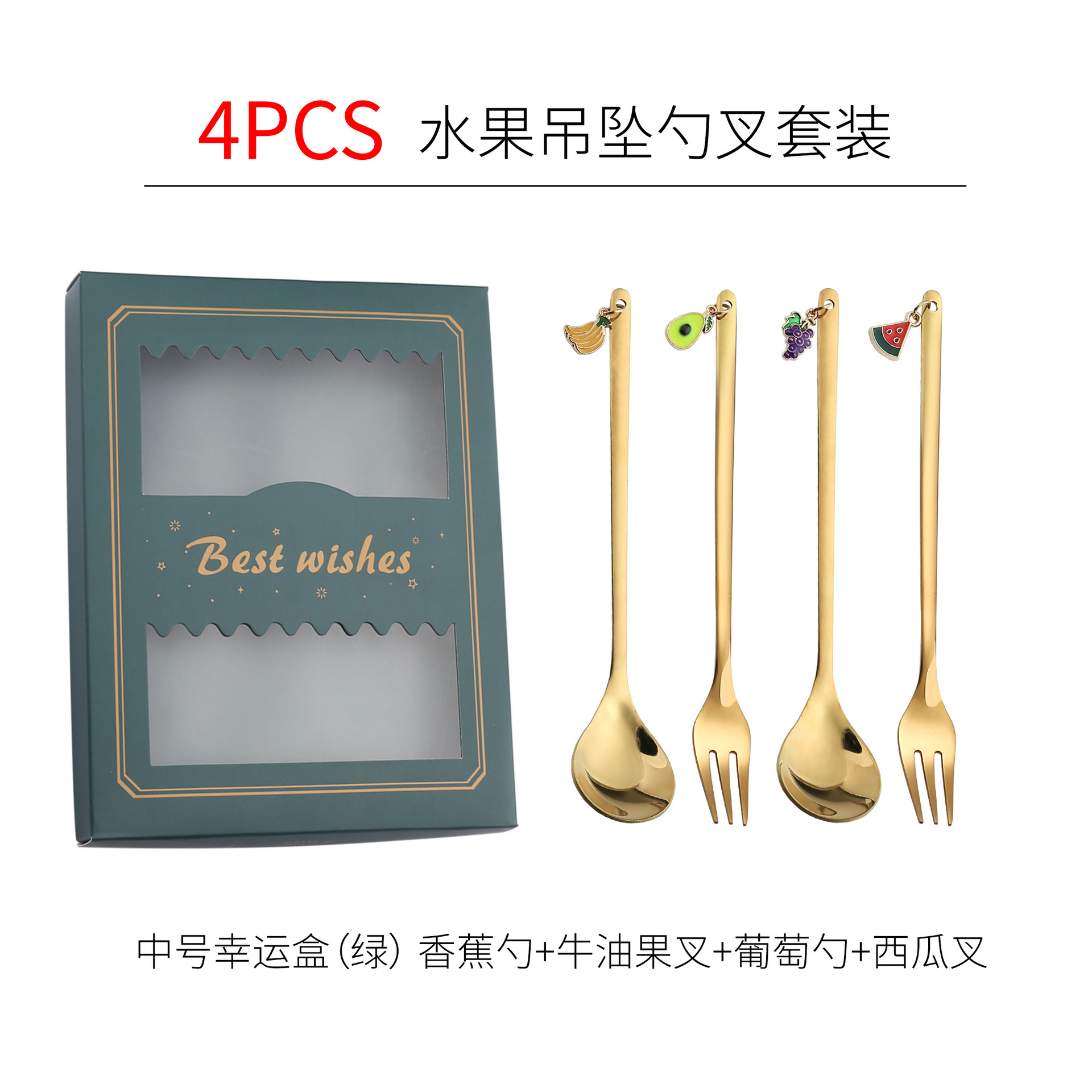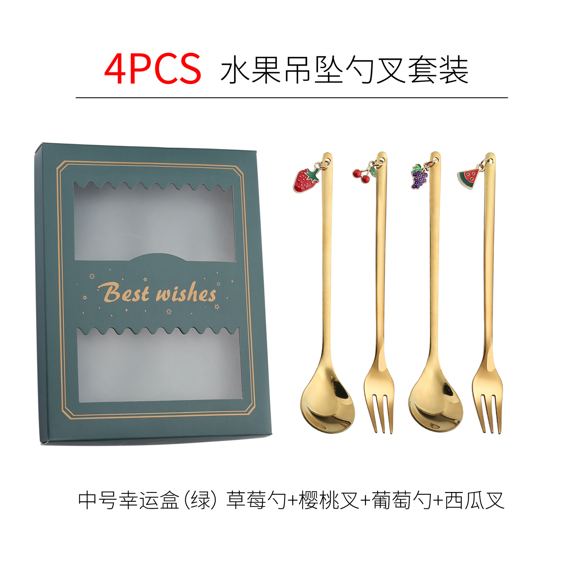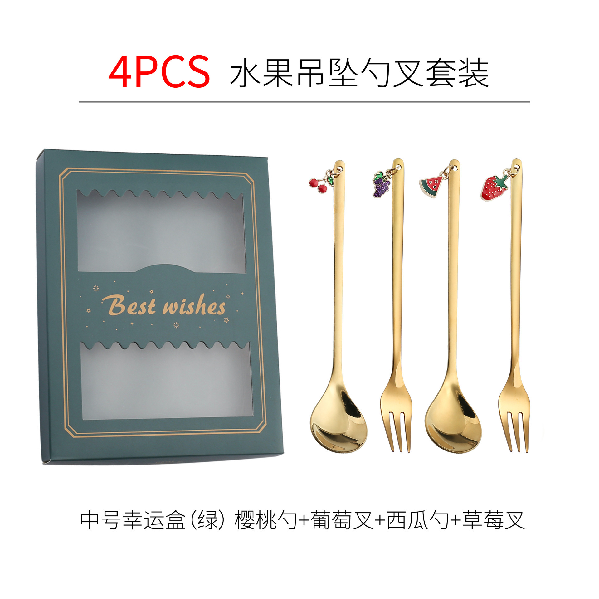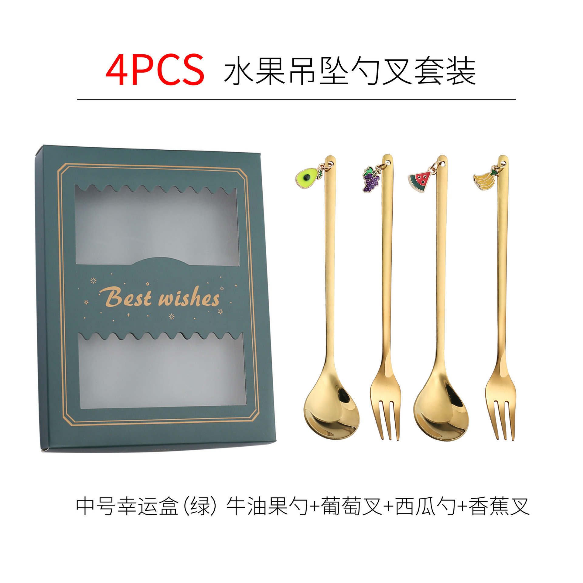 • 8: 티타늄 과일 펜던트 스푼 포크 4 세트-녹색 상자