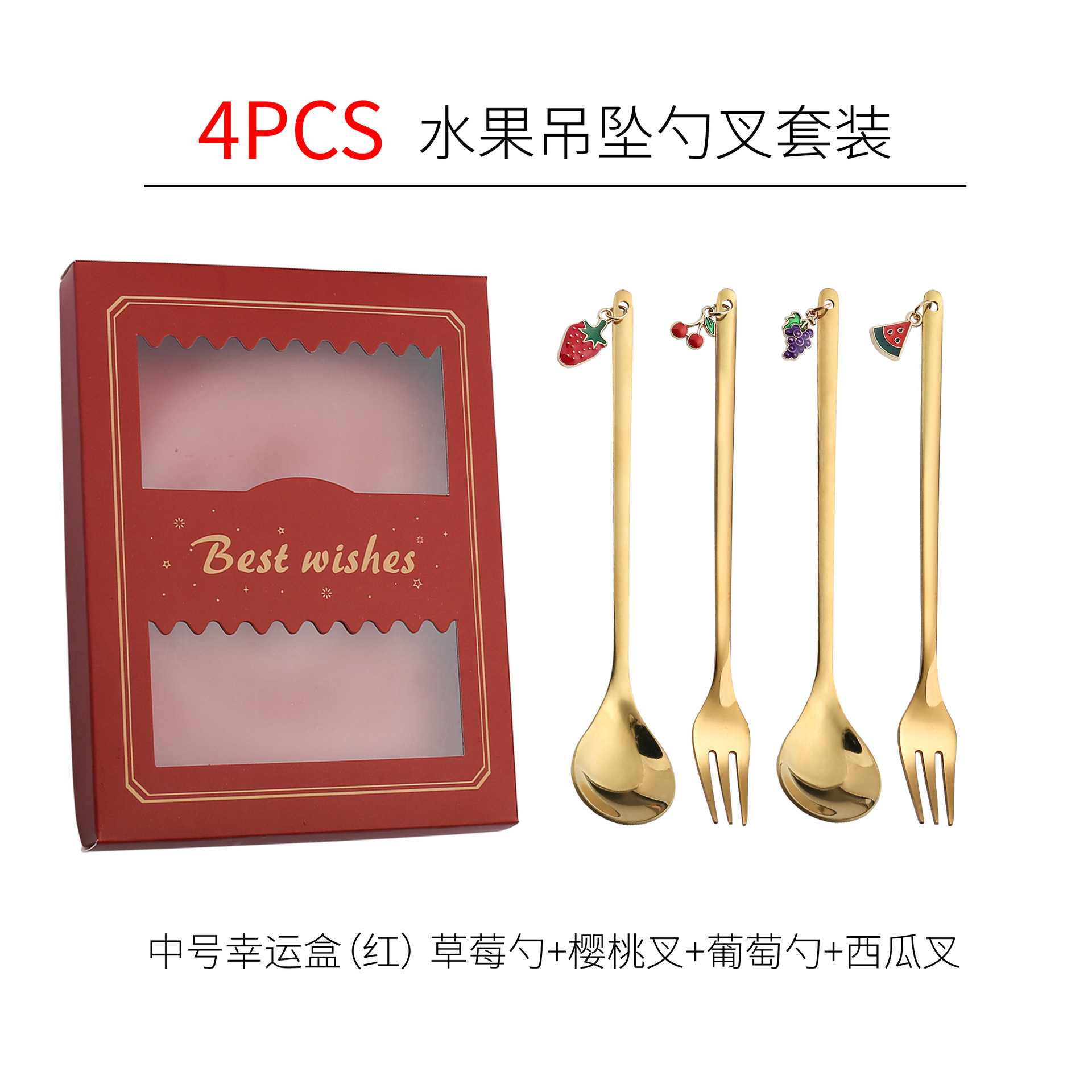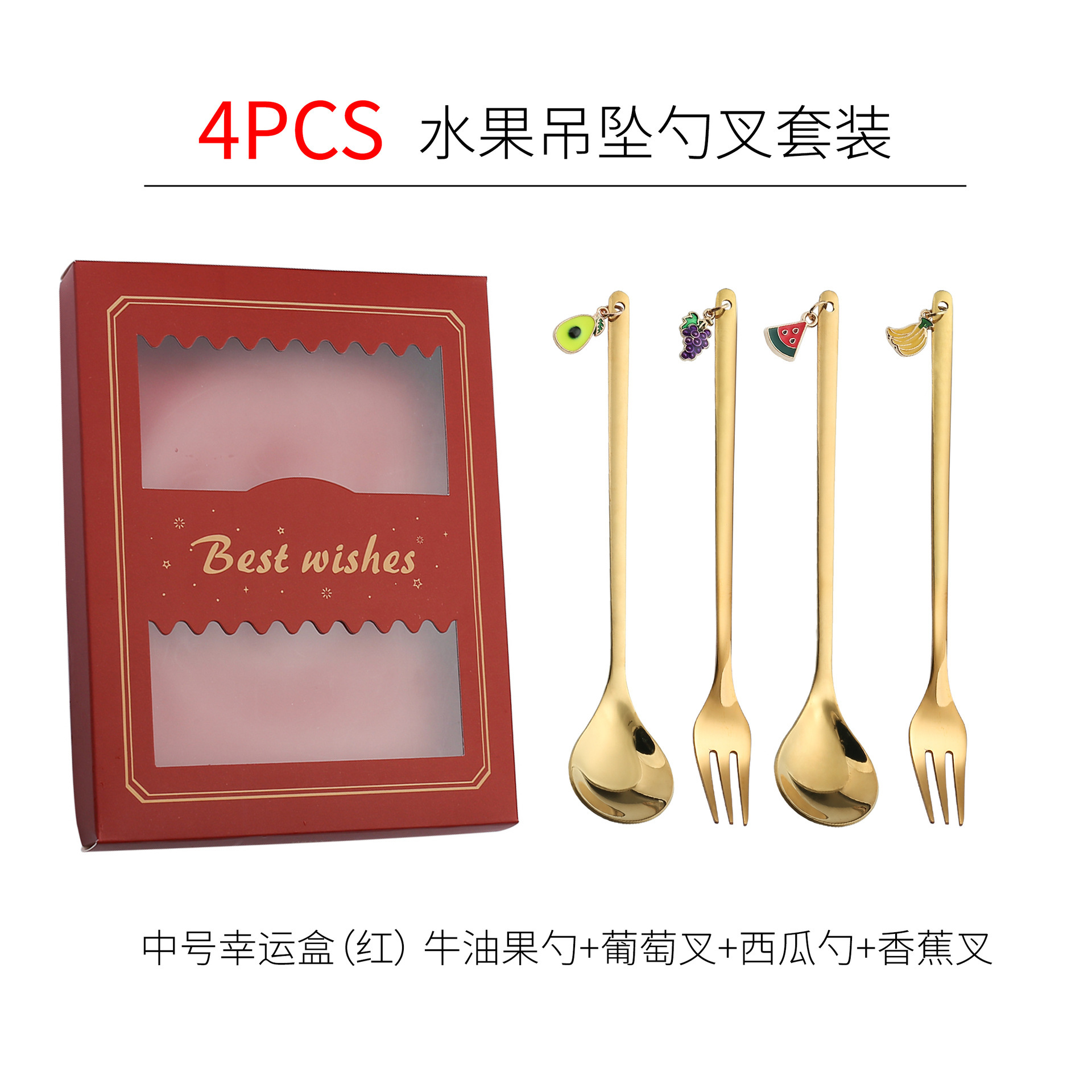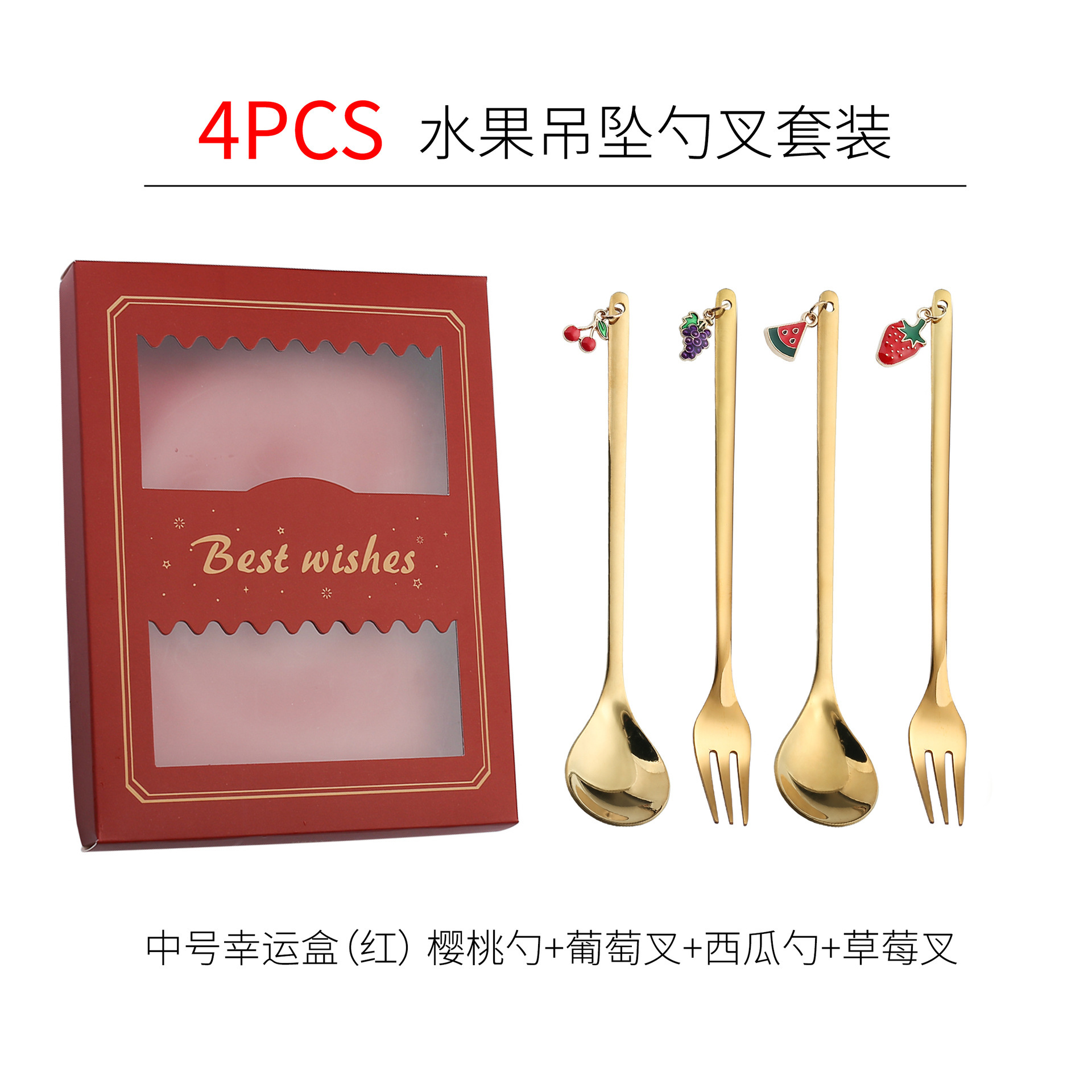 • 경기 7: 티타늄 과일 펜던트 스푼 포크 4 세트-레드 박스