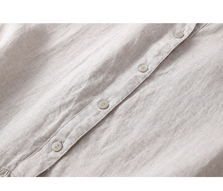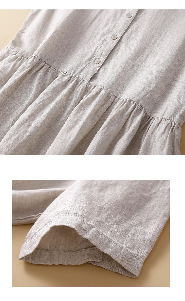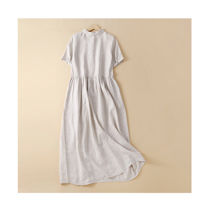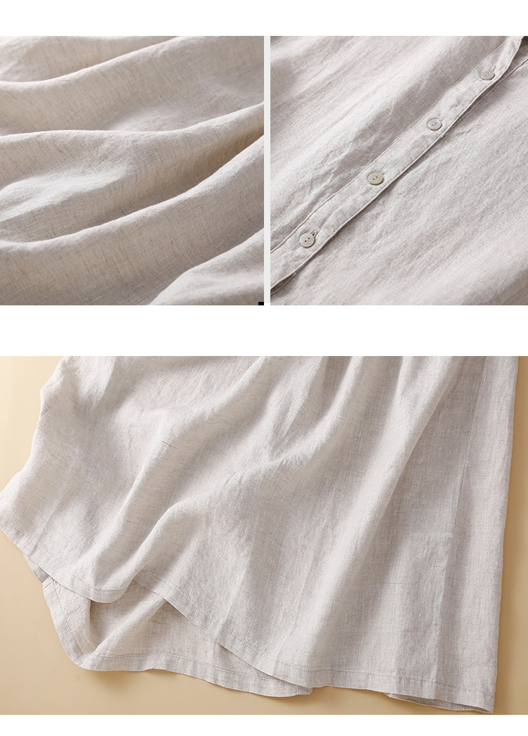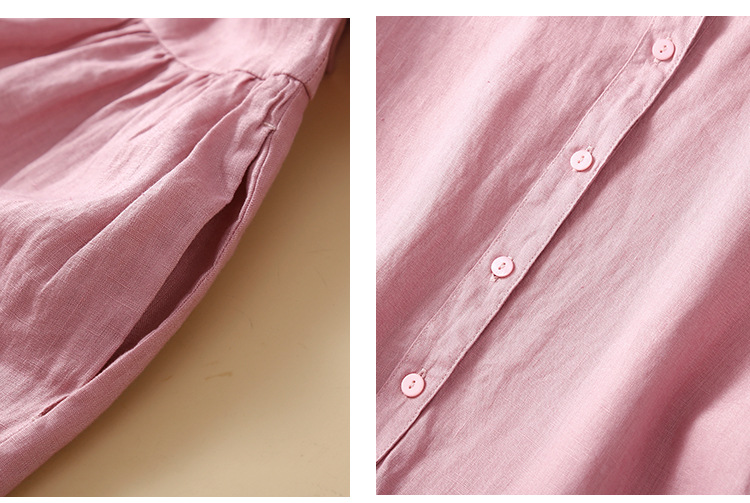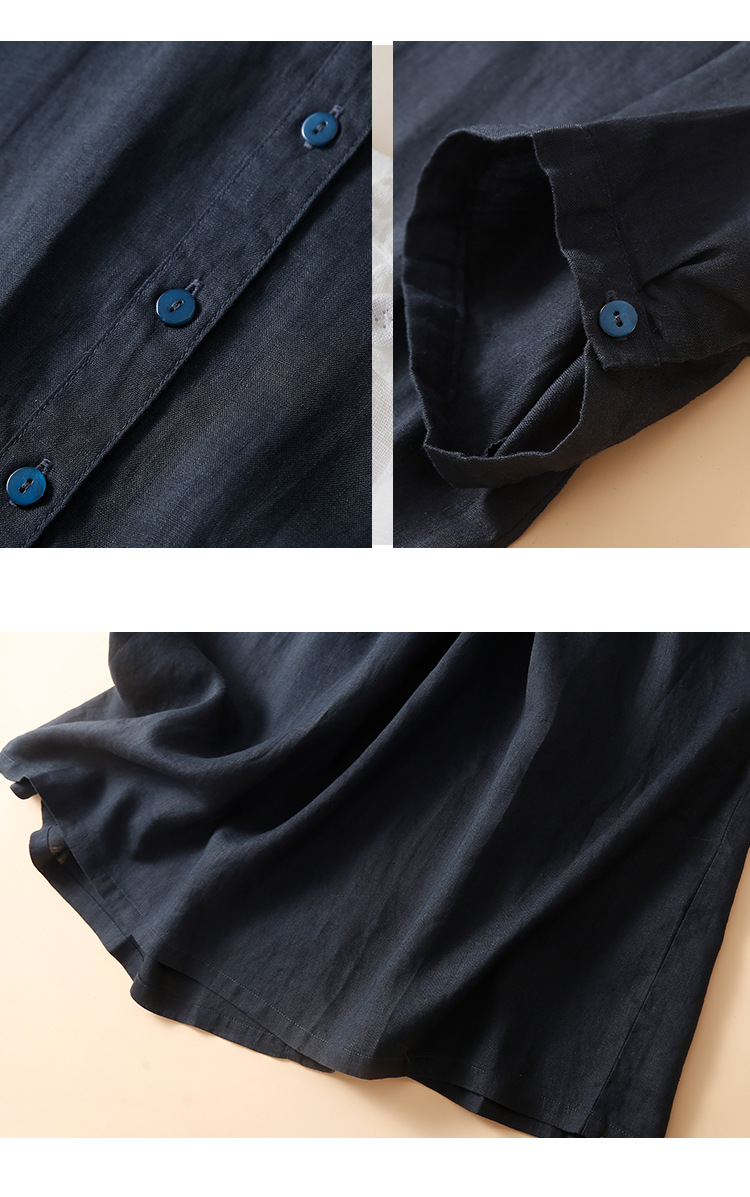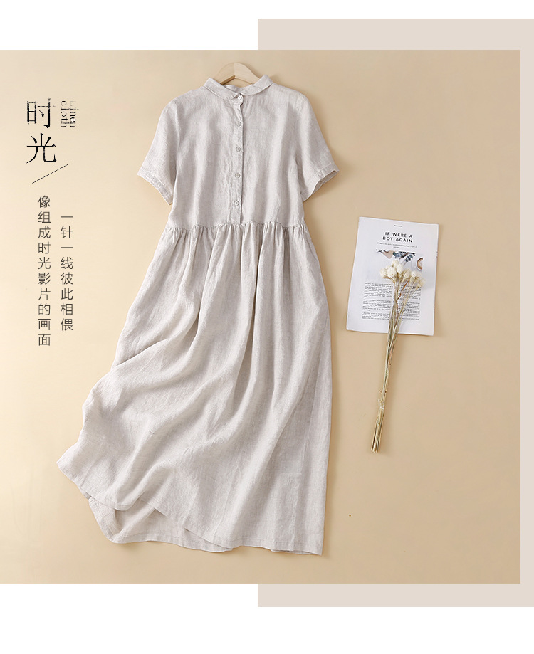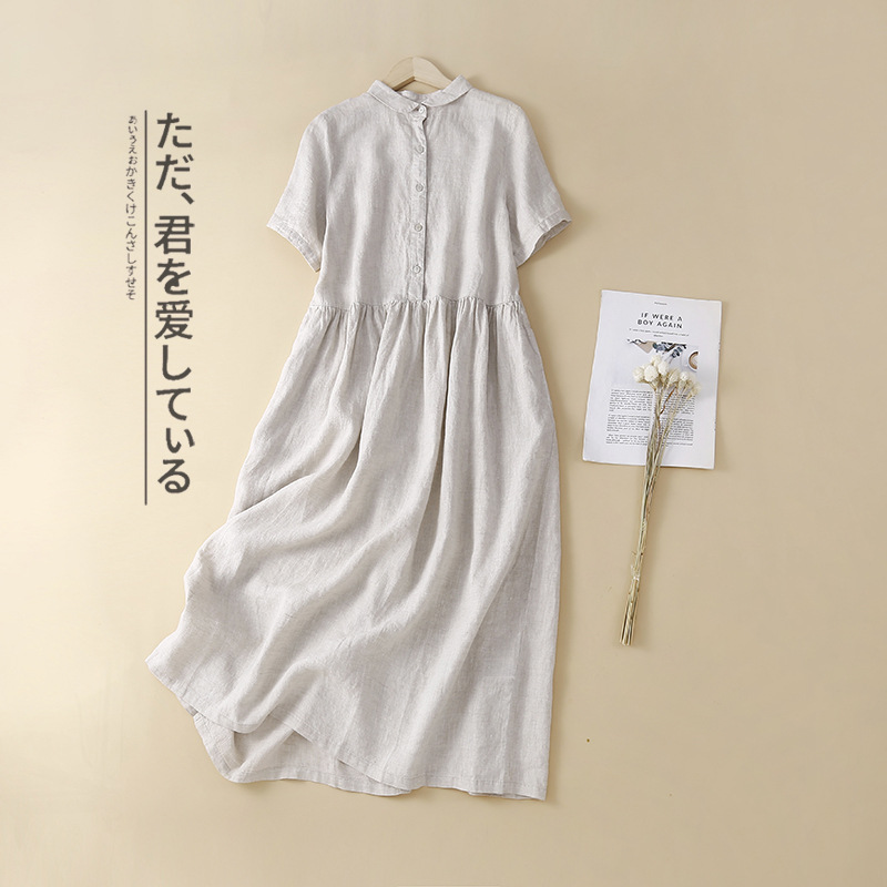 실제 사진 2025 새로운 여름 스타일 문학 느슨한 접합 솔리드 컬러 코튼과 린넨 반팔 드레스 여성 중간 길이 셔츠 드레스스토어 가기
