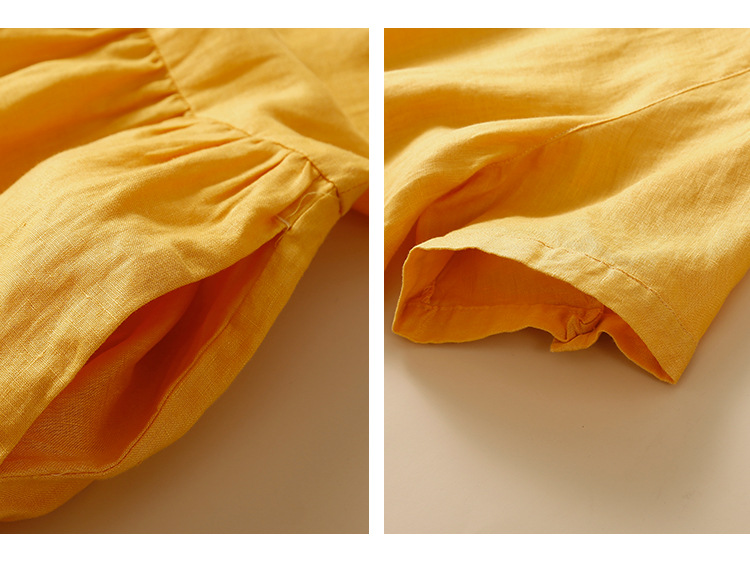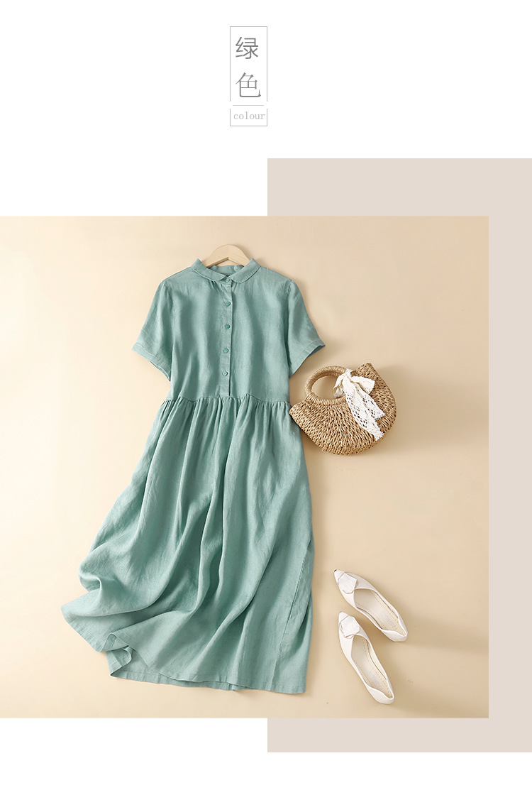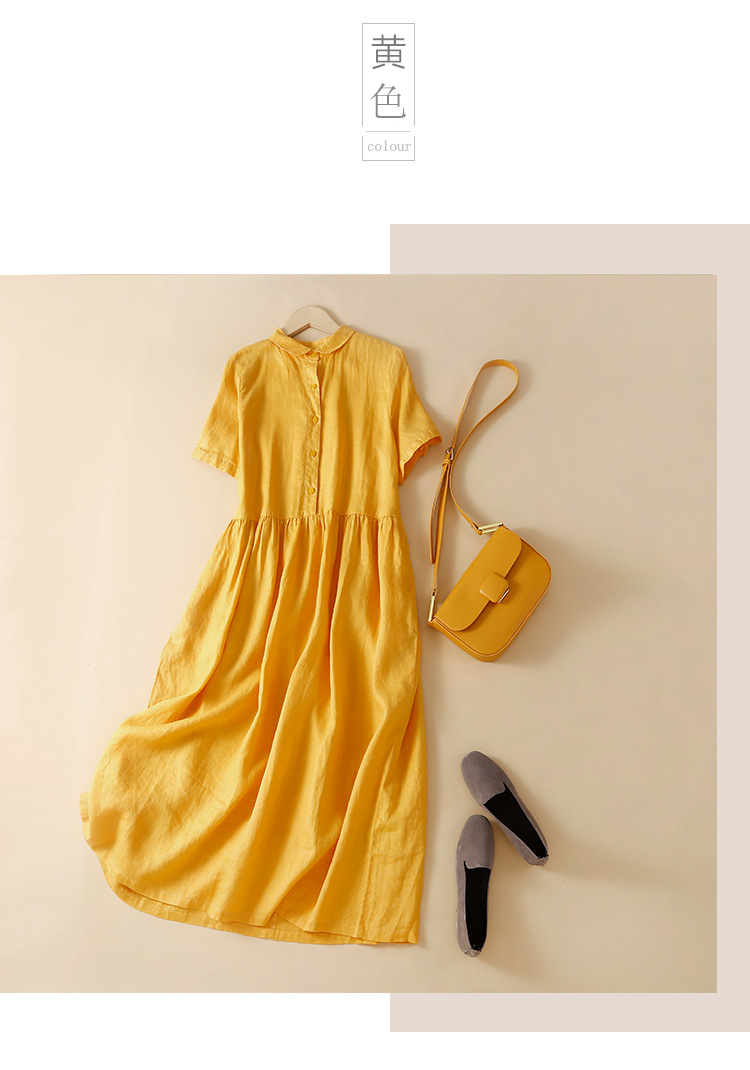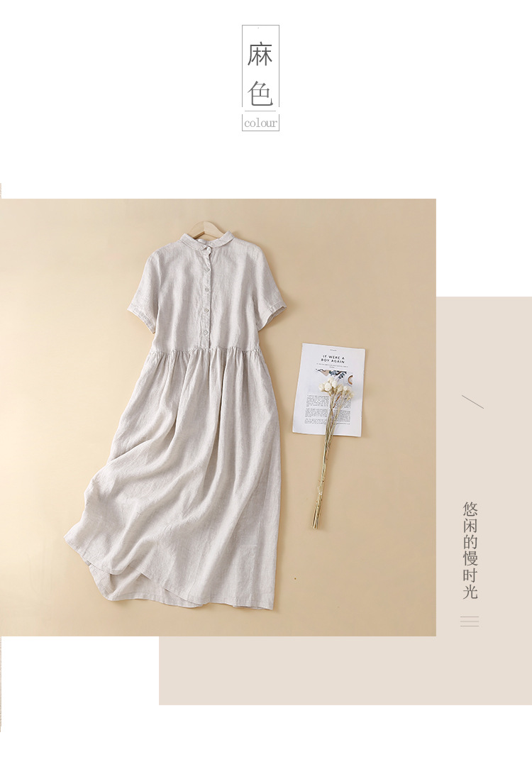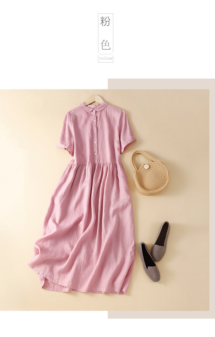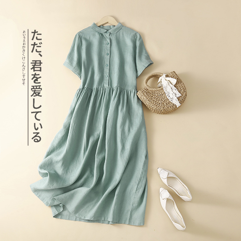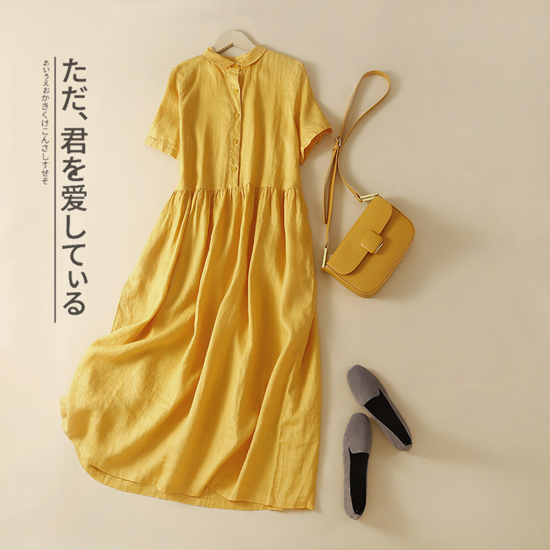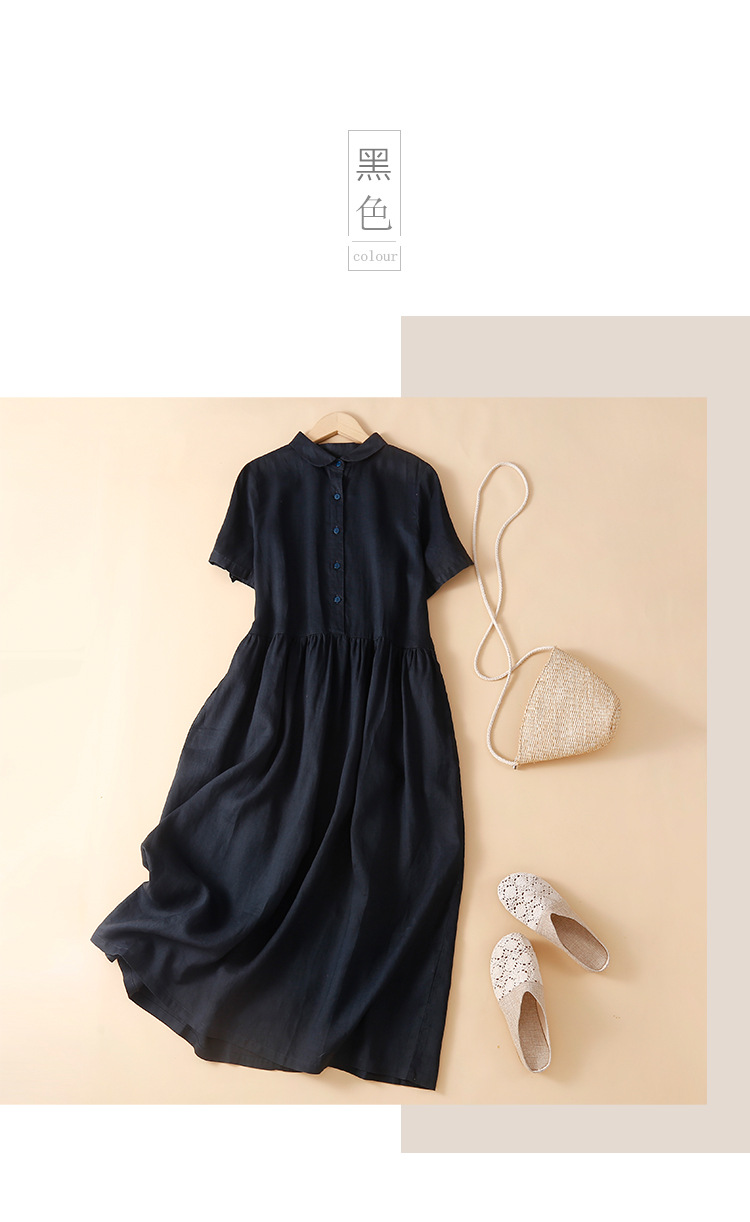 실제 사진 2025 새로운 여름 스타일 문학 느슨한 접합 솔리드 컬러 코튼과 린넨 반팔 드레스 여성 중간 길이 셔츠 드레스