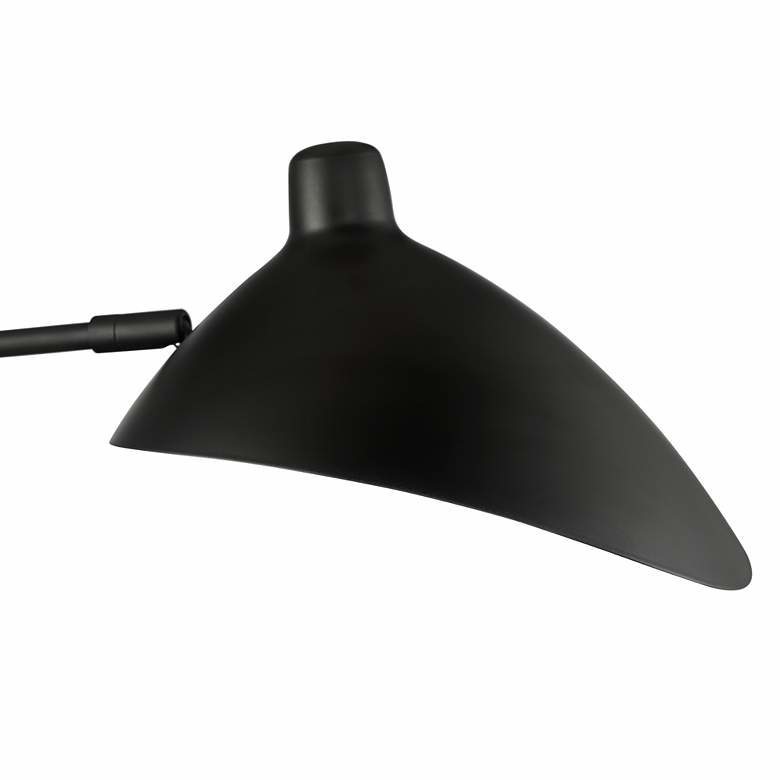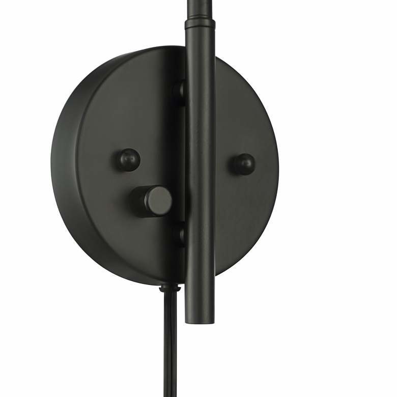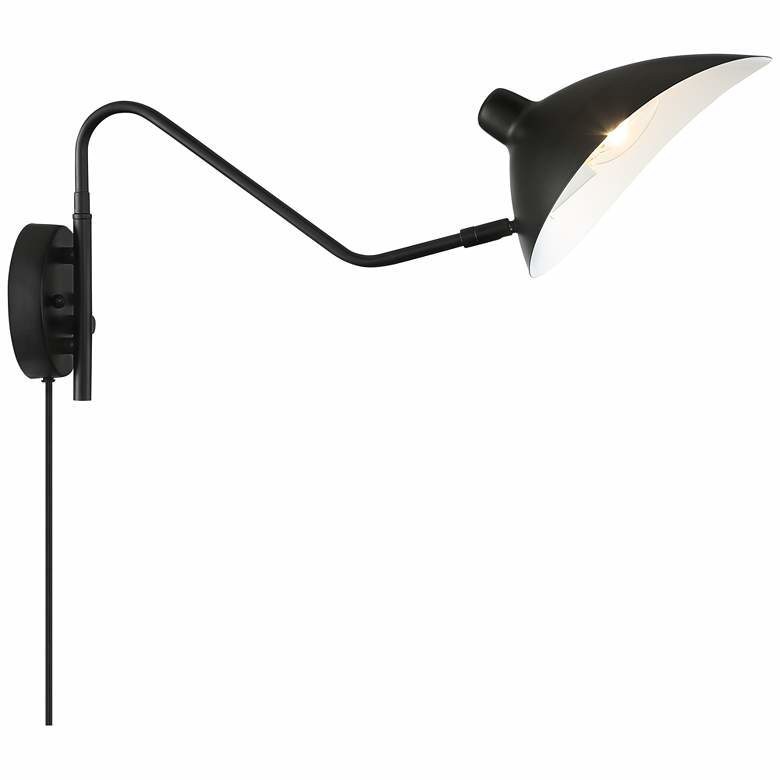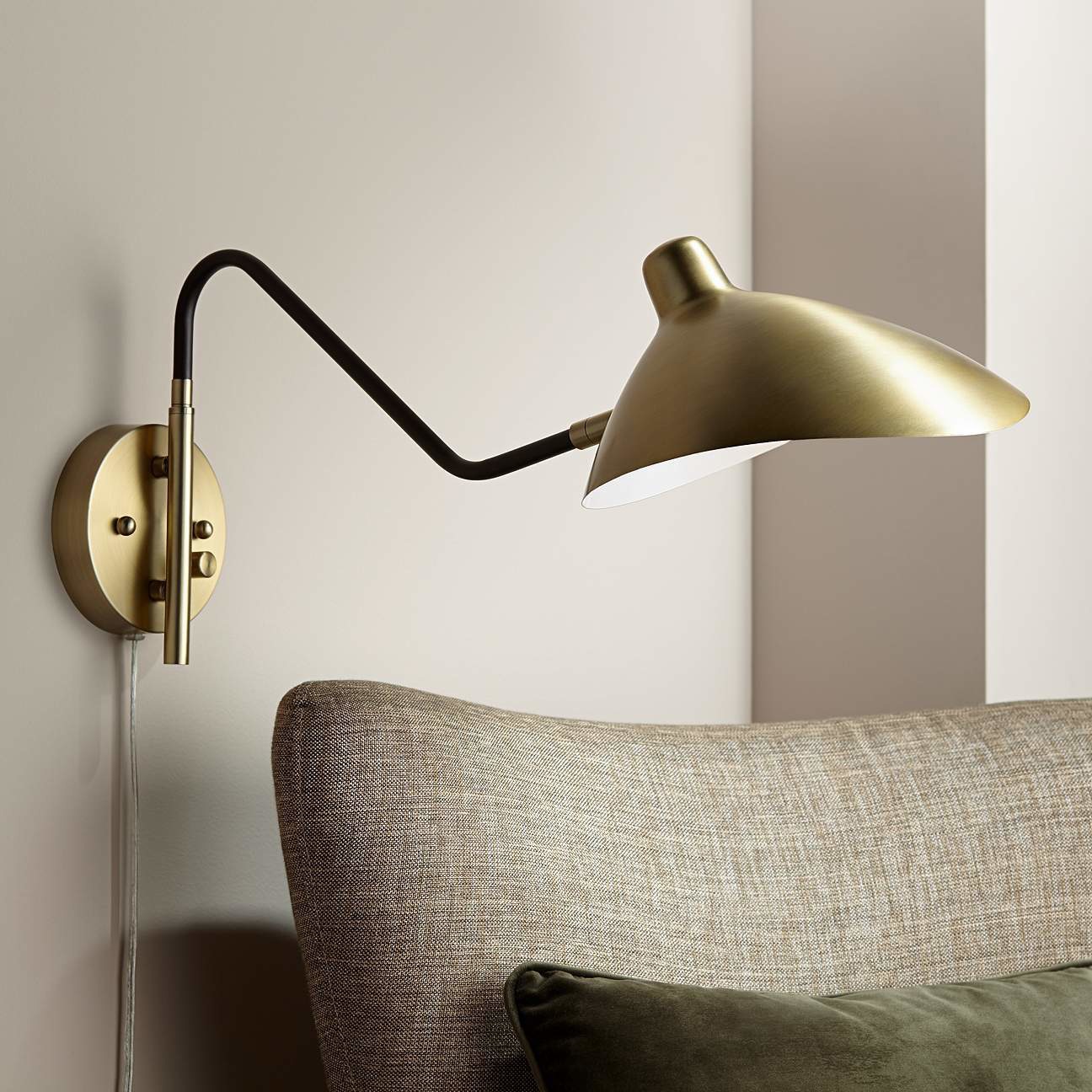 可调节摇臂插入式壁灯上的不对称灯罩与漂亮的古董黄铜和黑色饰面相得益彰。