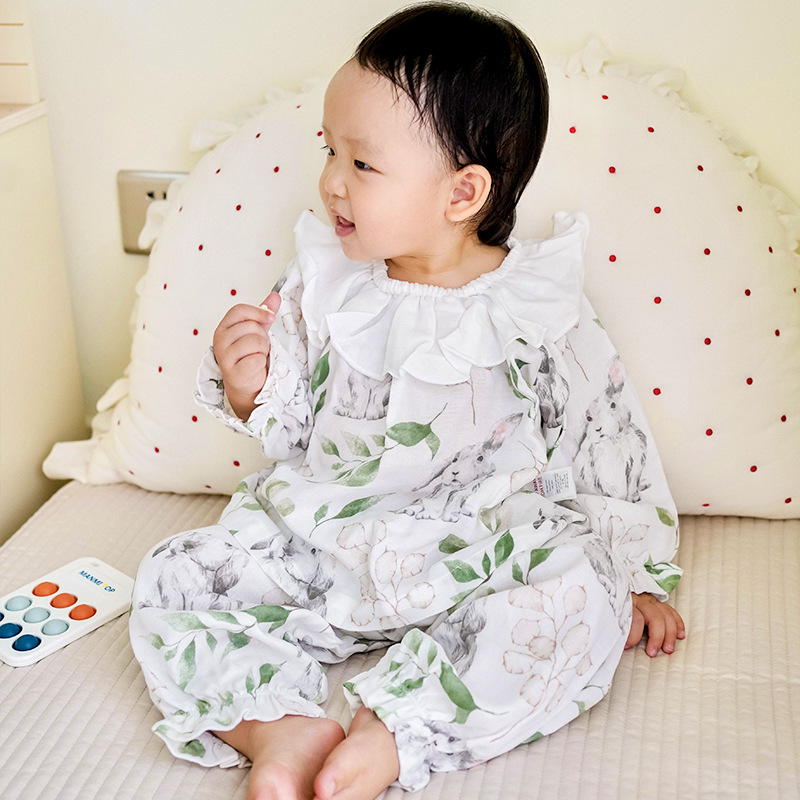 아기 홈웨어 세트, 긴팔 긴바지, 외출복, 여아 잠옷, 아기 대나무 면 거즈옷, 외부에서 착용 가능