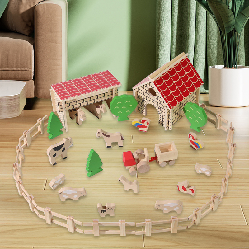 迷你家庭农场娃娃房子儿童木质动物奶牛小狗围栏宝宝拼装积木玩具