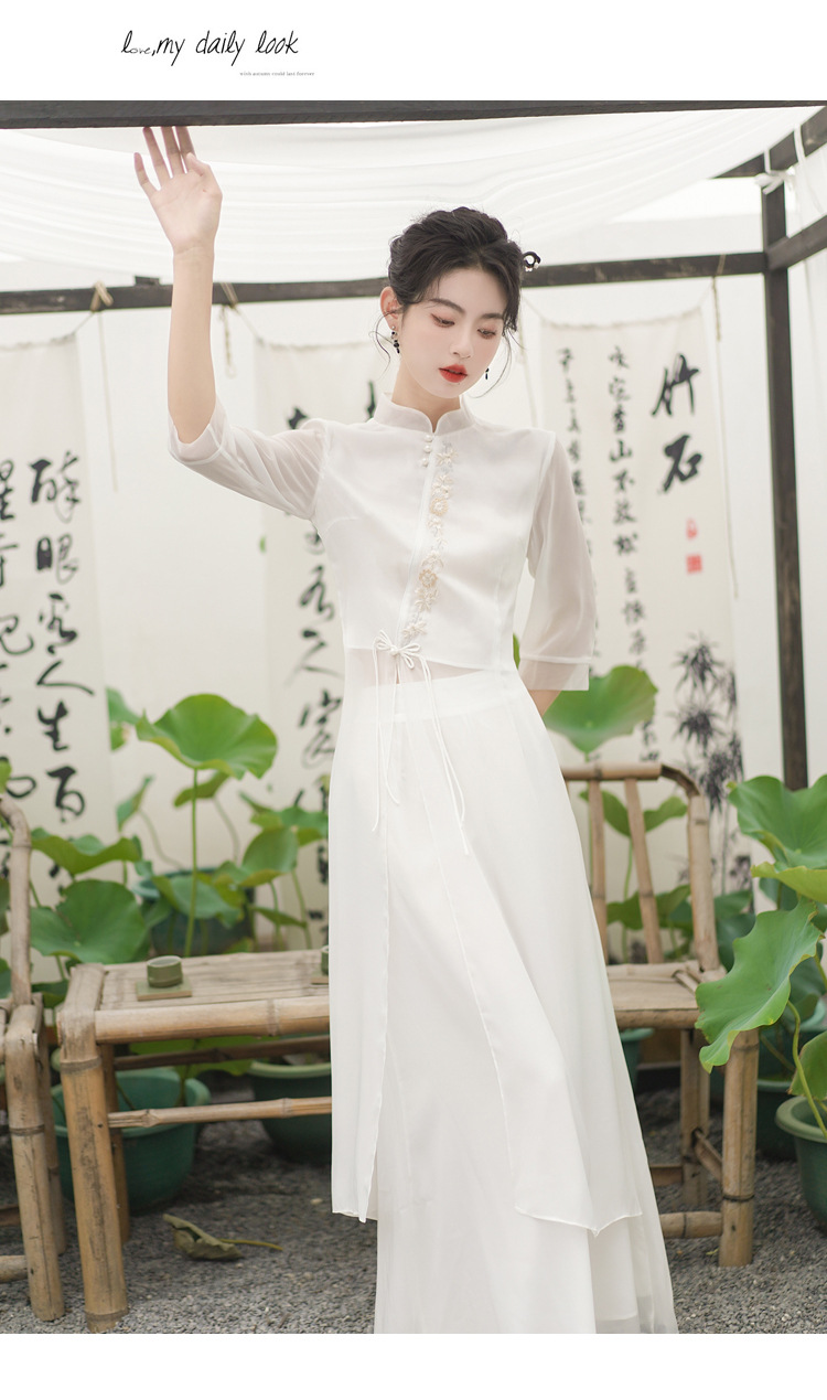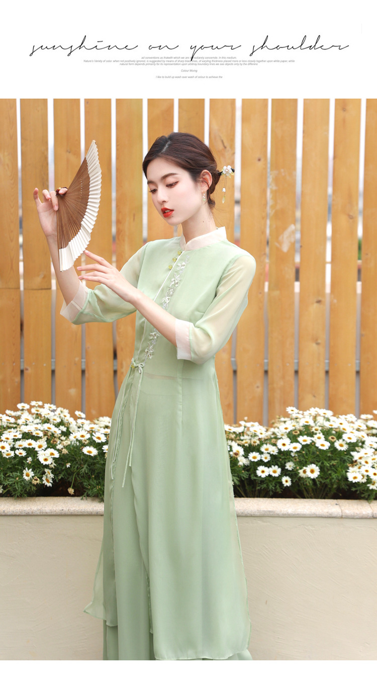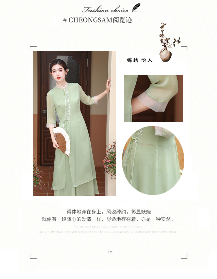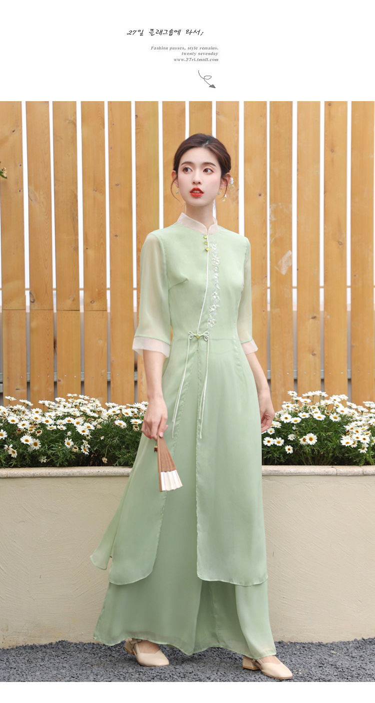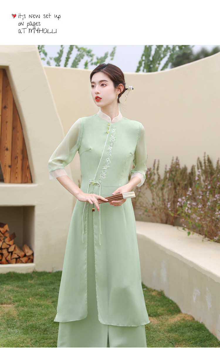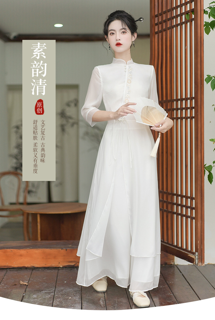 2023 여름 복고풍 새로운 중국 스타일 개선 치파오 빛 소녀의 차 세트 단색 7 점 슬리브 원피스 세트스토어 가기