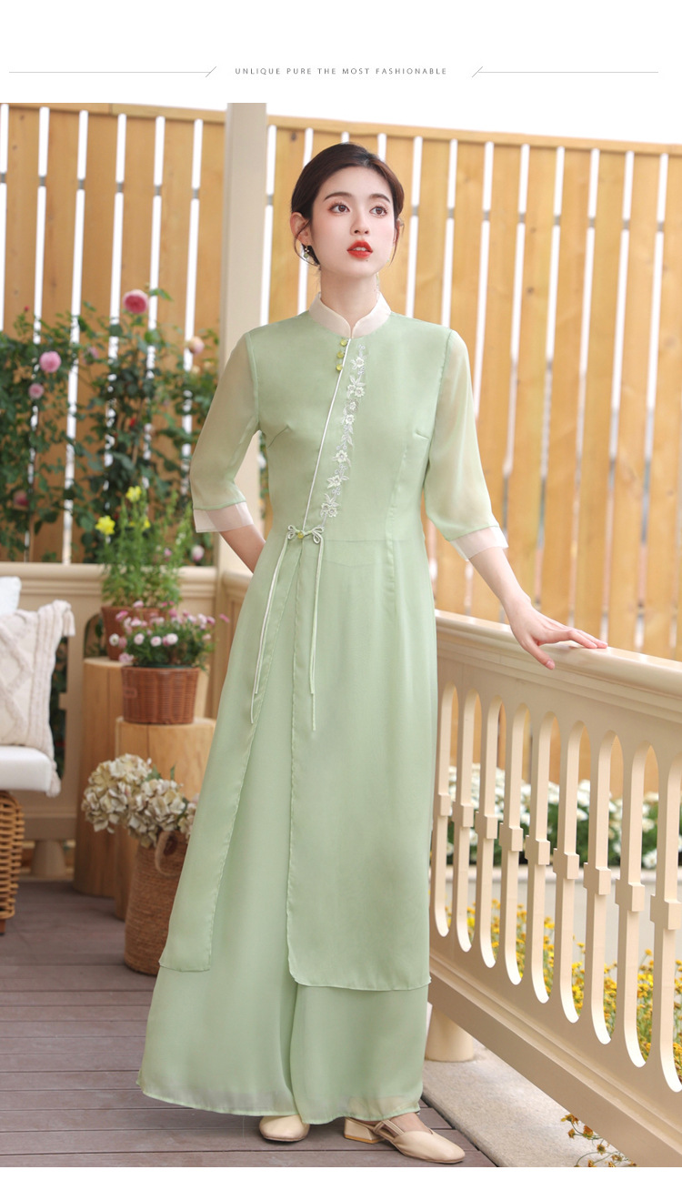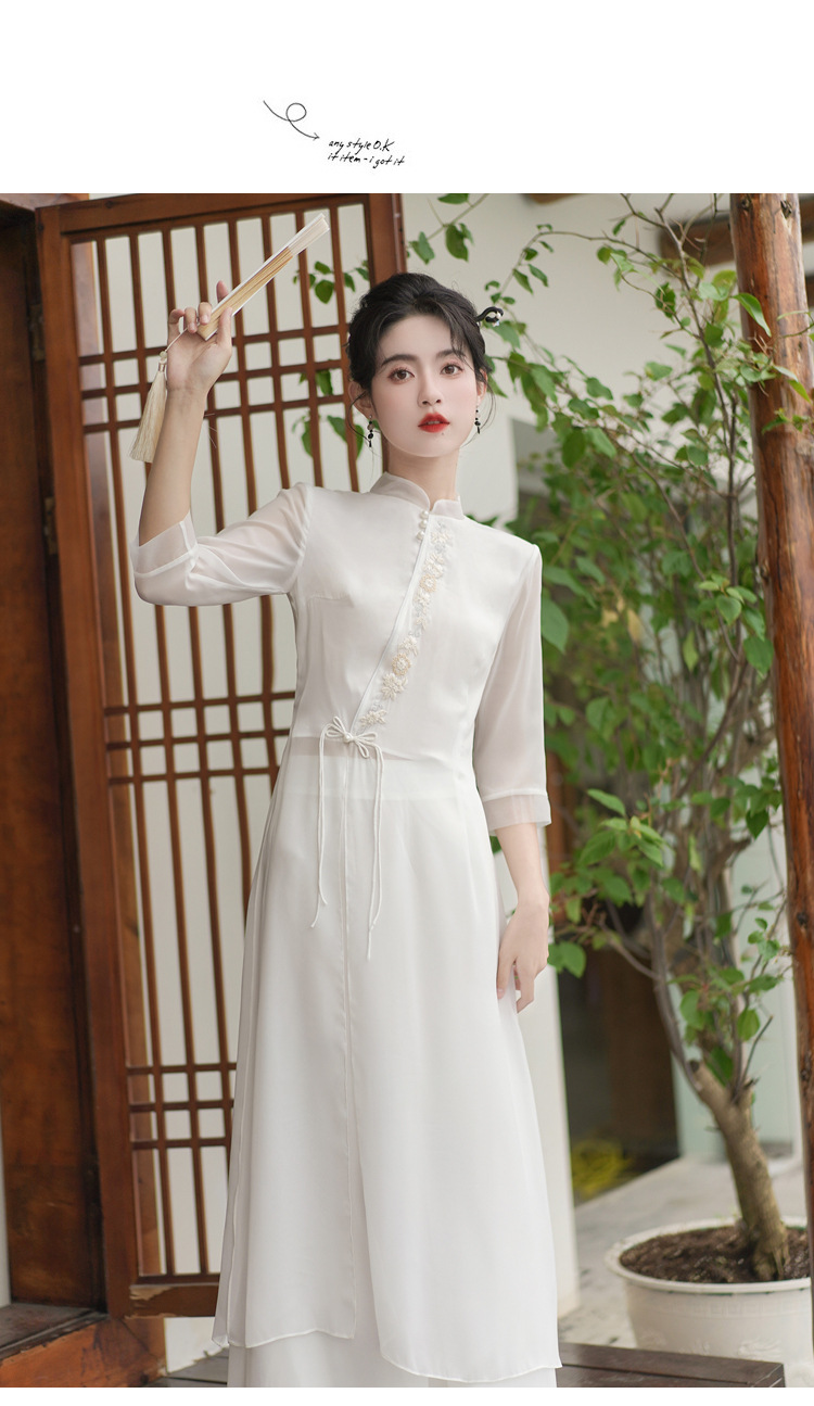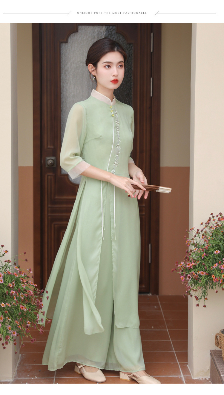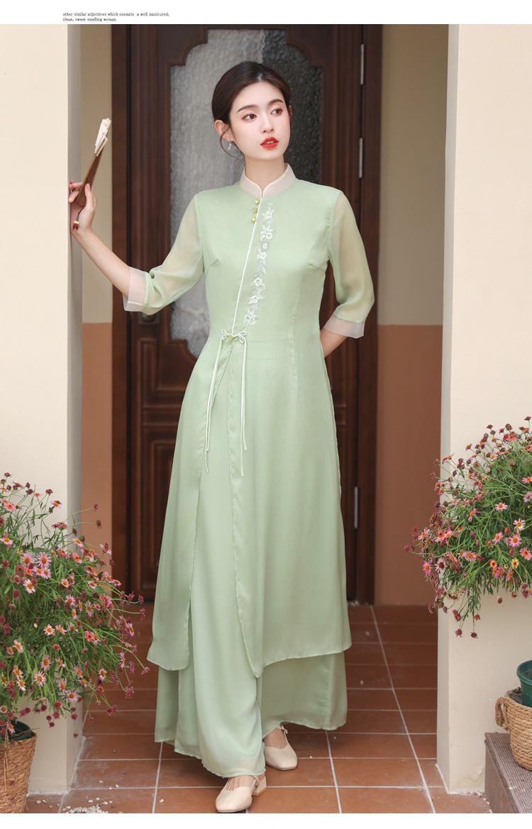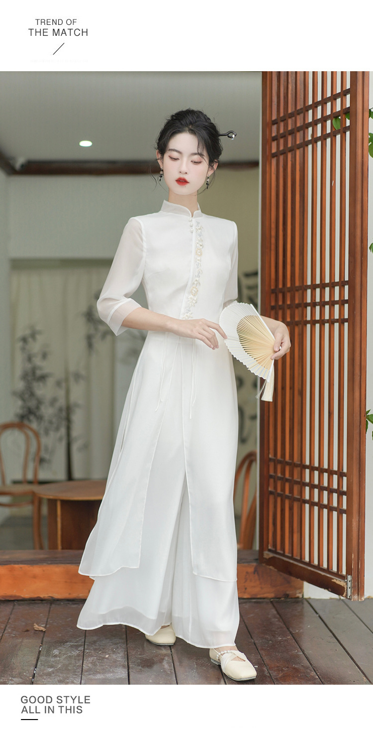 2023 여름 복고풍 새로운 중국 스타일 개선 치파오 빛 소녀의 차 세트 단색 7 점 슬리브 원피스 세트스토어 가기
