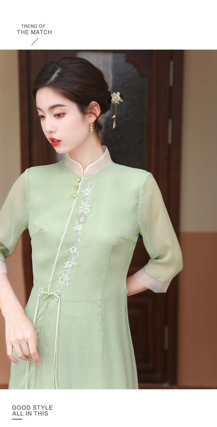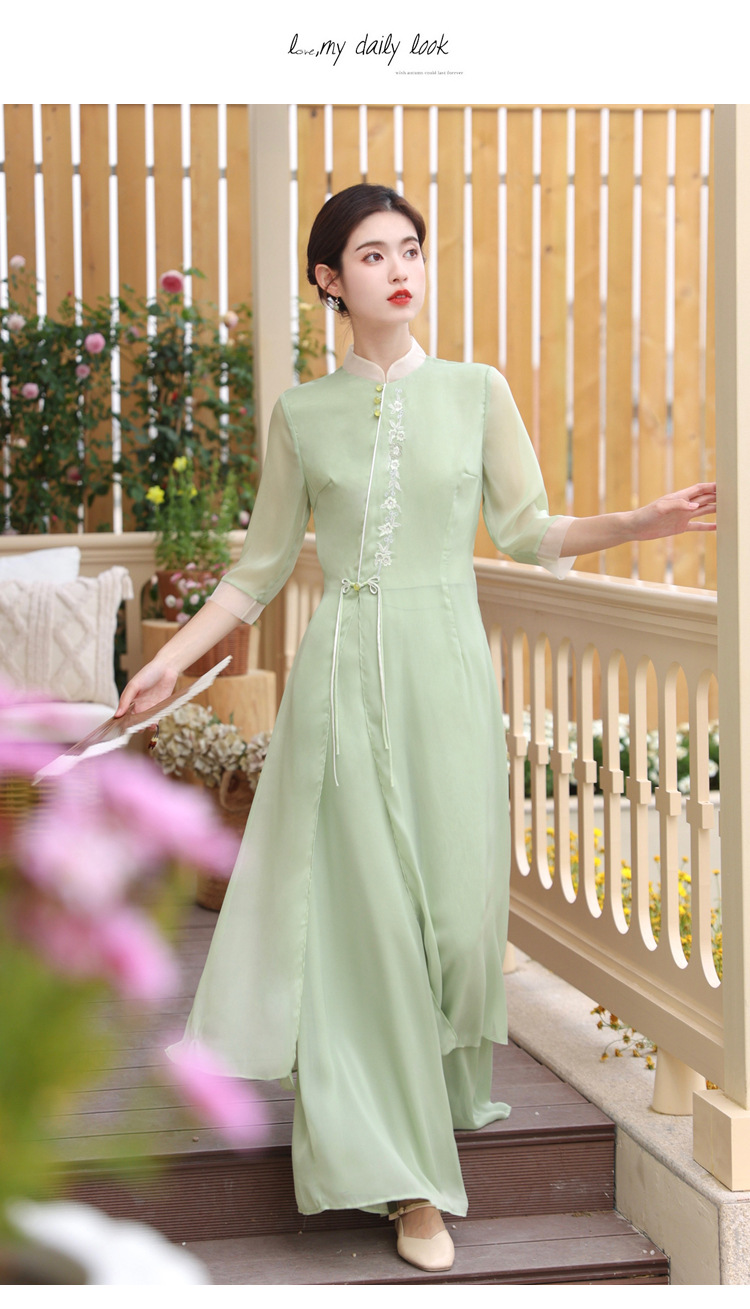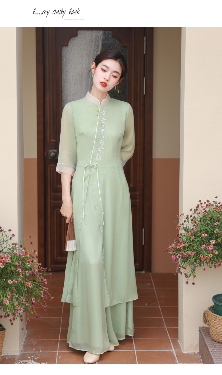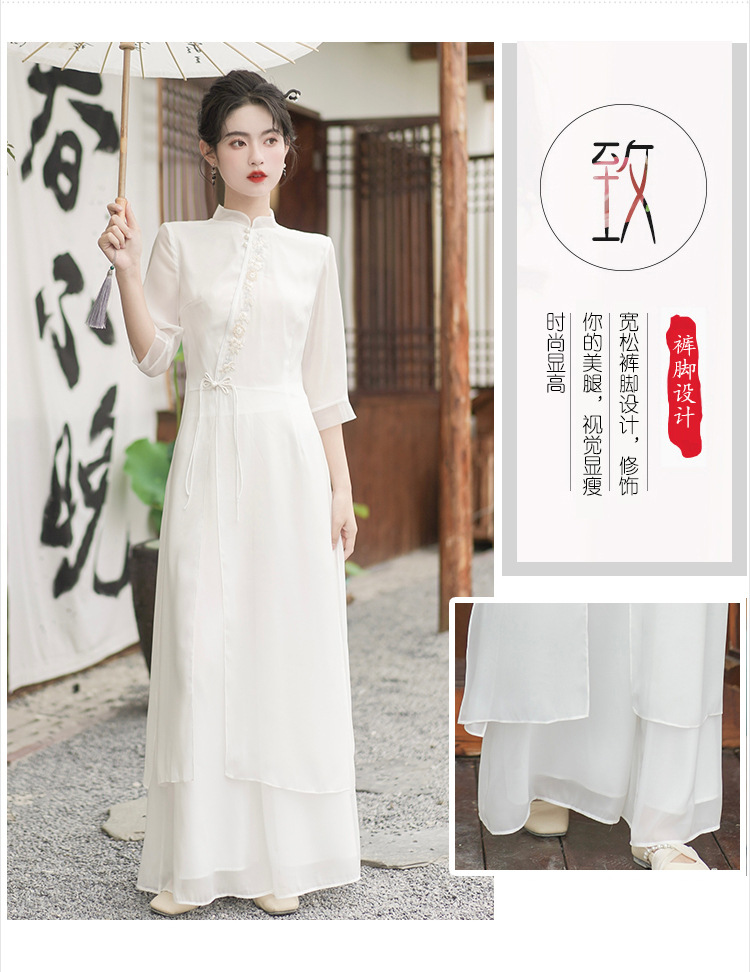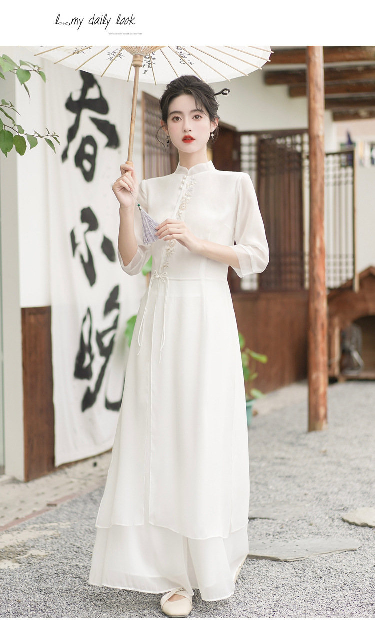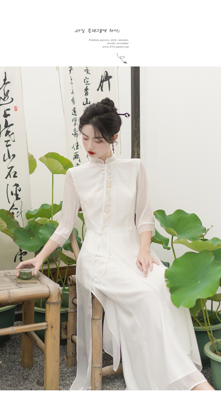 2023 여름 복고풍 새로운 중국 스타일 개선 치파오 빛 소녀의 차 세트 단색 7 점 슬리브 원피스 세트스토어 가기