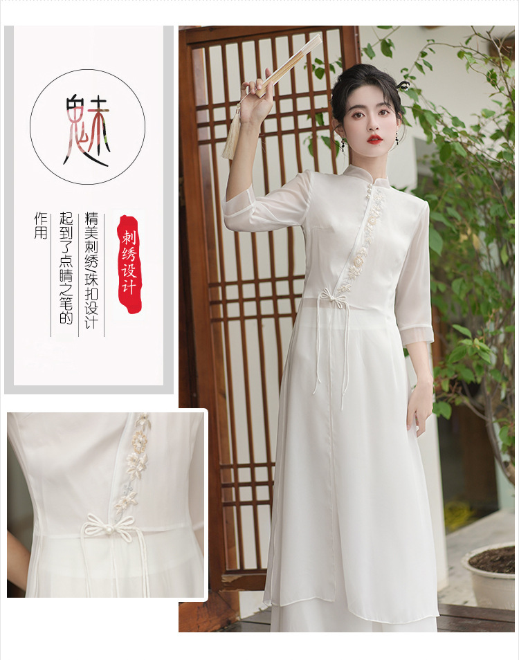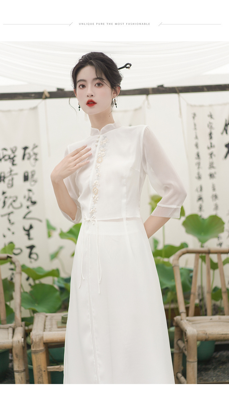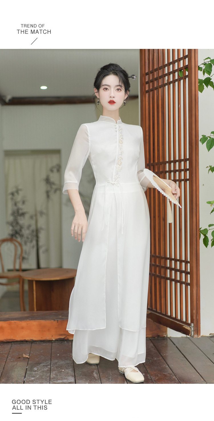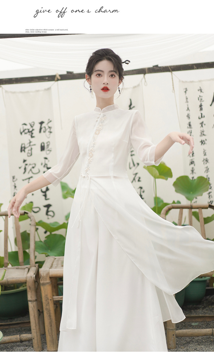 2023 여름 복고풍 새로운 중국 스타일 개선 치파오 빛 소녀의 차 세트 단색 7 점 슬리브 원피스 세트
