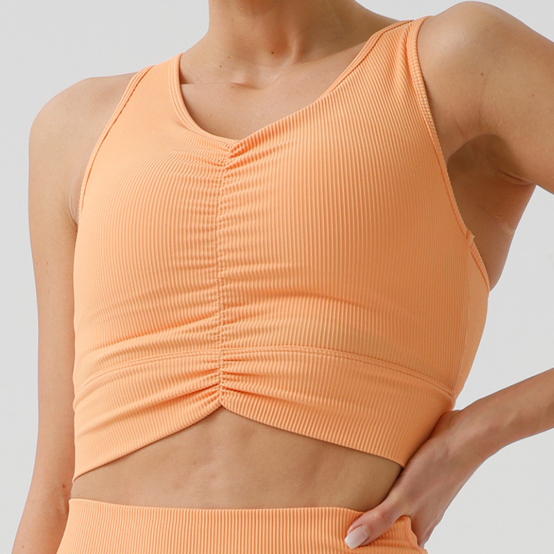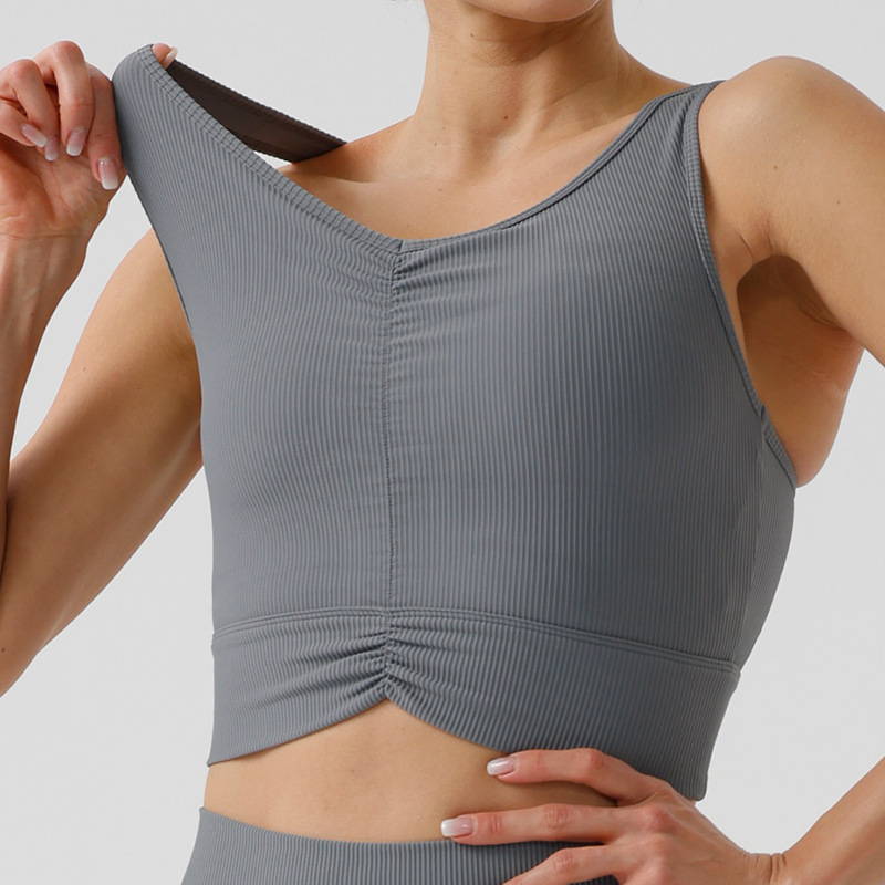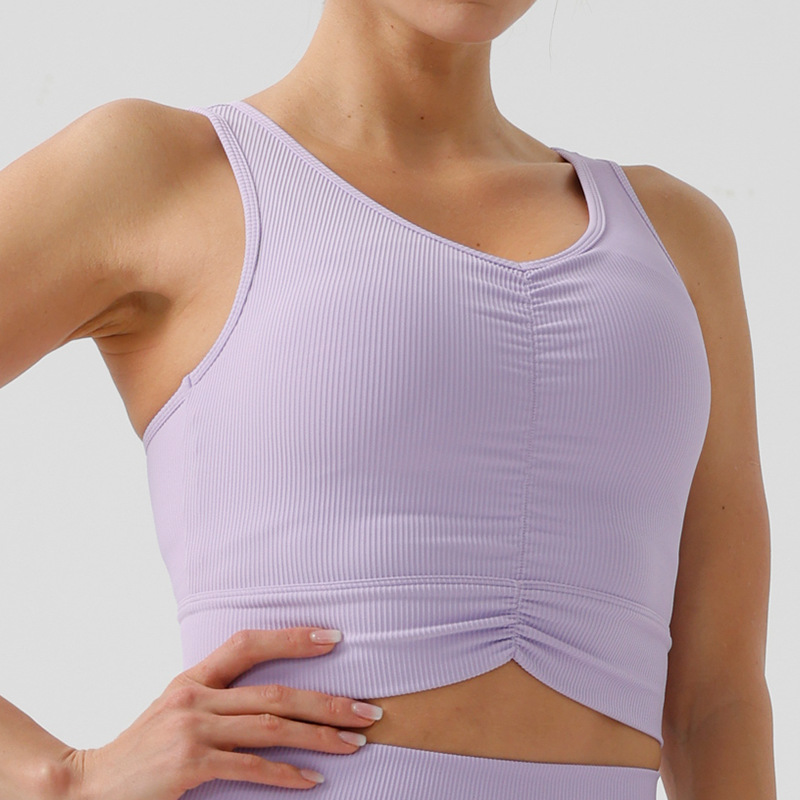 가슴 패드가 있는 친환경 크로스보더 스포츠 브라, 타이트한 백 디자인 요가 브라, 주름 장식 레이스 피트니스 스포츠 브라스토어 가기
